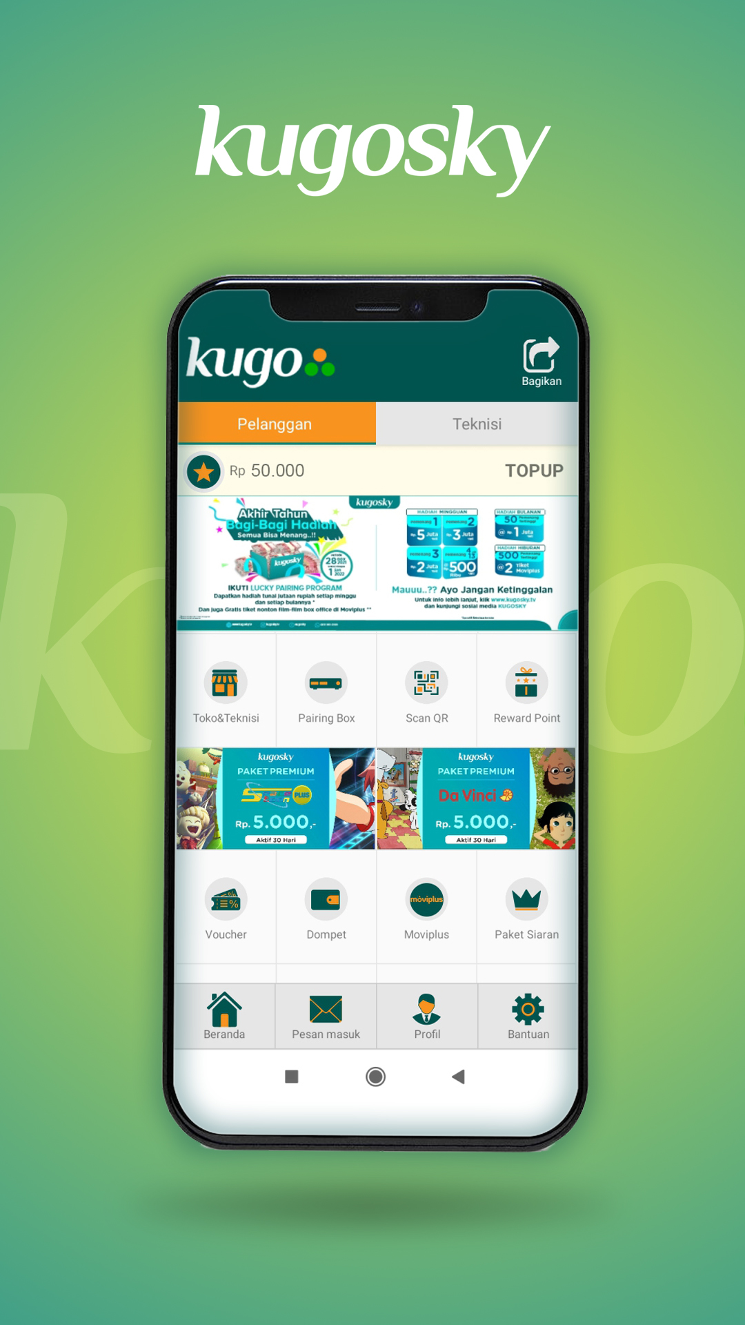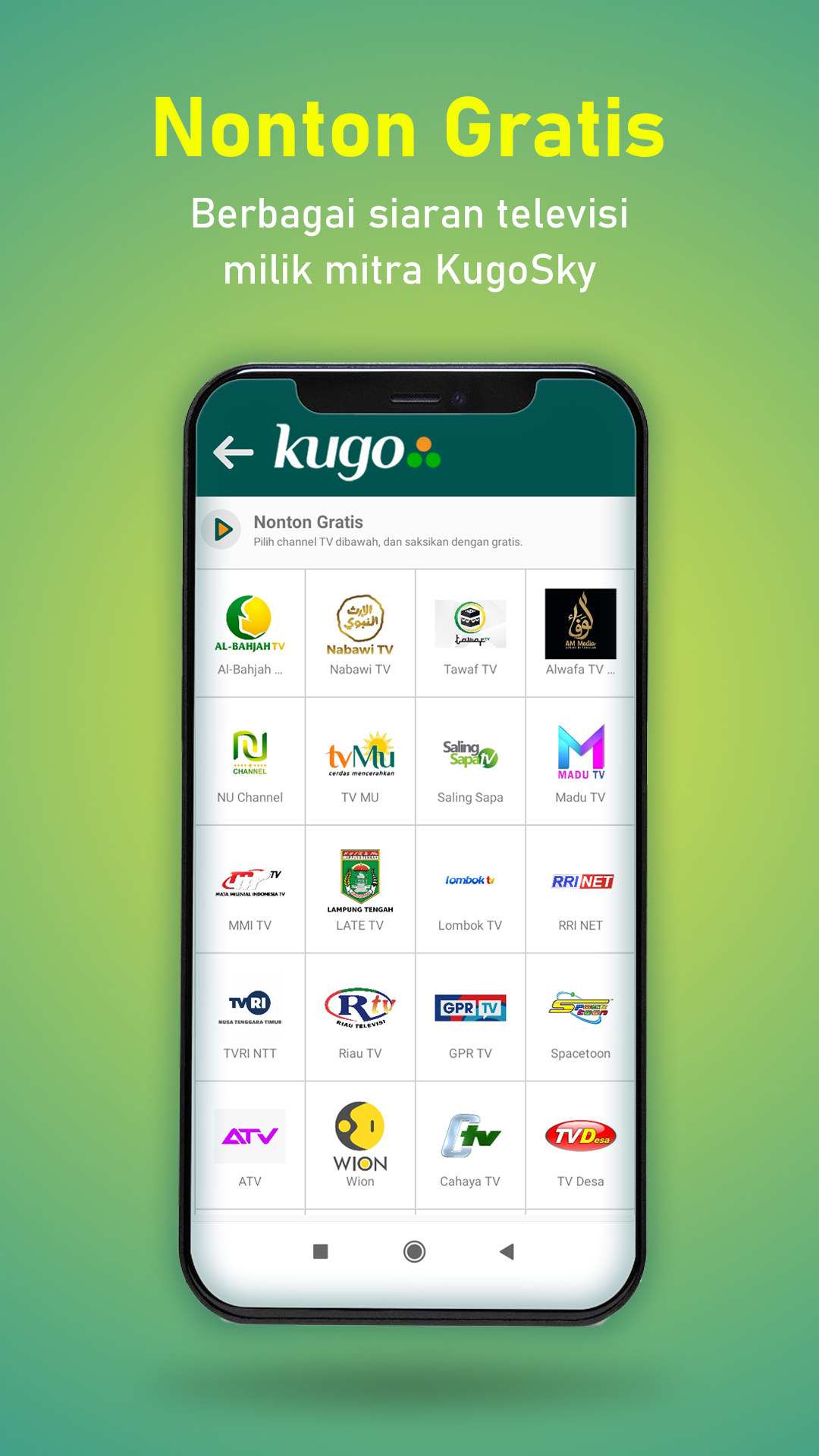 Dengan Aplikasi KUGO, kamu bisa nonton puluhan saluran TV Kostenlos. Selain itu, jika kamu tertarik untuk menggunakan TV Satelit KugoSky, kamu dapat mencari teknisi atau penjual perangkat parabola terdekat melalui aplikasi ini. Untuk menggunakan layanan TV Satelit KugoSky, kamu membutuhkan Antenne Parabel berukuran Mini-Dengan-Durchmesser 45-65 cm und STB/Receiver umum yang ada di pasaran. Berbagai saluran tv lokal, tematik und comunitas dapat disaksikan secara Gratis tanpa Iuran. Daftar saluran Kugosky: Maleo Channel, Pop Channel, Al Bahjah TV, NU (Nahdlatul Ulama) Channel, Muhammadiyah TV, Salingsapa, Tawaf TV, Nabawi TV, GPR TV, RIAU TV, TVRI NTT, AM TV, Madu TV, Spacetoon, ATV , Wion Channel, Cahaya TV, TV Desa, Garda TV, Riauraya TV, Sampit TV, Lombok TV, Jangkar TV, GBI TV, Riau Televisi und mehr.