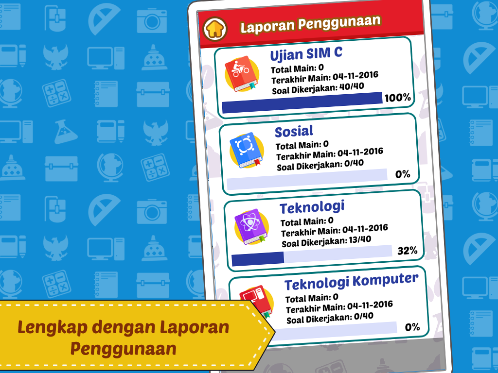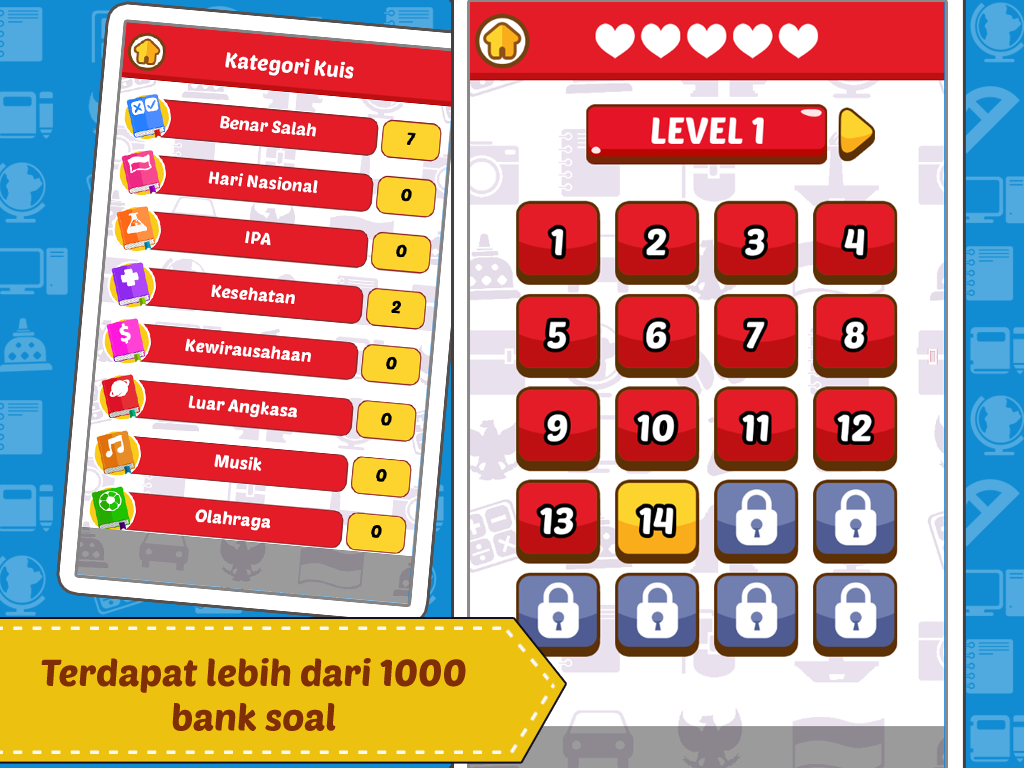 Indonesian Smart Quiz ist eine Lernspiel-App mit Tausenden von Fragen zu Allgemeinwissen und Schulfächern, mit denen Sie Ihr Indonesien-Wissen vertiefen können. Dieses Spiel bietet ein unterhaltsames Lernerlebnis – von Allgemeinwissen über Geschichte, Helden, Tourismus, Erfinder, Musik, Mathematik, Geographie, Sport, Physik, Indonesisch, Naturwissenschaften, Sozialkunde bis hin zu Logikrätseln. Diese App ist keine offizielle Regierungs-App und repräsentiert keine Bildungseinrichtung oder Regierungsbehörde. Alle Fragen in dieser App sind Übungs-/Lernfragen, die aus verschiedenen öffentlichen Quellen und Schulbüchern zusammengestellt wurden. ÜBUNGSFRAGEN-FUNKTIONEN: - Richtig/Falsch-Quiz - Nationalfeiertags-Quiz - Wissenschaftsquiz - Gesundheitsquiz - Unternehmertumsquiz - Weltraumquiz - Musikquiz - Sportquiz - Allgemeinwissensquiz - Geschichtsquiz - Führerscheinprüfungsvorbereitungsquiz - Sozialkundequiz - Technologie- & IKT-Quiz - Helden- & Erfinderquiz - Islamisches Religionsquiz UNTERHALTUNGSFUNKTIONEN - Basketball-Wurfspiel - Eichhörnchen-Springspiel SPIELFUNKTIONEN - 2-Spieler-Quizduell - Bestenliste & Erfolge - Spiellevel in der Cloud speichern ============== Über CERMAT ============== Cermat ist eine Quizreihe, die Prüfungsfragen auf ansprechende Weise präsentiert, damit Nutzer spielerisch lernen können, sie zu lösen. Es gab mehrere Serien der Cermat-Reihe (Smart-Quiz-Reihe), darunter: Grundschulquiz, Mittelschulquiz und Islamisches Quiz, Indonesisches Smart-Quiz.