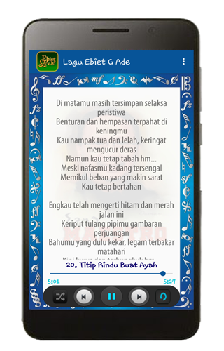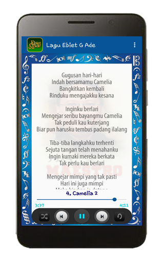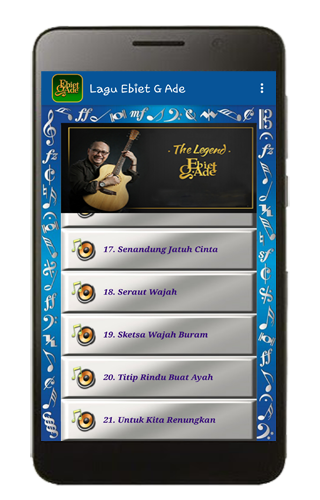 Abid Ghoffar bin Aboe Dja'far atau lebih dikenal dengan nama Ebiet G. Ade adalah seorang penyanyi dan penulis lagu berkewarganegaraan Indonesia. Ebiet dikenal dengan lagu-lagunya yang bertemakan alam dan duka derita kelompok tersisih. Lewat lagu-lagunya yang ber-genre balada, pada awal kariernya, ia memotret suasana kehidupan Indonesia pada akhir tahun 1970-an hingga sekarang. Tema lagunya beragam, tidak hanya tentang cinta, tetap ada juga lagu-lagu bertemakan alam, sosial-politik, bencana, religius, keluarga, dll. Sentuhan musiknya sempat mendorong pembaruan pada dunia musik pop Indonesia. Semua lagu ditulisnya sendiri, ia tidak pernah menyanyikan lagu yang diciptakan orang lain. Aplikasi lagu Ebiet G. Ade dilengkapi dengan lirik disetiap lagunya. Aplikasi ini dapat berjalan secara OFFLINE (tanpa membutuhkan internet), ditampilkan secara interaktif dengan gambar yang jelas sehingga memudahkan penggunanya, disajikan secara GRATIS dan dapat disimpan di MEMORY EXTERNAL. Daftar Koleksi Lagu Ebiet G. Ade : AKU INGIN PULANG BERITA KEPADA KAWAN CAMELIA 1 CAMELIA 2 CINTA SEBENING EMBUN CINTAKU KANDAS DI RERUMPUTAN ELEGI ESOK PAGI KALIAN DENGARKAN KELUHANKU KUPU KUPU KERTAS LAGU UNTUK SEBUAH NAMA MASIH ADA WAKTU MENJARING MATAHARI NYANYIAN RINDU NYANYIAN SUARA HATI REMBULAN MENANGIS SEBERKAS CINTA YANG SIRNA SENANDUNG JATUH CINTA SERAUT WAJAH SKETSA WAJAH BURAM TITIP RINDU BUAT AYAH UNTUK KITA RENUNGKAN Semoga dapat menghibur dengan aplikasi Lagu Ebiet G. Ade plus Lyric nya untuk kita semua. Aamiin... Dislaimer: Konten di dalam aplikasi merupakan hasil pencarian google, developer bukan pemilik sah konten dan hanya untuk hiburan saja. Apabila anda adalah pemilik sah konten silahkan hubungi developer untuk penghapusan konten. Kata Kunci : Koleksi Lagu Ebiet G. Ade, Lagu Ebiet G. Ade, Ebiet G. Ade, Lagu Ebiet G. Ade MP3, Ebiet G. Ade MP3, Camelia, Cinta Sebening Embun, Elegi Esok Pagi, Menjaring Matahari, Titip Rindu Buat Ayah.