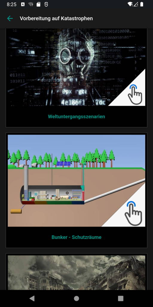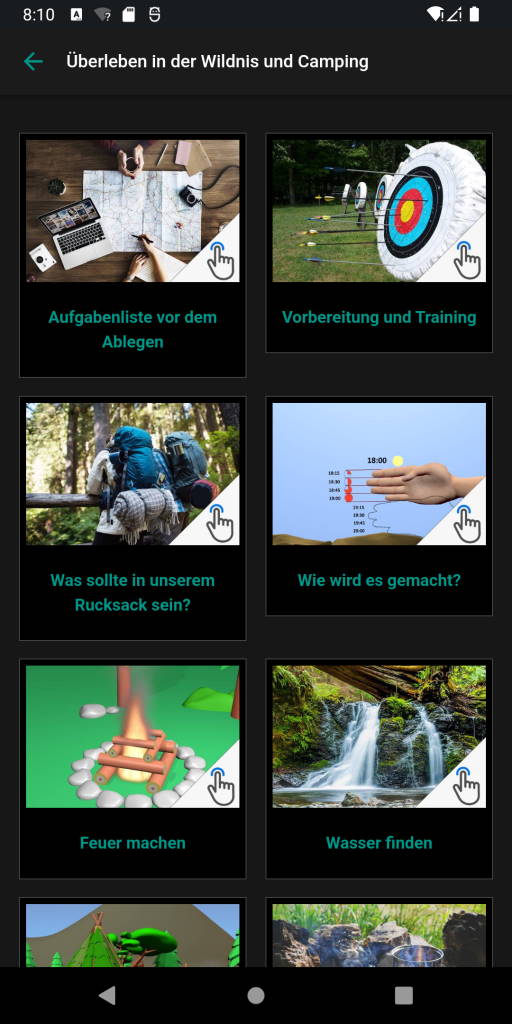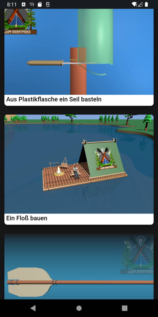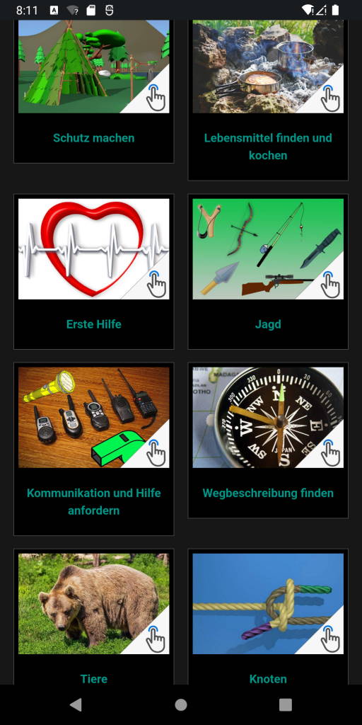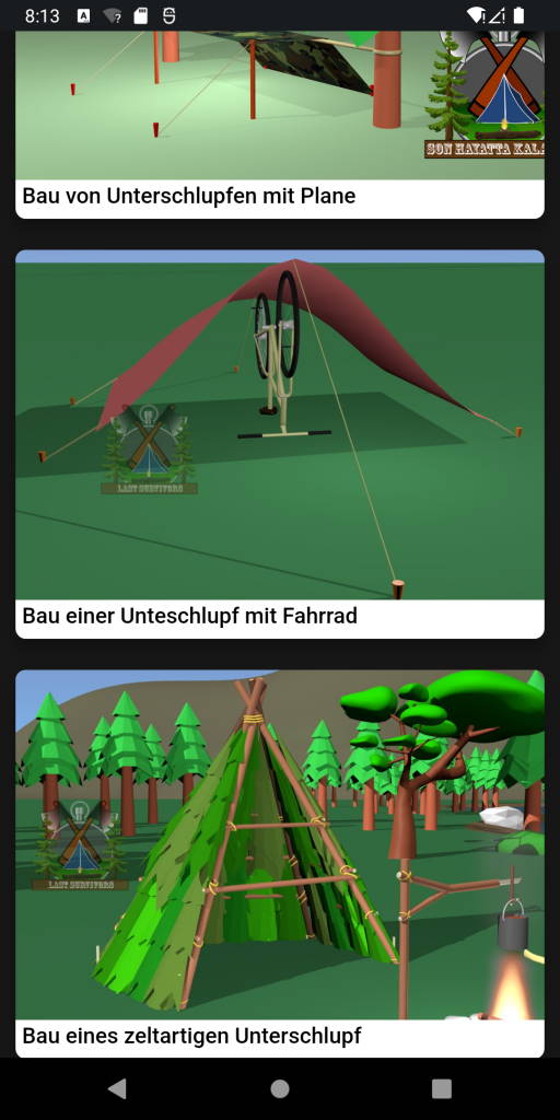 Überlebens-App; Diese Anwendung, die auf Ihrem Gerät ein Muss ist, erklärt in einfacher Sprache, wie Sie in verschiedenen Situationen auch ohne Internet überleben können. Wir sagen Ihnen, was vor und nach der Katastrophe nötig ist und sorgen dafür, dass Sie vorbereitet sind. Zu Beginn geben wir Ihnen die Informationen, die Sie sowohl für das Campen als auch für das Überleben in der Natur verwenden können. Diese; Es gibt viele Themen wie Feuer machen, Unterschlupf machen, Wasser finden, Nahrung finden, Richtung finden, animierte Knotentechniken, was man gegen Tierangriffe tun kann, Tierspuren, Jagen, Erste Hilfe und was in der Überlebensausrüstung enthalten sein sollte. Abgesehen davon gibt es verschiedene Informationen, die Ihnen Bequemlichkeit und Komfort bieten können. So schneiden Sie ab; Es gibt viele Informationen wie Leiter, Stuhl, Plastikseilherstellung, Floß- und Paddelherstellung, Leimherstellung, Seilherstellung aus Plastikflaschen. Leider nehmen Naturkatastrophen von Tag zu Tag zu. Deshalb erläutern wir die notwendigen Informationen zu Naturkatastrophen (Hochwasser, Erdbeben, Sturm...) und die Vorsichtsmaßnahmen, die Sie bei der Antragstellung treffen sollten.