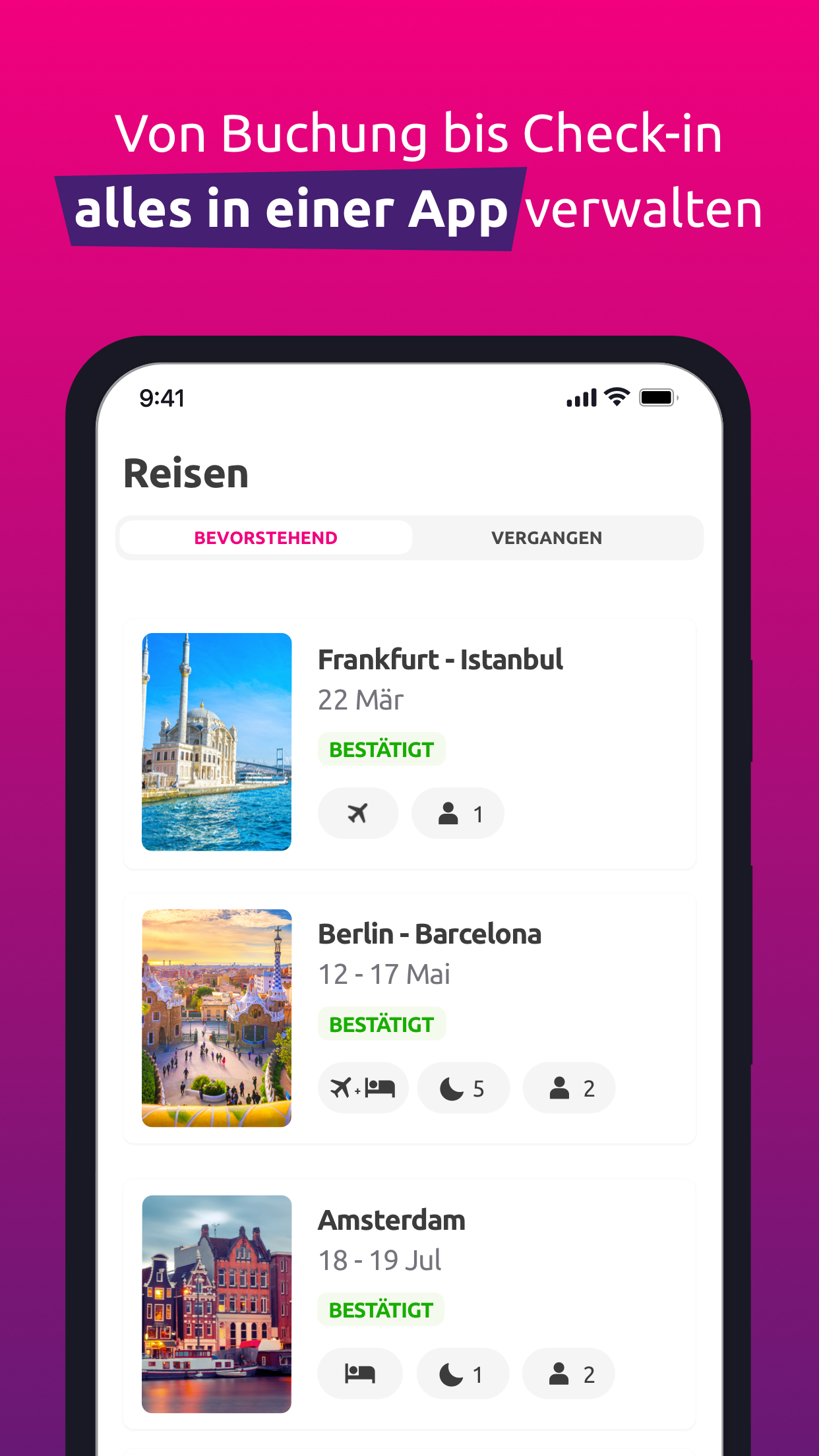 Suchen Sie nach Urlaubs- und Reiseangeboten für Hotels, Flüge und Flug + Hotel Deals? Wir haben das Richtige für Sie! Laden Sie die lastminute.com-App herunter und genießen Sie ein rundum sorgenfreies Reiseerlebnis – vom Buchungsvorgang bis zur Rückreise. Dank der neuen Funktionen unserer App sind die Flug- und Hotelsuche sowie das Buchen Ihrer Reisen jetzt einfacher denn je. Und nach der Buchung haben Sie alle Reisedetails jederzeit griffbereit. Was kann die lastminute.com-App bezüglich der Buchung von Flügen, Hotels, Urlaub und Pauschalreisen? - Entdecken Sie fantastische Angebote und Rabatte für günstige Flüge, Hotels und Pauschalreisen - Melden Sie sich an, um Buchungen noch schneller und einfacher vorzunehmen und von noch besseren Preisen zu profitieren - Entdecken Sie exklusive App-Preise: Es ist uns ein Vergnügen, Ihnen großartige Reiseangebote und Flug + Hotel Angebote herauszusuchen und wir versichern Ihnen, dass Sie unsere besten Preise in der App finden. Suchen Sie noch heute nach Ihrem nächsten Abenteuer: - Finden Sie die besten Last Minute Urlaubsdeals und buchen Sie sorgenfrei und zuverlässig - Entdecken Sie inspirierende neue Ideen für traumhafte Reiseziele auf unserer Startseite. Buchen Sie Ihre Reise schnell und bequem: - Alle Ihre Daten werden bequem in Ihrem Kundenkonto gespeichert. - Melden Sie sich an, um auf alle Buchungsdetails und Bordkarten zuzugreifen. Sie können auch die Daten Ihrer Mitreisenden abspeichern, um noch schneller zu buchen! Alles auf einen Blick: - Suchen Sie schnell nach Last Minute Flügen und günstigen Hotels - Sparen Sie noch mehr dank unserer Flug + Hotel Angebote und buchen Sie Ihre gesamte Reise ganz praktisch auf einmal - Sobald Sie Ihr nächstes Reiseziel gefunden haben, buchen Sie direkt in der App und behalten Sie alle Reisedetails im Blick. Genießen Sie einen einfachen und schnellen Zugriff auf alle Reiseinformationen: - Ihre Flugdaten, einschließlich Informationen zum Flughafen und Bordkarten - Informationen zu Ihrer Unterkunft, einschließlich Adresse und Buchungsdetails - Alle gebuchten Extras und Zusatzleistungen. Halten Sie Ihre Bordkarten griffbereit: - Mit unserer Check-in-Option haben Sie alles Notwendige direkt zur Hand, einschließlich der Bordkarten für Ihre Flüge - Sie können die Bordkarten außerdem zu Ihrem Wallet hinzufügen. Finden Sie Angebote für spontane Kurztrips: - Buchen Sie eine Reise, einen günstigen Flug oder ein Hotel schon für dieses Wochenende dank unserer Sonderangebote und Spezialpreise. Buchen Sie All Inclusive Reisen (inklusive günstigen Flügen und Hotel) im Nu: - Für einen wirklich entspannenden Urlaub sind unsere All Inclusive Angebote ideal - In einem All Inclusive Resort brauchen Sie sich nicht ums Essen oder Trinken sorgen, da alles bereits im Preis Ihres Urlaubs enthalten ist - Für noch mehr Preisvorteile und bequemes Reisen empfehlen wir unsere All Inclusive Flug + Hotel Angebote. Genießen Sie unsere besten Angebote und Schnäppchen für Ihren Urlaub, exklusive Preise und vorrangigen Kundenservice in der lastminute.com-App. Jetzt herunterladen und noch heute Ihr Flug + Hotel Angebot oder ein anderes Angebot für Ihre nächste Reise sichern!