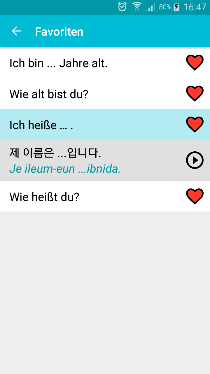 Lernen Koreanisch ist eine einfache app für jadermann, der schnell und einfach Koreanisch lernen möchte. Es ist ideal für Anfänger und Fortgeschrittene. Empfohlen für diejenigen, die nach Korea reisen wollen. Eigenschaften: * Hochwertige Übersetzungen von Muttersprachlern gemacht * Machen Sie Ihre eigenen Favoritenliste * Keine Internetverbindung benötigt