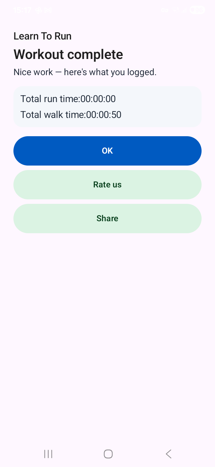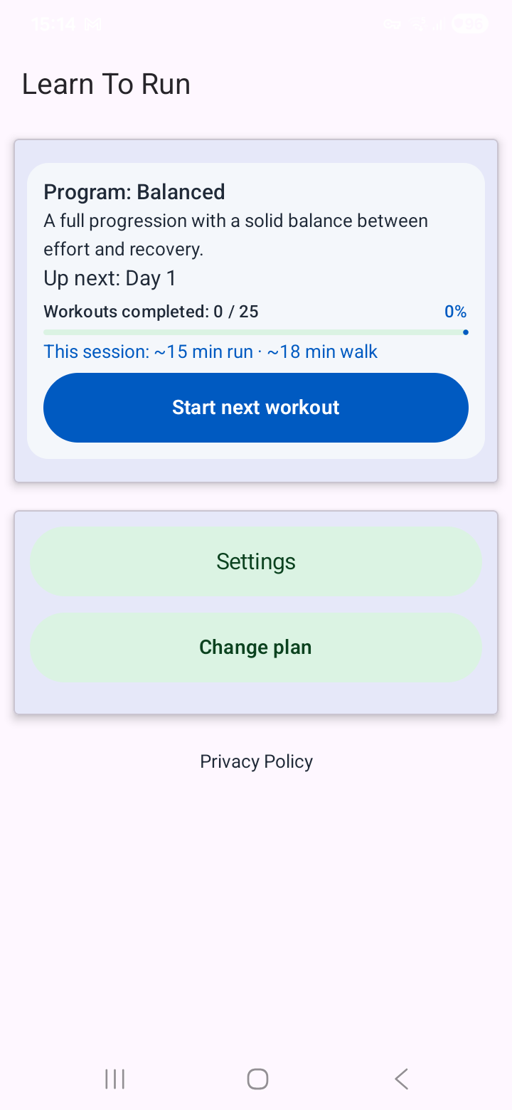 Learn to Run ist ein strukturiertes Geh-Lauf-Programm, das dich in nur 25 Tagen vom Nichts-Tun zur echten Laufeinheit bringt. Jeden Tag sagt dir die App genau, was zu tun ist: wann gehen, wann laufen und wie lange. Du drückst Start und folgst dem Rhythmus.