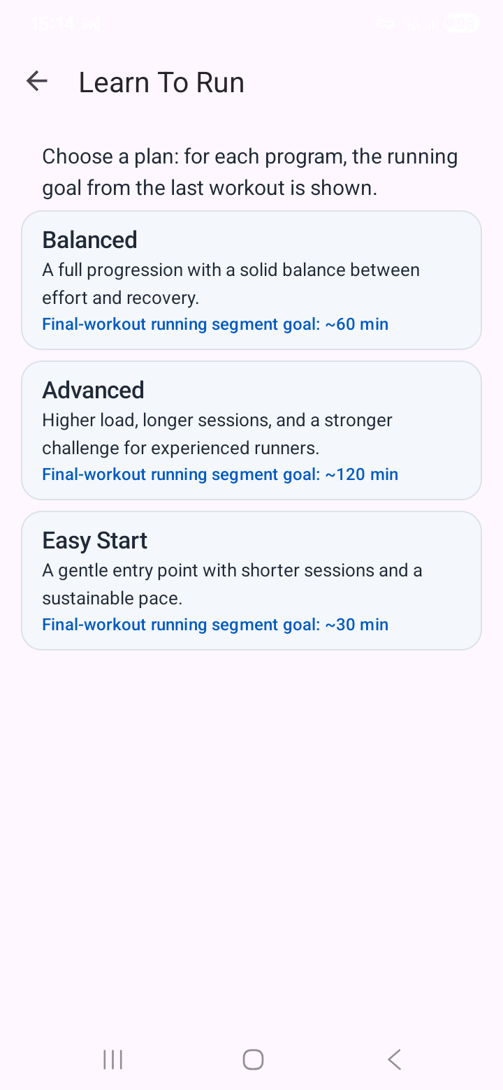 • Leichter Einstieg — Kurze, sanfte Einheiten für totale Anfänger. Höhepunkt: ~30 Min. Laufen.