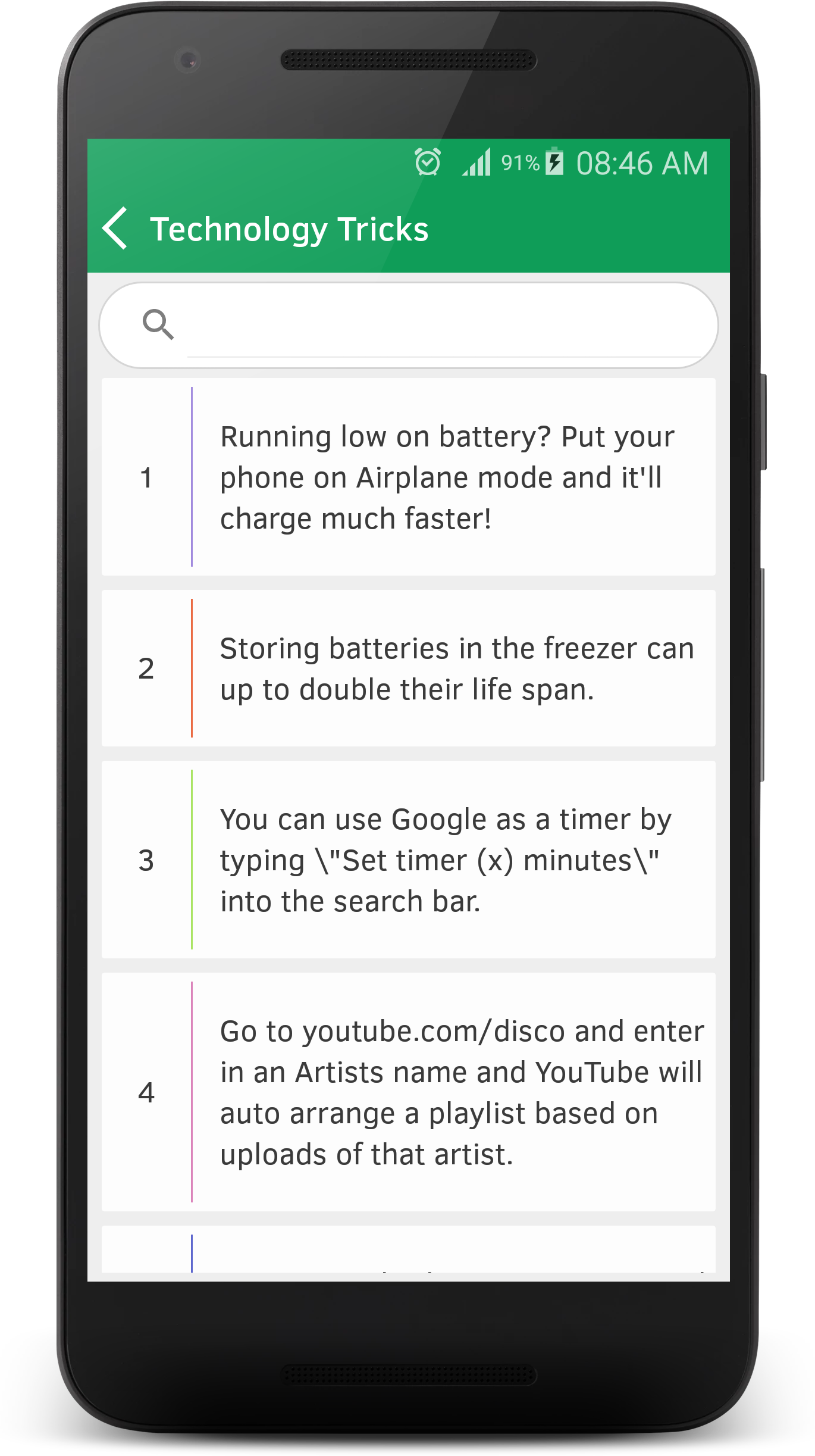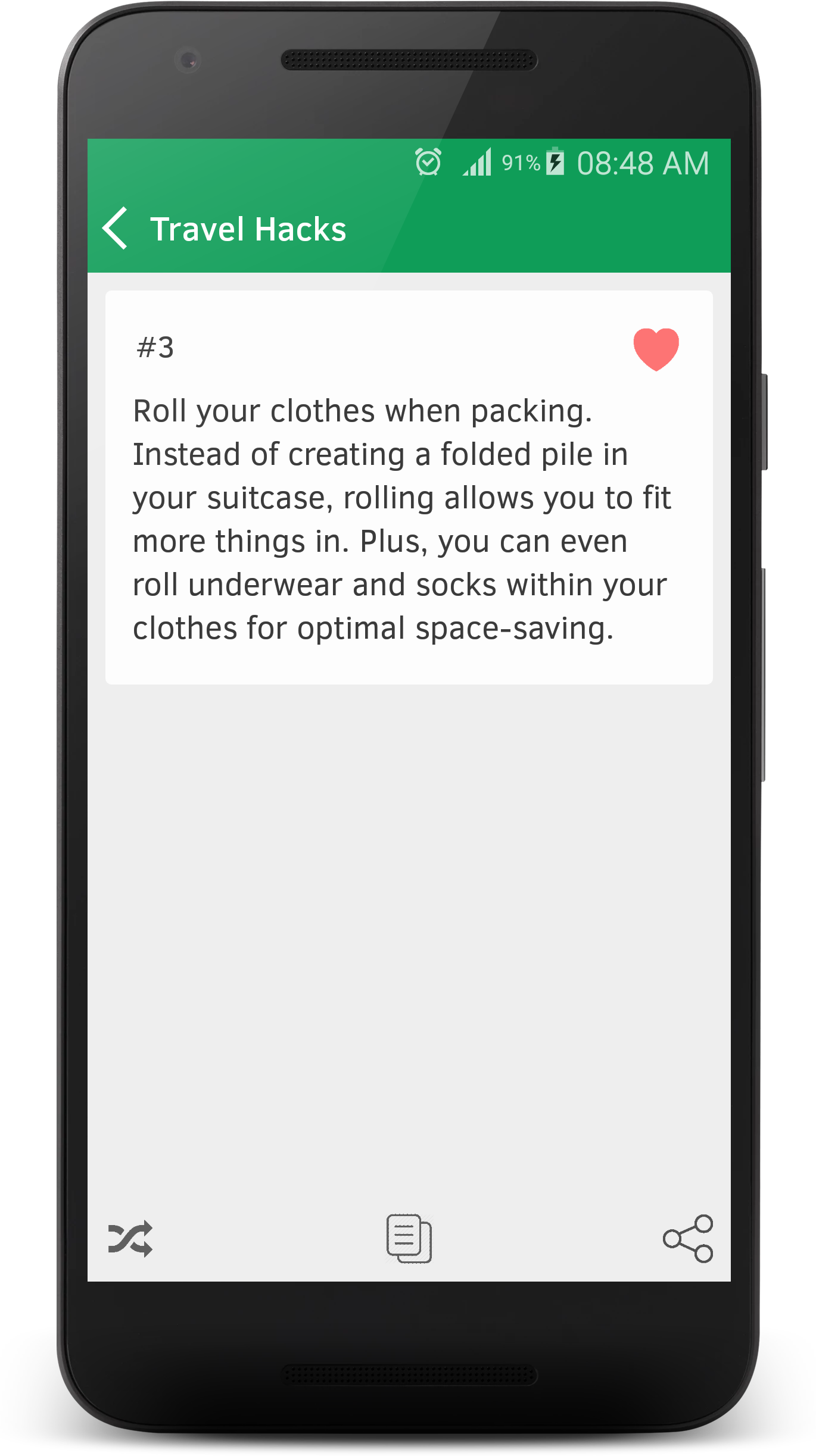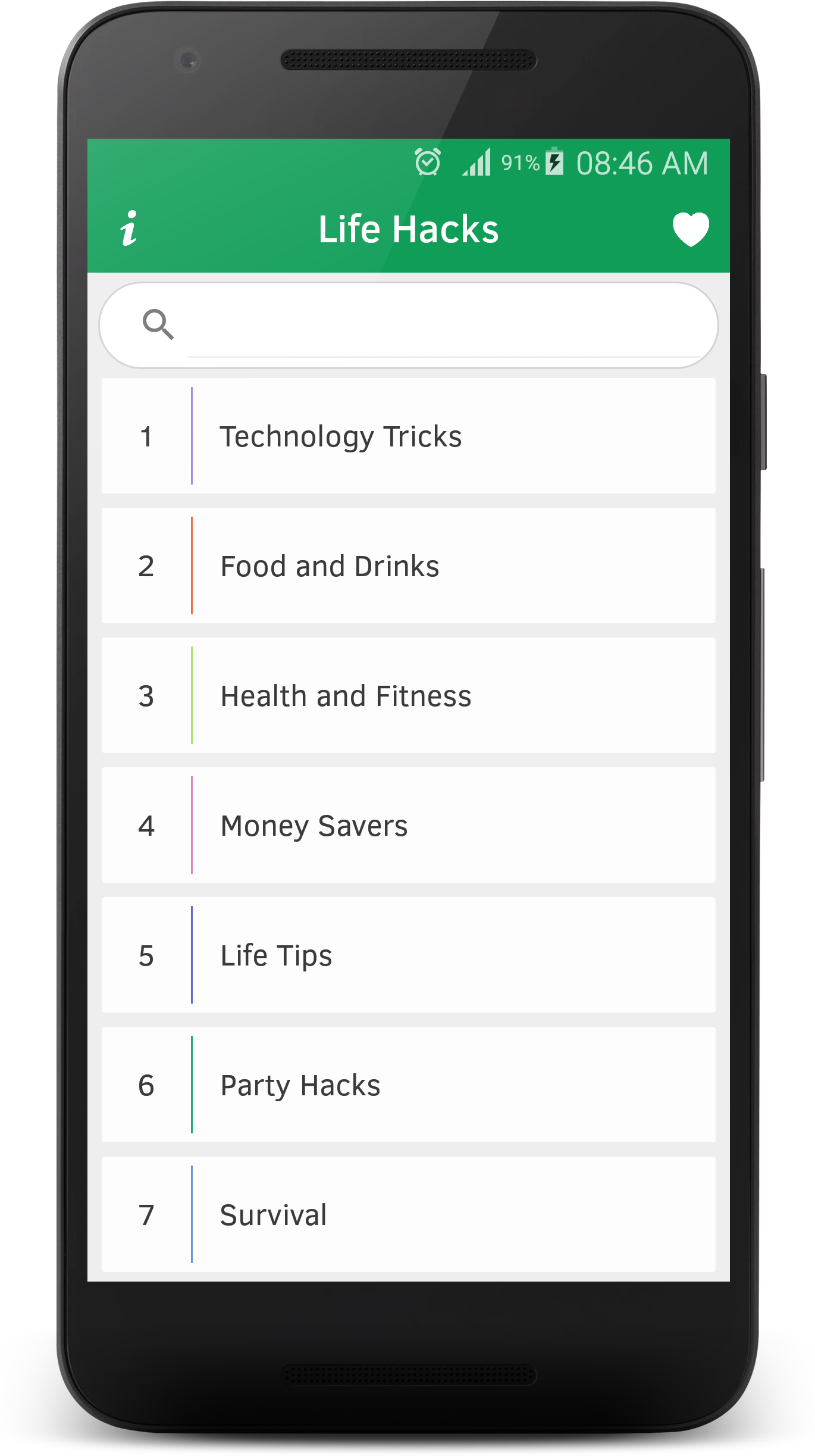 Life hacks, tips and tricks to optimize your life are available in this small app. It contains Life Tips & Tricks that are easy to share and save to favorites.