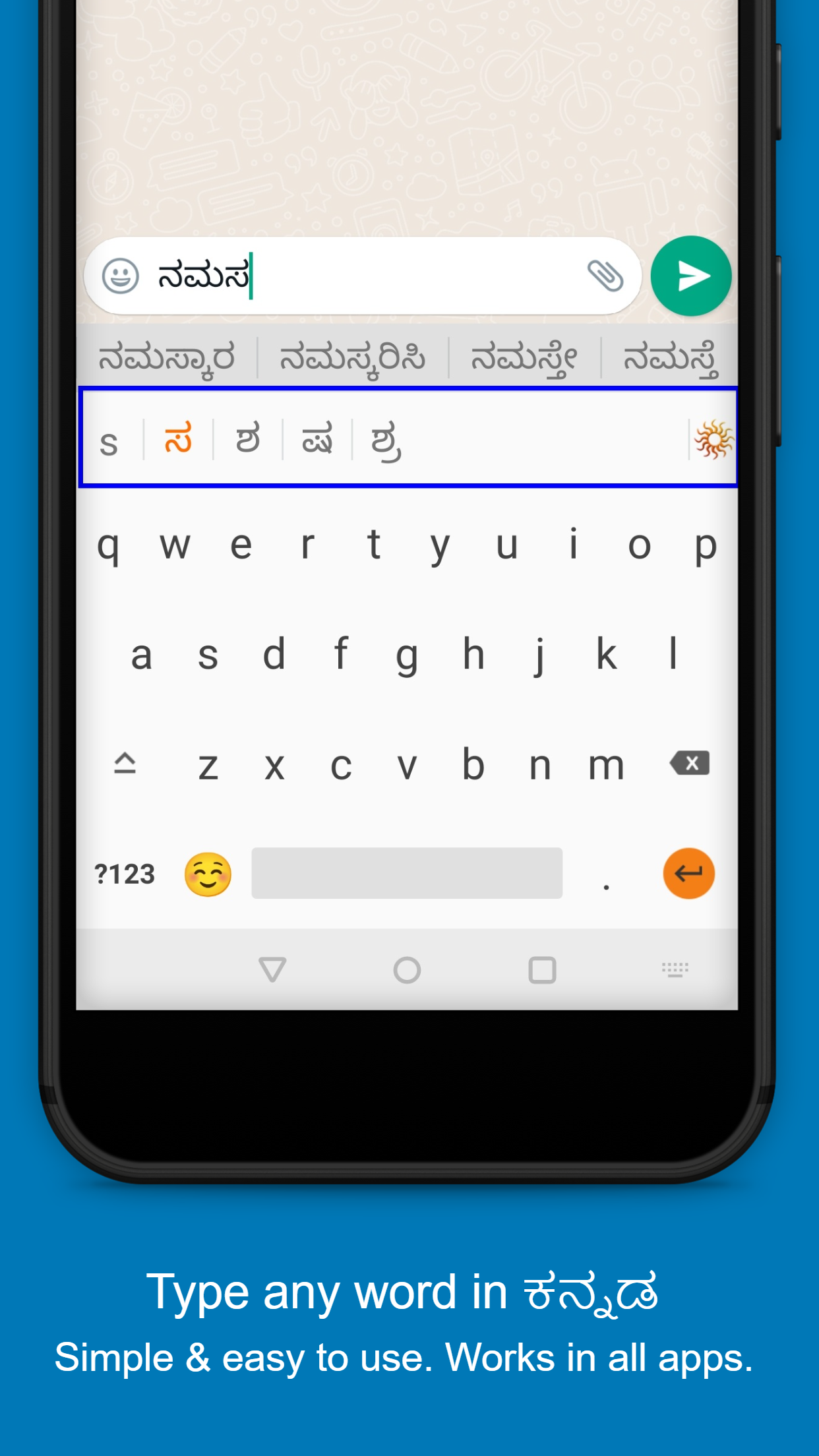 Works in all apps. Chat with your friends and family in your language - use Kannada on Whatsapp, Facebook or any other app.