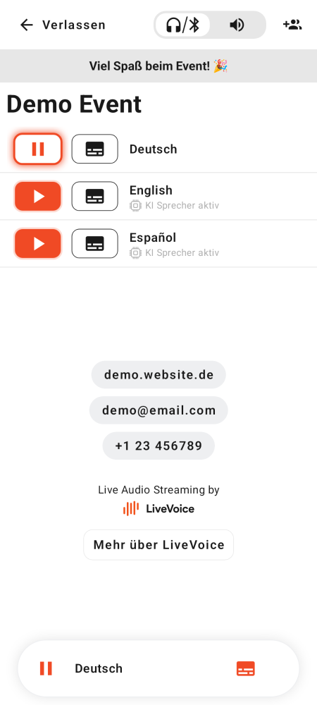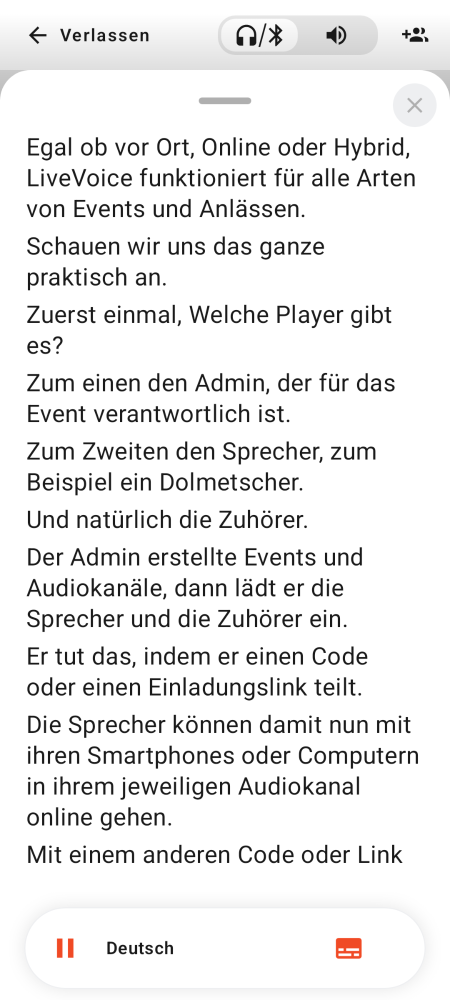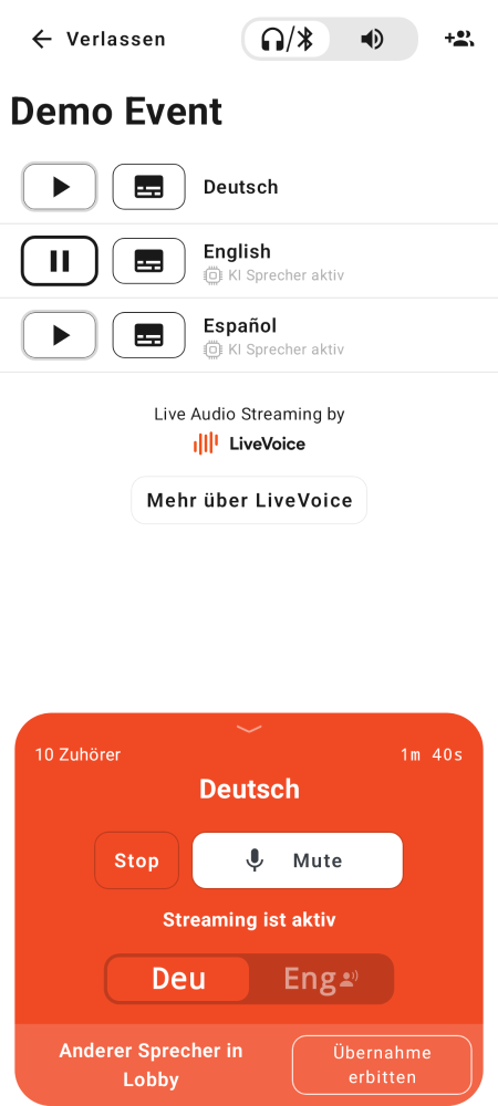 Smarte live Audioübertragung für Simultanübersetzung, Silent Events, Guided Tours und mehr. Einfach Invite Code eingeben, den du vom Veranstalter bekommst, gewünschten Audiokanal auswählen und zuhören. Wozu noch traditionelle, analoge Übertragungsanlagen für Dolmetschen & Co, wenn jeder sein Smartphone in der Tasche hat? LiveVoice.io ist die flexible Cloud-Lösung für Audio Streaming, für Silent Stages, Übersetzung auf kleinen und großen Konferenzen, Business Meetings, Kirchen und andere Events - und allen sonstigen Gelegenheiten in denen Live Voice Übertragung oder andere Audioübertragung gebraucht wird. Keine spezielle Hardware notwendig. Funktioniert via WLAN und Handynetz. Mit LiveVoice kannst du zum Zuhören einfach dein eigenes Smartphone & Kopfhörer mitbringen und schon geht's los. Sprecher (z.B. Dolmetscher) benötigen ebenfalls nur Smartphone oder Computer.