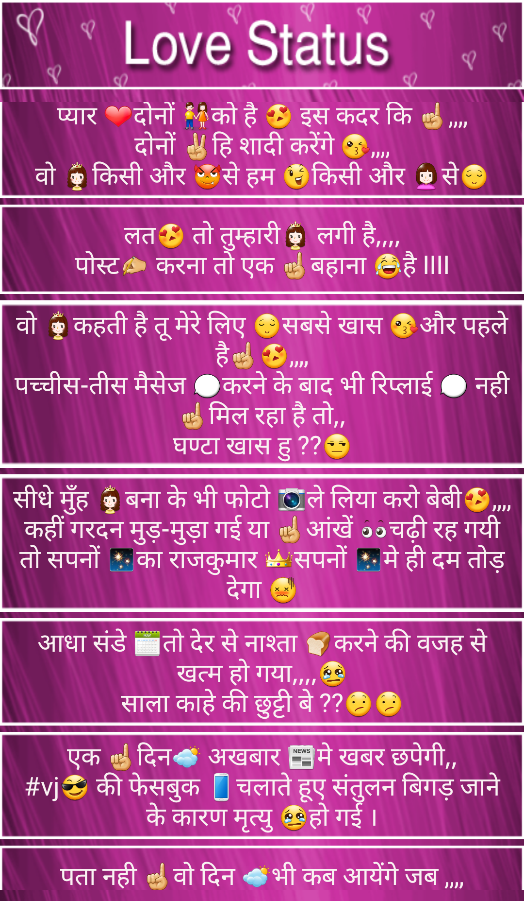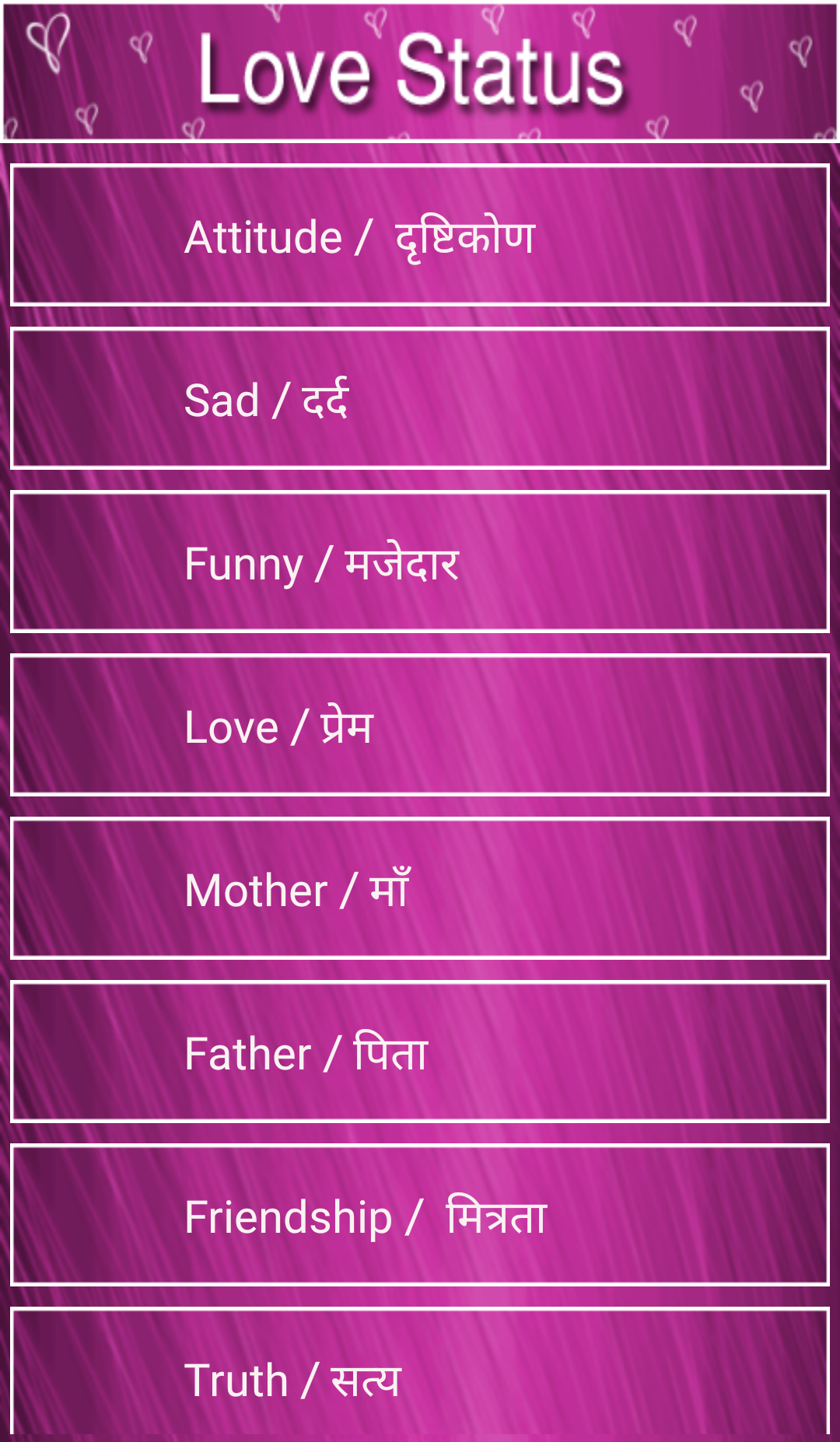 Love Status Love SMS Love Quotes Love Shayari Valentine day shayari 14 February sms Love shayari,SMS and Quotes 2019 Hindi Love Status Valentine Day Status status app for daily Love status All Latest Status 2019 application Provides all New And Latest Status. 2019 All Whatsaap Status application contain the latest status message. All Latest Status 2019 Application Is 100% offline, so no need of internet. User can daily set the new and unique status message in their Whatsaap and Facebook and other Social Sites. Independence day status Janmashtami Status All Latest Status 2019 Latest status 2019 Whatsapp Status All Miss You Whatsapp Status Facebook Status All Love Status Whatsapp New Status DP and Status Video Status Shiva status Mahashivratri Status Mahakal Status Mahadev Status Music Status 2019 Dp and Status Hindi Status 2019 Attitude status Whatsapp Royal Status and Shayari Love status friends status Hindi Love Status, Friendship status, Funny Status, Romantic Status, Inspiring status in Hindi, Good Morning status, Good Night Status, Attitude status in Hindi, Status for groups chat, Birthday Status, Break up Status Hindi, Love SMS Status, Emotional Status Engagement Status Exam Status Flirt Status Girls & Boys Status Good Luck Status Hello Jio Status Insult Status Kiss Status Life Status Love Jio Status Missing You Status Motivational Status Naughty Status Nice Status Relationships Status New Year Status Shayari Navratri status, Diwali status, Happy new year status, Christmas quote, Holi status, Poetry Festival, Woodstock rock festival, Wine Festival etc. Valentine status Christmas status Republic day status kite status Uttrayan status Makarsankranti Status Rose Day status Hug day status kiss day status proposed day status chocolate day status Teddy Day status Promise day status Rose Day Shayari Hug day Shayari kiss day Shayari proposed day Shayari chocolate day Shayari Teddy Day Shayari Promise day Shayari New Shayari 2019 New Shayari new status 2019 new status English Attitude Status Gujarati Attitude Status Tamil Attitude Status Marathi Attitude Status Bangali attitude status Latest whatsaap status and Shayari 10000+ has a huge set of messages and lovable shayari and social quotes Hindi Status 2019 Hindi Love Status Hindi Attitude Status Hindi Friends Status Hindi Funny Status Hindi Sad Status Hindi Mother Status Hindi New Year Status Hindi Diwali Status Hindi Truth Status Hindi Life Status Royal Status Success Status Time Status Shiva Status God Status Gujarati Status 2019 Gujarati Love Status Gujarati Attitude Status Gujarati Friends Status Gujarati Funny Status Gujarati Sad Status Gujarati Mother Status Gujarati New Year Status Gujarati Diwali Status Gujarati Truth Status Gujarati Life Status English Status 2019 English Love Status English Attitude Status English Friends Status English Funny Status English Sad Status English Mother Status English New Year Status English Diwali Status English Truth Status English Life Status Marathi Status 2019 Marathi Love Status Marathi Attitude Status Marathi Friends Status Marathi Funny Status Marathi Sad Status Marathi Mother Status Marathi New Year Status Marathi Diwali Status Marathi Truth Status Marathi Life Status Bangla Status 2019 Bangla Love Status Bangla Attitude Status Bangla Friends Status Bangla Funny Status Bangla Sad Status Bangla Mother Status Bangla New Year Status Bangla Diwali Status Bangla Truth Status Bangla Life Status Tamil Status 2019 Tamil Love Status Tamil Attitude Status Tamil Friends Status Tamil Funny Status Tamil Sad Status Tamil Mother Status Hindi New Year Status Tamil Diwali Status Tamil Truth Status Tamil Life Status All In One Status provide in All Latest Status 2019 application Thank You For Downloading... Give Valuable Feedback