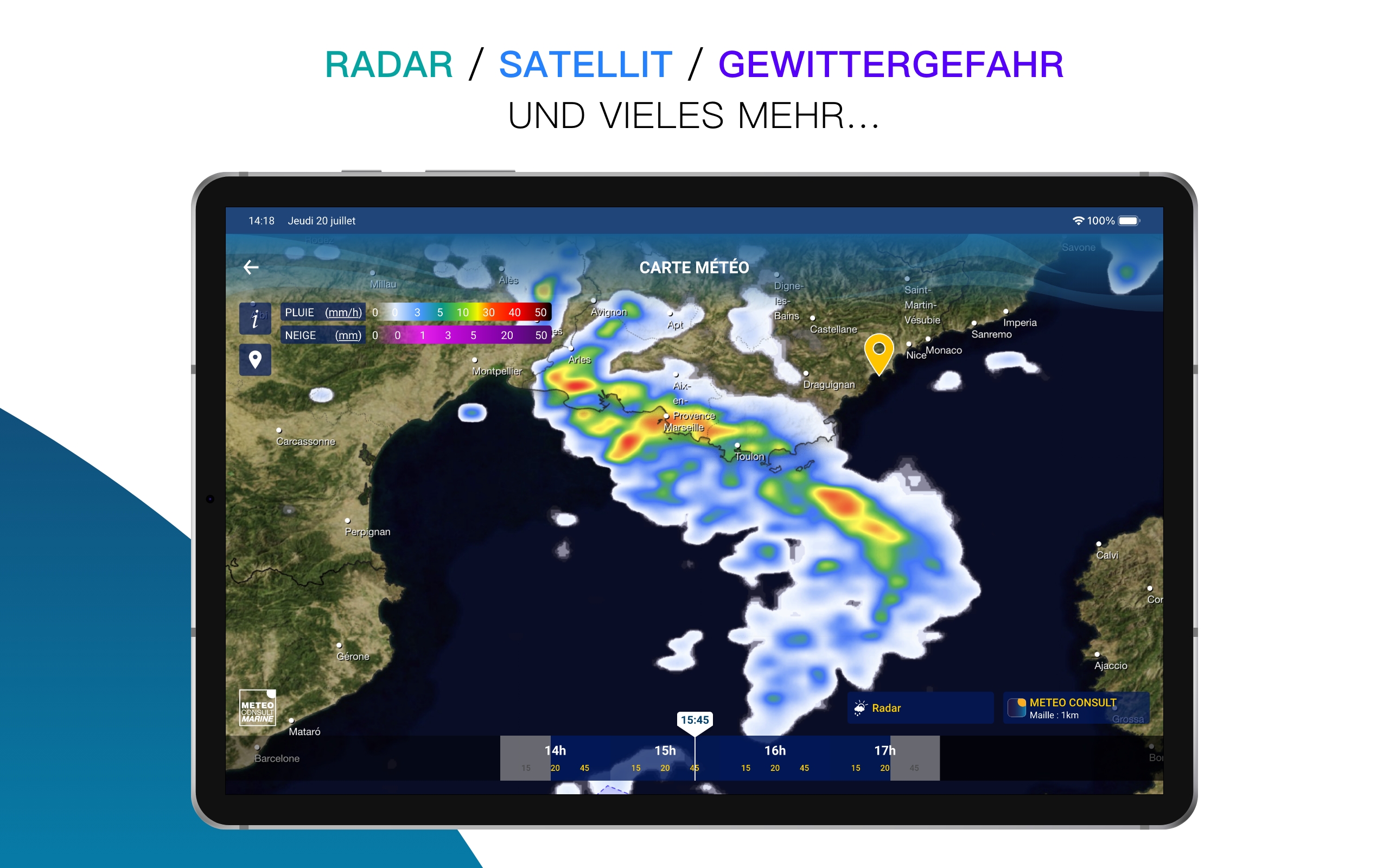 Erweiterte Abdeckung unseres hochauflösenden Modells Das 1-km-METEO-CONSULT-Modell wird jetzt standardmäßig auf der interaktiven Karte angezeigt – für noch genauere Vorhersagen. Mit der erweiterten Modellabdeckung profitieren Sie nun in weiten Teilen Europas von dieser hohen Auflösung. In den Hafenberichten führt jetzt ein direkter Link zur Bloc-Marine-App, um alle praktischen Informationen zum Hafen abzurufen. Laden Sie jetzt die neueste Version der App herunter!