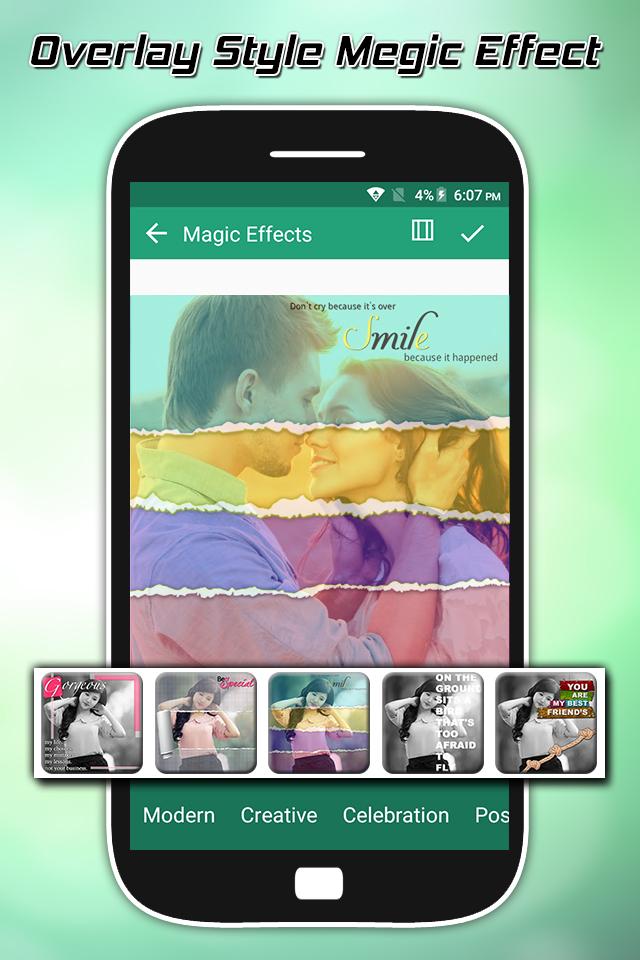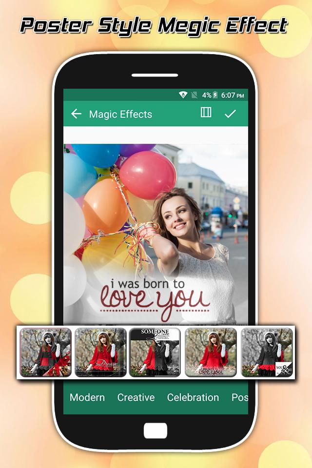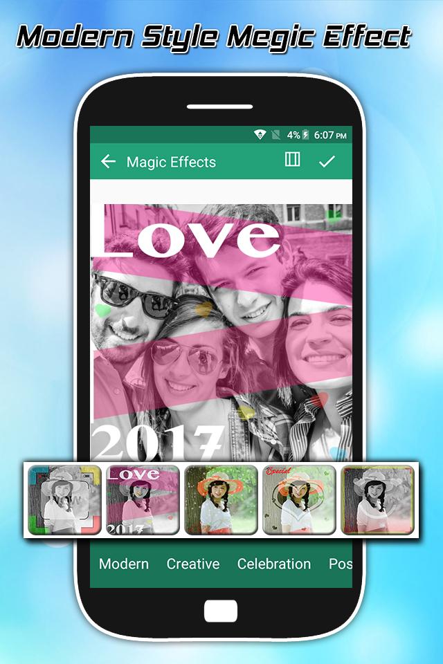 Magic Effects is a powerful, easy to use, free photo editor and collage maker. Photo Editor is the ideal choice for creating beautiful photo edits and awesome collages, all with just a few taps or swipes. Magic Effects Photo Editor is an effective photo editor with some stunning photo effects and various photo editing options. Apply different photo effects like Bokeh effects, Grunge effects, vintage effects to give your pic, an appealing look like never before using this photo editor. Magic Effects Photo Editor is the best app to edit your photos with great photo effects. This app will provide your image with cool photo effects. You can create unique and awesome effects for your photos. Magic Effects Photo Editor is application professional photo editor and photo effects, with a simple interface and easy to use but provide more powerful tools. It will create wonderful photo with high definition and better with " Magic Effects Photo Editor ", you can collage photo grid styles with 1 to 9 slots photo with more than 150 grid styles. Magic Effects Photo Editor is a powerful photo maker to provide the colorful photo and black and white effect for you . You can make your photo be popular and get more like with your friend. Magic Effects Photo Editor offers photo frames with different genres like fun, baby, love, flower, wedding, men, beach, billboard, nature, etc. Magic Effects Photo Editor have number of attractive effects that make your photo more impressive . for improving your photography you have to use various kind of effects from Magic Effects Photo Editor that gives new look to your photo. Magic Effects Photo Editor provides effects and design professional will give you the best photo editor way and photo effects way. Magic Effects Photo Editor Photo Maker contain a variety of Mug Color Splash Effects and Color Filter, you only need choose a image and we will make your image look creative in seconds without using a professional editor. ★ Features: ★ - Simple and clean UI. - Perfect selfie camera to use. - One tap to transform. - Plenty of art blending & cartoon & sketch filters. - Share, show, make magic pictures Top Amazing Feature: ►Magic Effects Photo Editor ► Beautiful photo frames ► Draw and add customized text ► Create your own memes ► One-tap auto enhance ► Magical photo effects ► Loads of fun stickers ► Magical tools to adjust brightness, contrast, color temperature, and saturation ► Beauty tools: fix redeye, remove blemishes and whiten teeth ► Sharpen or blur pictures ► Color temperature measure ► Enhance photo with Color balance ► Crop, rotate, and straighten your photo ► Fun 100+ Sticker ► Rich Color Splash effects ► Change focus with Tilt Shift Thanks for Installing “Magic Effects - Photo Editor”Application. Have More Fun Using It and please Remember that If you Have Any Suggestions for improvement, just Send us a Message. We read every Email and are Happy to reply… If you like this app than don’t forget to give rate & review also… Thanks for your support…