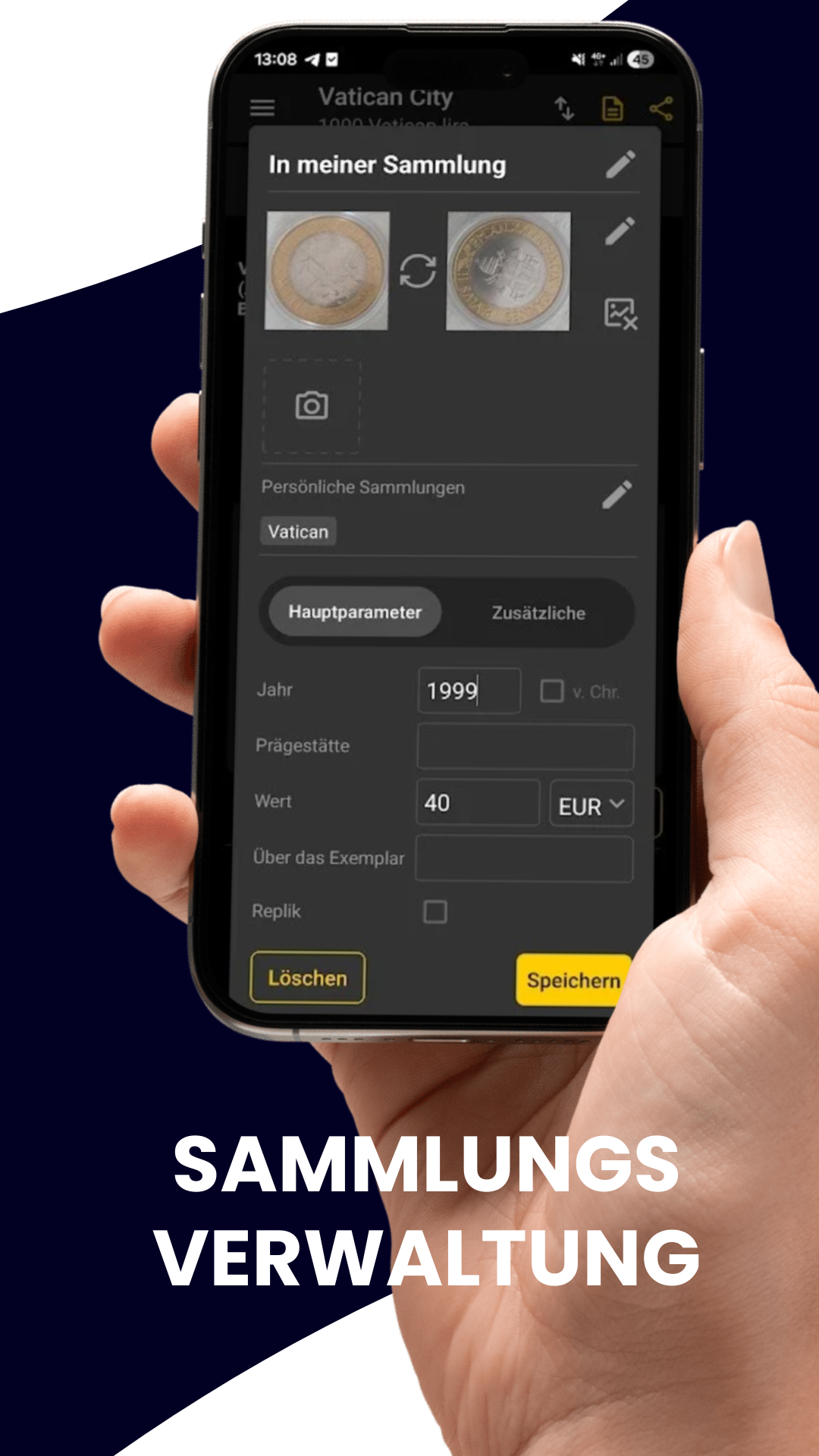 - Speichern Sie Fotos von Münzen, Banknoten und Jetons in hoher Qualität.