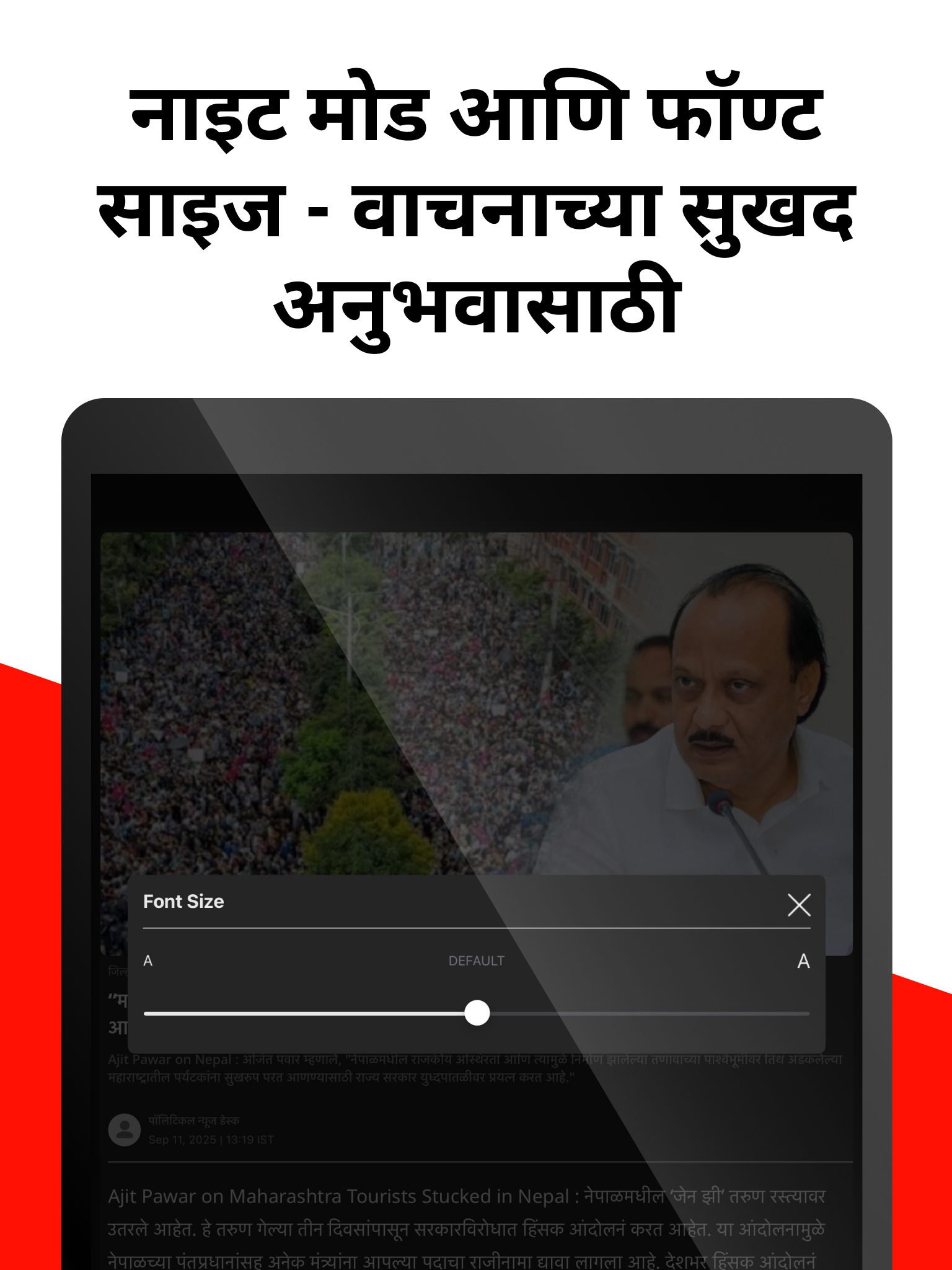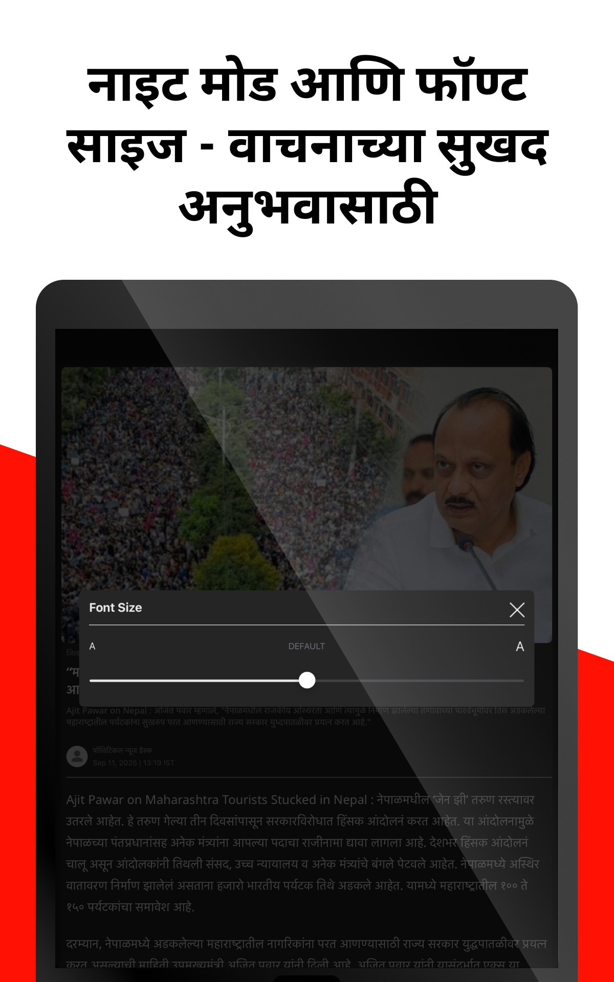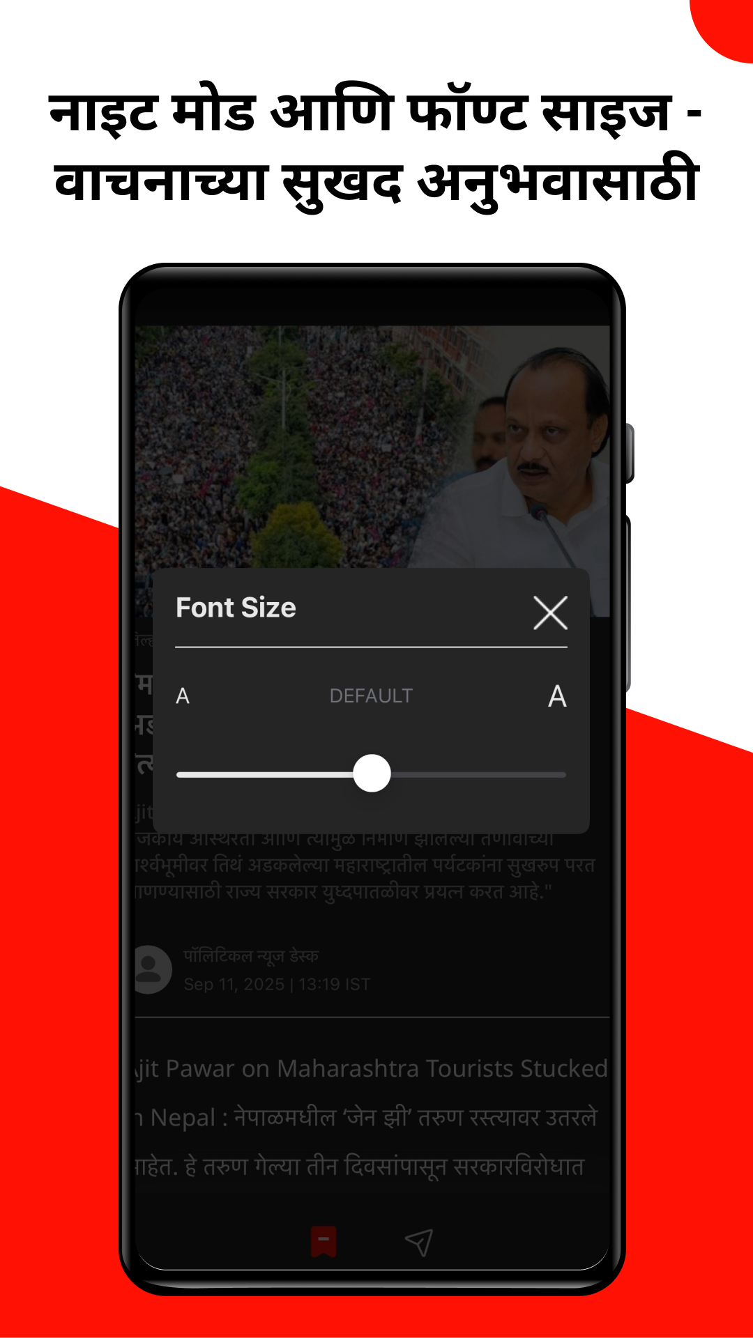 ◉नाइट मोड आणि फॉन्ट - तुमच्या डोळ्यांवरील ताण कमी करण्यासाठी लेख वाचताना डार्क थीम निवडा. तसेचचचताना सुखकर असा फॉन्टचा आकार निवडा