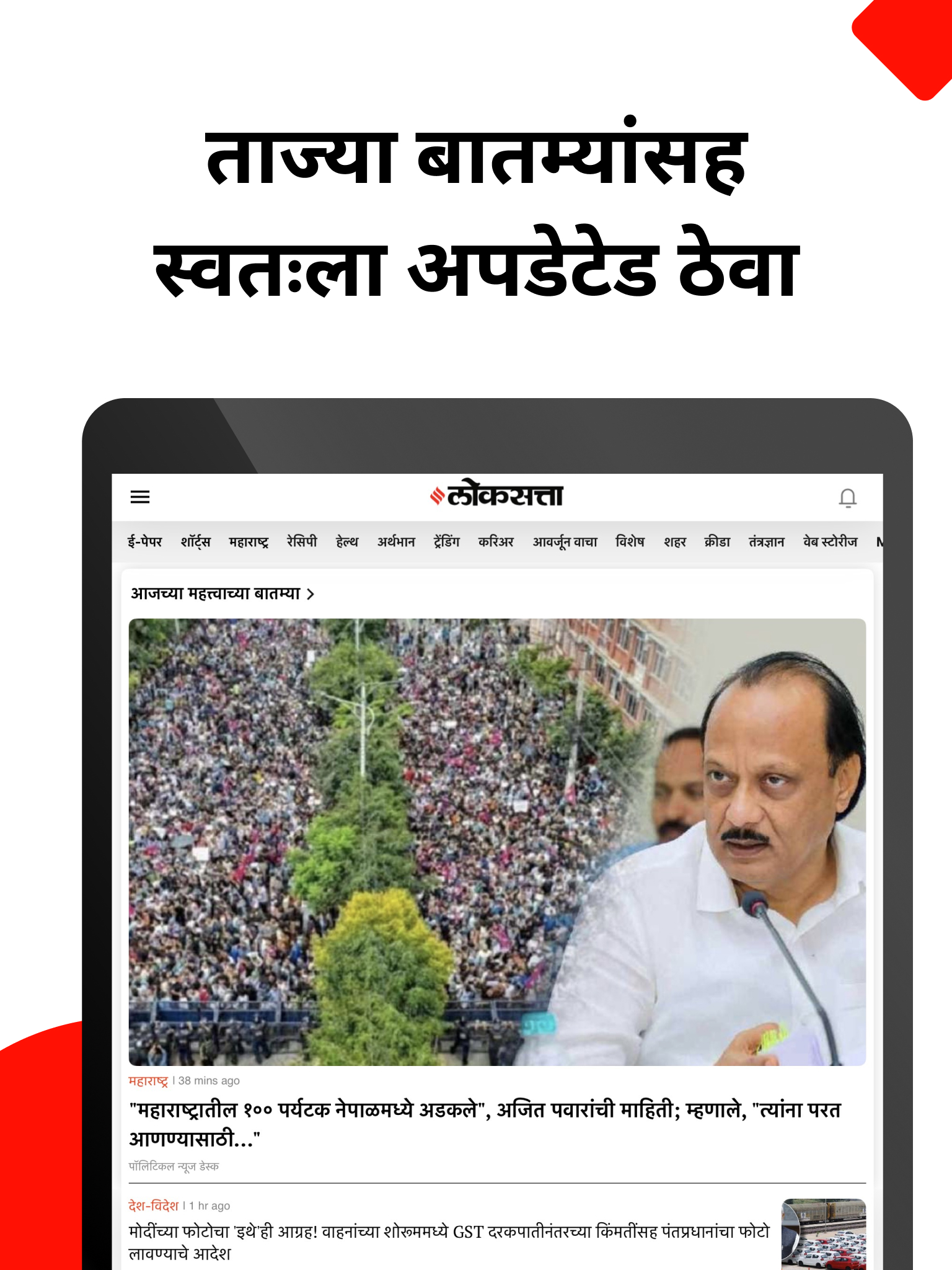 ◉पर्सनलाइज्ड बातम्यांचा अनुभव - नवीन होम स्क्रीन तुम्हाला तुमच्या आवडत्या विभागांमधील सर्वोत्तम बातम्या देते. उदाहरणार्थ महाराष्ट्र, देश-विदेश, ताज्या व्हिडीओ, तंत्रज्ञान, मनोरंजन, क्रीडा इत्यादी.