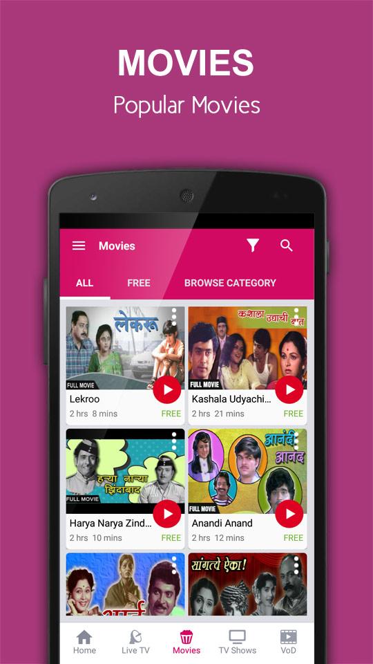 Marathi TV app is a custom-made & interactive Marathi Entertainment experience for you on your smartphone. Watch your favorite Live TV channels, TV shows, watch Live News, Online Marathi Movies, and TV Reality Shows on the go without any interruption on your mobile phone with Marathi TV. Streaming over popular Marathi movies, Music Videos, Cooking Videos, Reality TV Shows, and Videos on Demand on your Mobile TV.