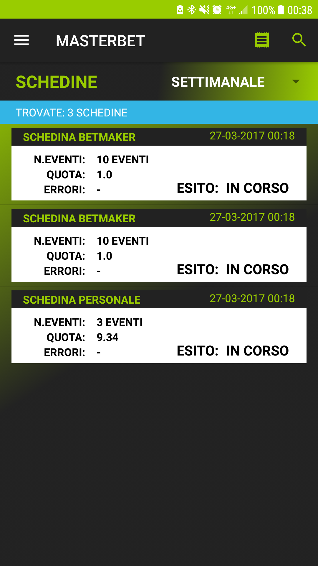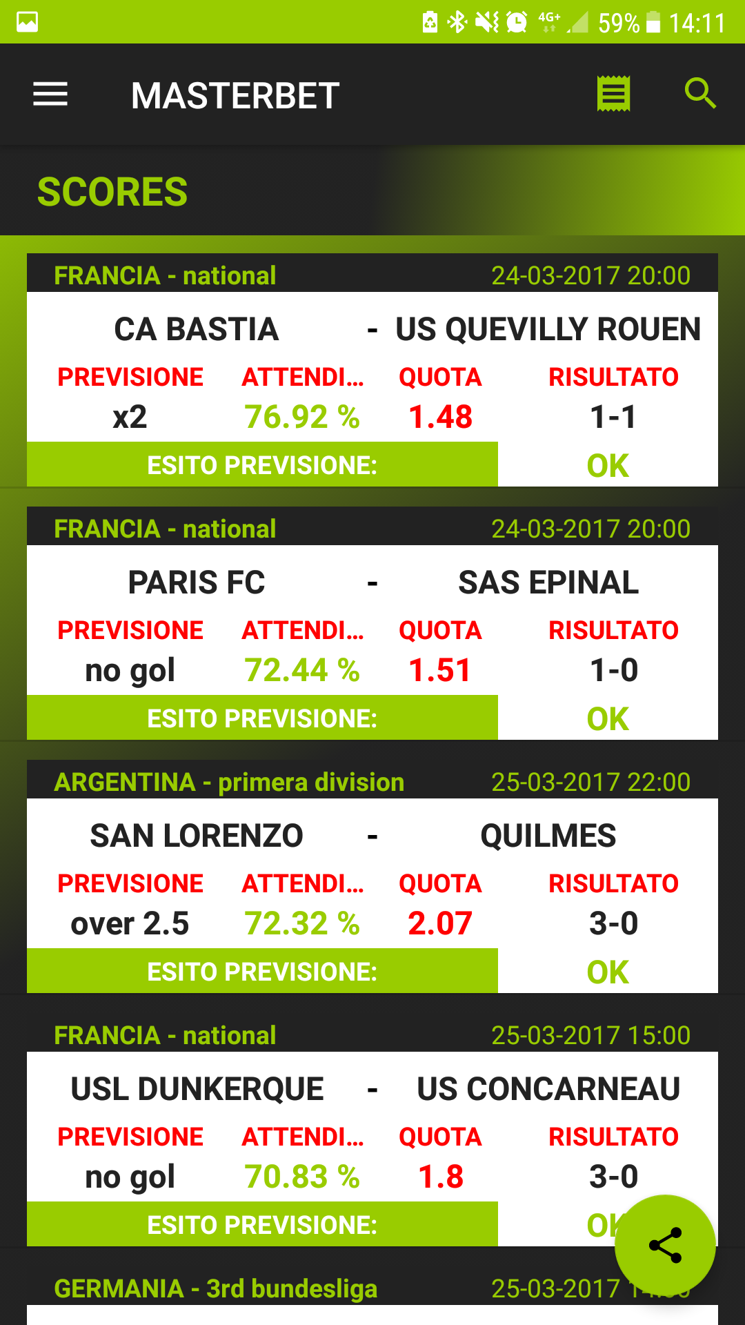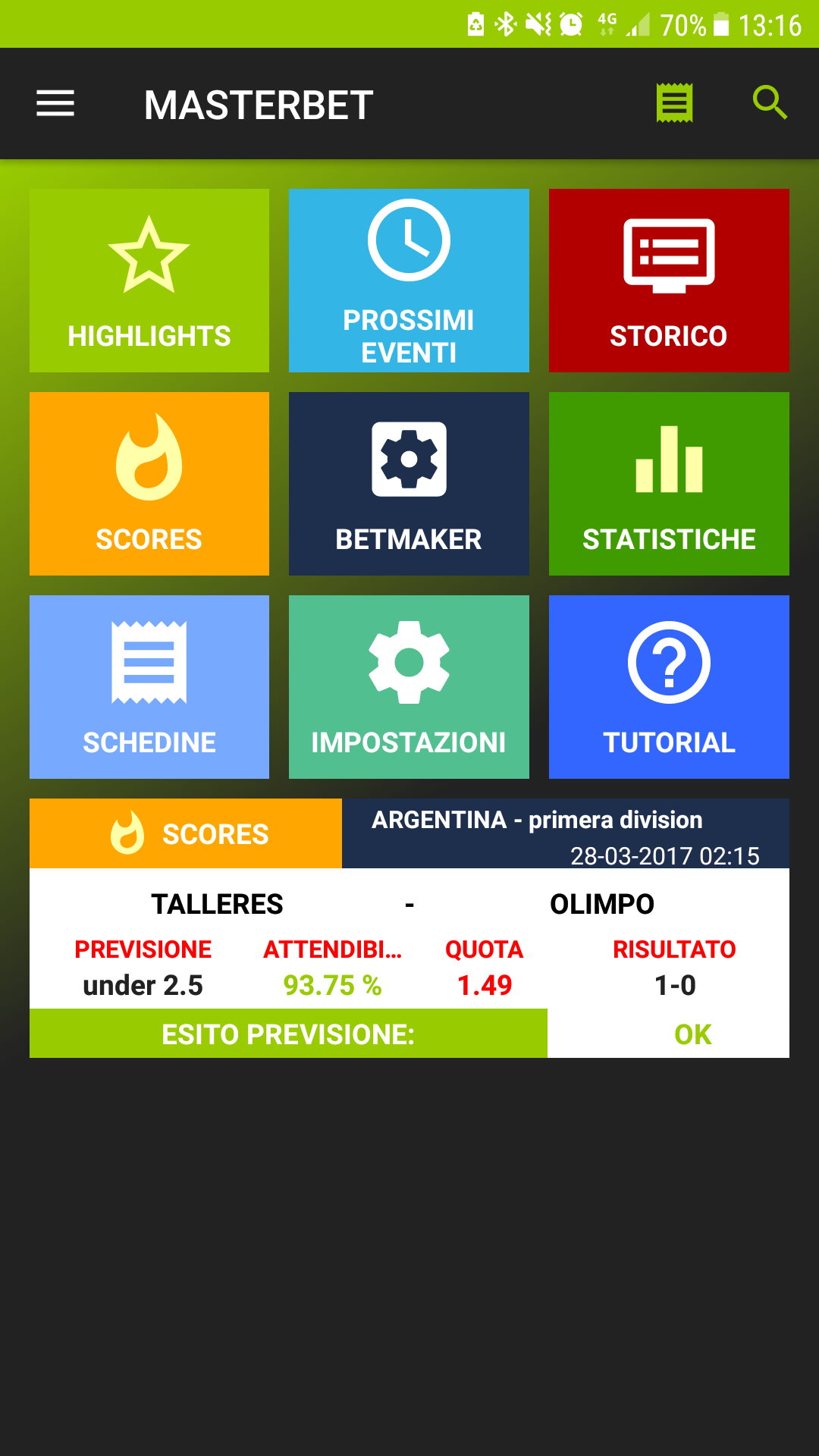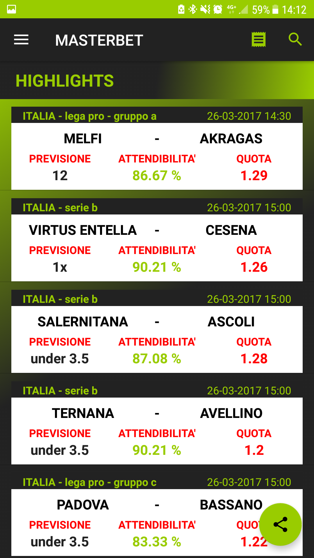 Masterbet ist eine App auf Wetten gewidmet, die ein wertvoller Mitarbeiter in der heiklen Phase der Auswahl von Veranstaltungen, auf denen sein soll, die Wetten zu machen. Das System wird Vorhersagen über die großen Fußballveranstaltungen auf internationale Ebene auf der Grundlage von statistischen Daten zur Verfügung stellen, je höher der Prozentsatz der Zuverlässigkeit% einer Vorhersage, desto größer die Wahrscheinlichkeit, dass die Vorhersage auftreten. Zu den Features in der App zu finden: HIGHLIGHTS: mit den Highlights haben Sie für das Spiel jeden Tag palinsento hohe Zuverlässigkeit Prognosen verfügbar verfügbar! NÄCHSTES SPIEL: aus diesem Abschnitt können Sie die Liste der kommenden Veranstaltungen zugreifen können noch nicht gespielt. WETTER EVENT: in „Wetter-Event“ sind die Uniformen Prognosen nach Art der Aktie. BETMAKER: bauen Sie Ihr Spiel mit betmaker! Erstellen Coupons auf der Basis der Bestimmungen, die in der Anwendung, um die Anzahl der gewünschten Ereignisse spezifizieren, Ligen, Bemaßungstypen und dem gewünschten Grad der Zuverlässigkeit; unter den Optionen können Sie wählen, um den Gutschein zu speichern und später zu konsultieren oder Ereignisse zu „Coupon Personal“ hinzufügen. PARTITUREN: die „Scores“ -Abschnitt Sie die aktuellen Prognosen erfolgreich verarbeitet aus der App anzeigen können. STATISTIK: die „Statistik“ bietet die prozentuale Wirksamkeit der Prognosen der jeweiligen Bemaßungstypen, können Sie auch die Statistiken für die wöchentlichen Zeitraum filtern, mensibile, vierteljährlich, halbjährlich und jährlich. GESCHICHTE: Dank der Historiker, können Sie die Wirksamkeit der App Prognosen getan sehen, die in der Lage, den Zeitraum Filter, Meisterschaft, wie Höhe und Zuverlässigkeit Vorhersage auszuführen. EVENT SEARCH: Suche nach Button, oben auf der Symbolleiste, können Sie für die Vorhersage des gewünschten Spiels suchen. Coupons: die Coupons, die von „Betmaker“ oder „Persönlicher Coupon“ Sie können sie in dem „Coupons“, wo Sie das Spiel zugreifen können und konsultieren das Ergebnis; Sie können auch die Gutscheine für die wöchentlichen Zeitraum filtern, mensibile, Quartals-, Halbjahres- und Jahr PERSONAL MEMORY ROLL: Top-Platz in der Symbolleiste auf, ist dies über die Suchtaste, eine Taste, die den Zugang zum „Personal Coupon“ erlaubt, wo Sie Ihr eigenes Spiel erstellen können, indem Sie die Prognosen zwischen den verschiedenen Abschnitten der App Auswahl ( „Betmaker "" Highlights "" Wetter-Ereignis „). Herunterladen Masterbet! und versuchen, die wichtigsten App-Funktionen!