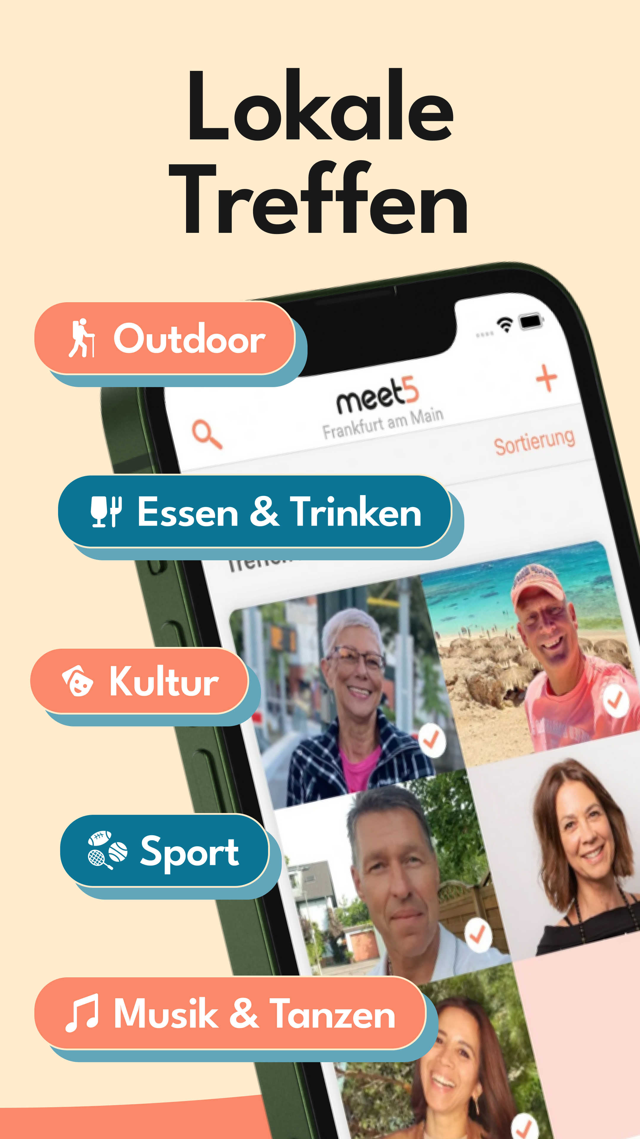 Meet5 ist die #1 Freizeit-App. Entwickelt, um es dir einfach zu machen, neue Leute im echten Leben kennenzulernen, Freunde zu finden und an Aktivitäten & Veranstaltungen teilzunehmen. ❤️ Über 3.000.000 registrierte Nutzer ✨ Mehr als 1.000.000 stattgefundene Treffen ⭐ 4,7/5-Sterne-Bewertung bei Google & Apple 🙋 Echte Nutzer dank Verifizierungsprozess 🇩🇪 Überall in Deutschland Erlebe mit der Meet5-App eine Vielfalt an Treffen und interessierten Menschen. Beim Wandern, essen gehen, Partys, Tanzen, Konzerten, Sport, Kultur, Spielen und weiteren Veranstaltungen lernst du Leute kennen & Freundschaften entstehen. Du kannst an Treffen anderer Nutzer teilnehmen oder selbst Treffen erstellen. Chatte vor und nach dem Treffen mit den anderen Teilnehmern im Gruppenchat. Dabei sind alle Funktionen rund um die Treffen kostenlos. Wähle deine Region, um alle verfügbaren Treffen zu sehen. Mit den Filter- und Suchfunktionen kannst du dabei deine Auswahl verfeinern. Durch dein Profil und deine Interessen wirst du von anderen Nutzern zu passenden Treffen eingeladen. Triffst du interessante Menschen und schließt Freundschaften, kannst du diese als Favoriten abspeichern und sie so einfach zum nächsten Treffen einladen. Meet5-Nutzer, die an ihrem ersten Treffen teilgenommen haben, gehen im Schnitt jeden Monat auf 4,28 weitere Treffen. Vorteile von Gruppentreffen: ✨ Du lernst gleich 5 oder mehr neue Leute aus deiner Nähe kennen. ✨ Treffen in der Gruppe bieten eine sichere, aber gleichzeitig lockere Atmosphäre. ✨ In der Gruppe gehen nie die Themen aus und es ist leichter, Gemeinsamkeiten zu finden. ✨ Bei Meet5 Treffen ist Platz für verschiedene Charaktere und Interessen. Leute kennenlernen und Freunde finden geht bei uns über viele Grenzen hinweg. Vorteile von Meet5 Premium: 💬 Privat chatten: Sende und beantworte private Chat-Anfragen. Du kannst mit jedem frei chatten, egal ob er oder sie Premium hat oder nicht. 🧡 Favorisierungen entdecken: Sieh, wer dich als Favorit markiert hat und finde neue Freunde! 🎫 Priorisierte Teilnahme: Tritt ohne Wartezeit allen Treffen bei, gilt auch bei neu erstellten Treffen. 😄 Profilbesucher sehen: Sieh, wer dein Profil besucht hat und lass dir nichts mehr entgehen. 📌 Treffen filtern: Suche Treffen nach Kategorien. Benutze einen unser fünf Filter und finde das perfekte Treffen für dich. 📱 Nutzer-Onlinestatus: Sieh den Onlinestatus anderer Meet5-Mitglieder und bleibe immer auf dem Laufenden. 🥇 Goldenes Profil: Lass dein Profil in Gold erstrahlen und verleihe dir das gewisse Etwas! 👻 Geistermodus: Mache dich im Geistermodus unsichtbar und werde anderen Mitgliedern nicht mehr als Profilbesucher angezeigt. 📧 Treffen nur auf Einladung: Erstell Treffen “nur auf deine Einladung” und entscheide, wer an deinem Treffen teilnehmen darf. Mit viel Liebe in Frankfurt entwickelt ❤️ ========= Datenschutz: https://www.meet5.de/datenschutzbelehrung Nutzungsbedingungen: https://www.meet5.de/agb www.meet5.de