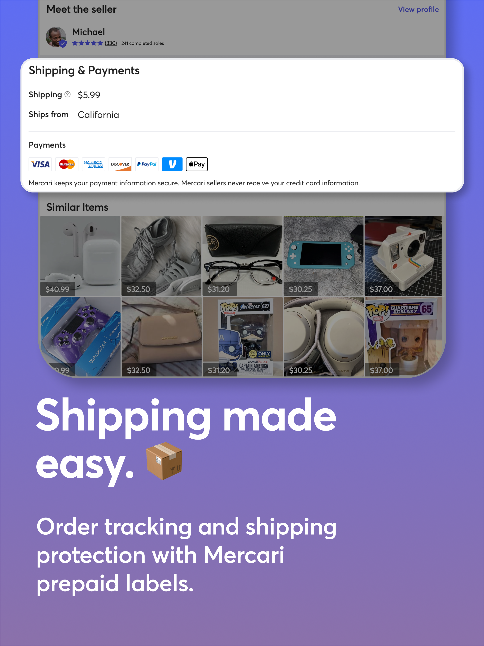 - Verwenden Sie Mercari Prepaid Labels, um vom Verkäufer oder vom Käufer bezahlte Versandetiketten einfach auszupreisen und auszudrucken, Ihre Sendungen zu verfolgen und einen Versandschutz von bis zu 200 US-Dollar zu erhalten