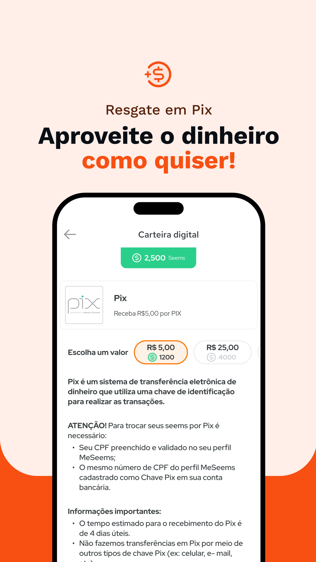 MeSeems hilft Ihnen, Ihren Erfolgen näher zu kommen: Erhalten Sie Geld in Pix, laden Sie Guthaben auf Ihr Mobiltelefon auf, um mit den Menschen, die Sie lieben, in Kontakt zu bleiben, erhalten Sie einen Rabatt beim Kauf eines wichtigen Buches oder kaufen Sie sogar das fehlende Lebensmittel der Schrank. Aber das ist noch nicht alles: Im Swap Your Looks Store stehen Ihnen viele Optionen zur Auswahl.