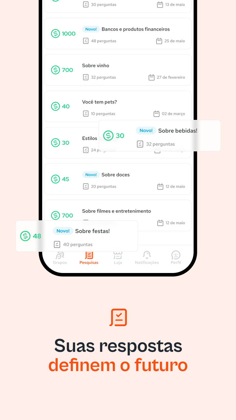Sie beantworten Online-Umfragen großer Marken und Unternehmen und definieren die Zukunft von Produkten und Dienstleistungen, die Teil des Lebens Tausender Brasilianer sind. Und da Ihre ehrliche Meinung für uns einen hohen Stellenwert hat, erhalten Sie jedes Mal eine Belohnung, wenn Sie sie mit uns teilen.