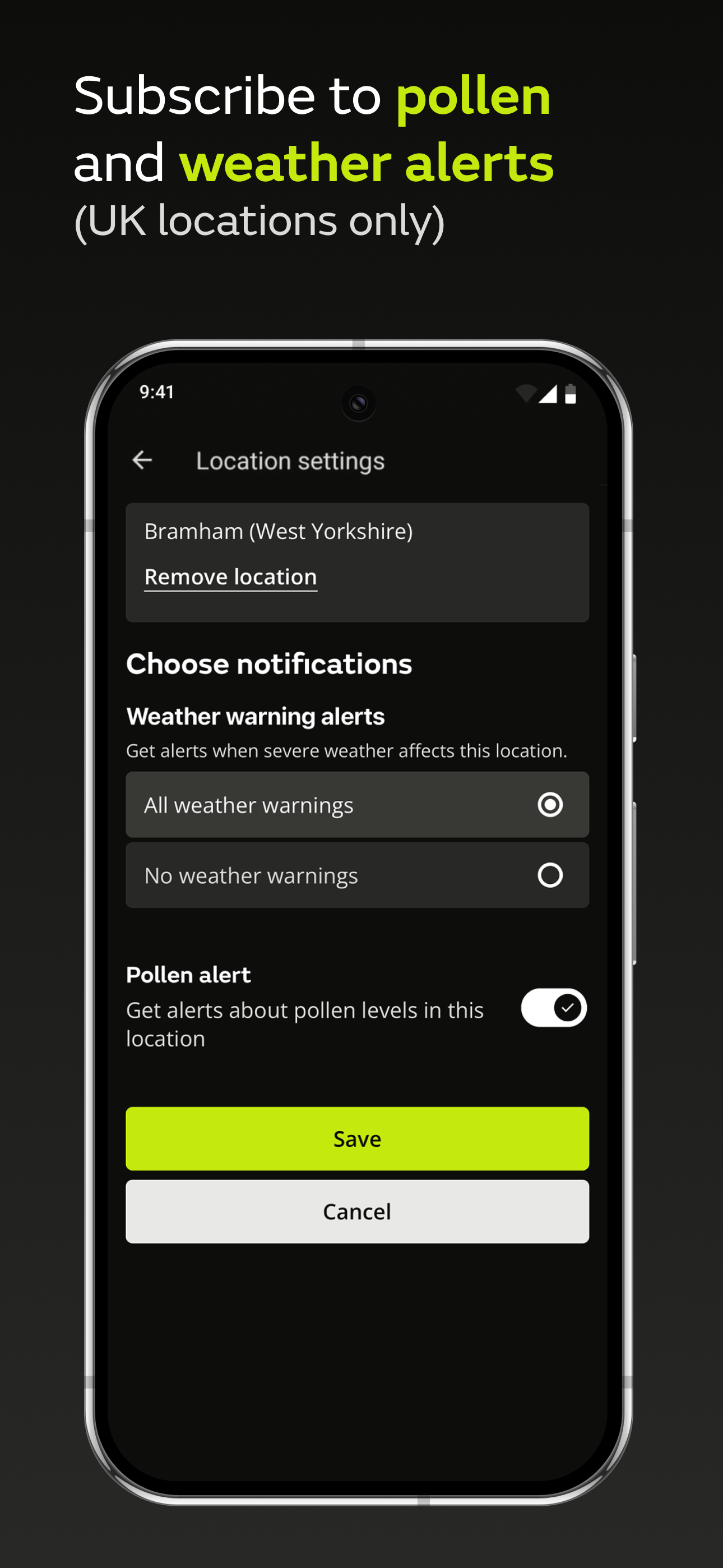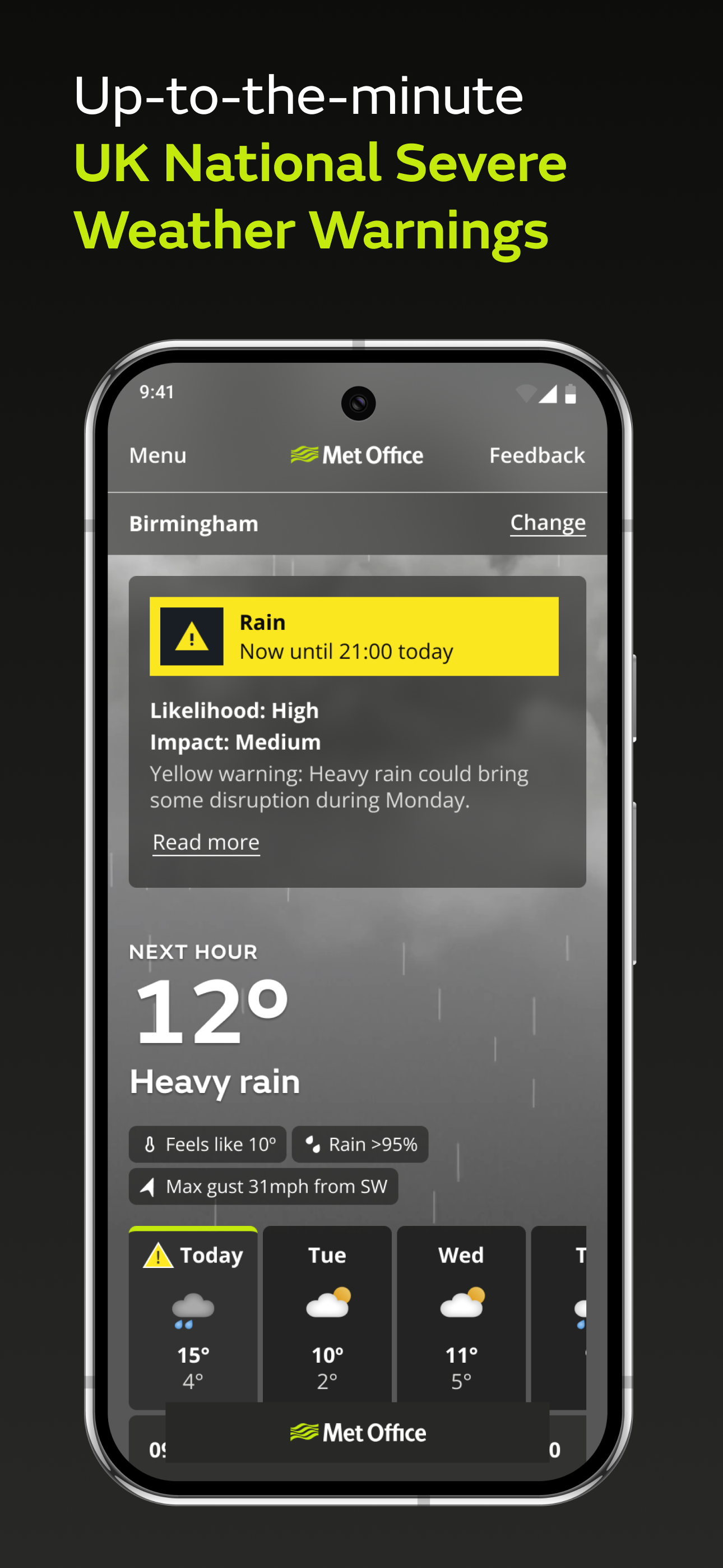 * Sofortige Benachrichtigungen bei nationalen Unwetterwarnungen für Großbritannien