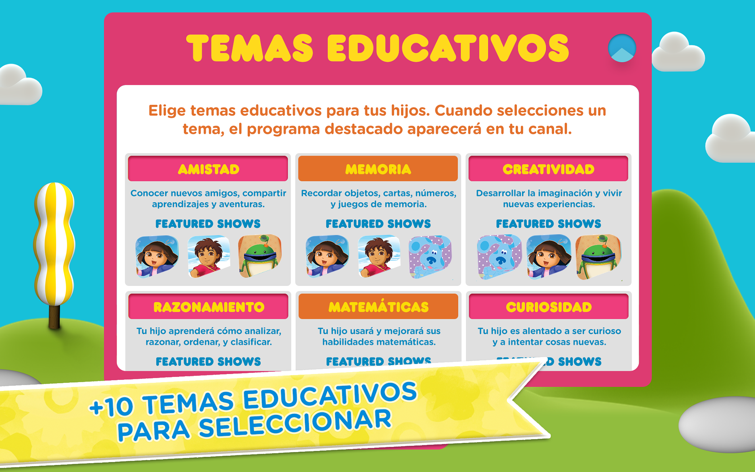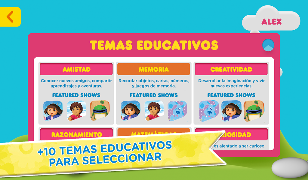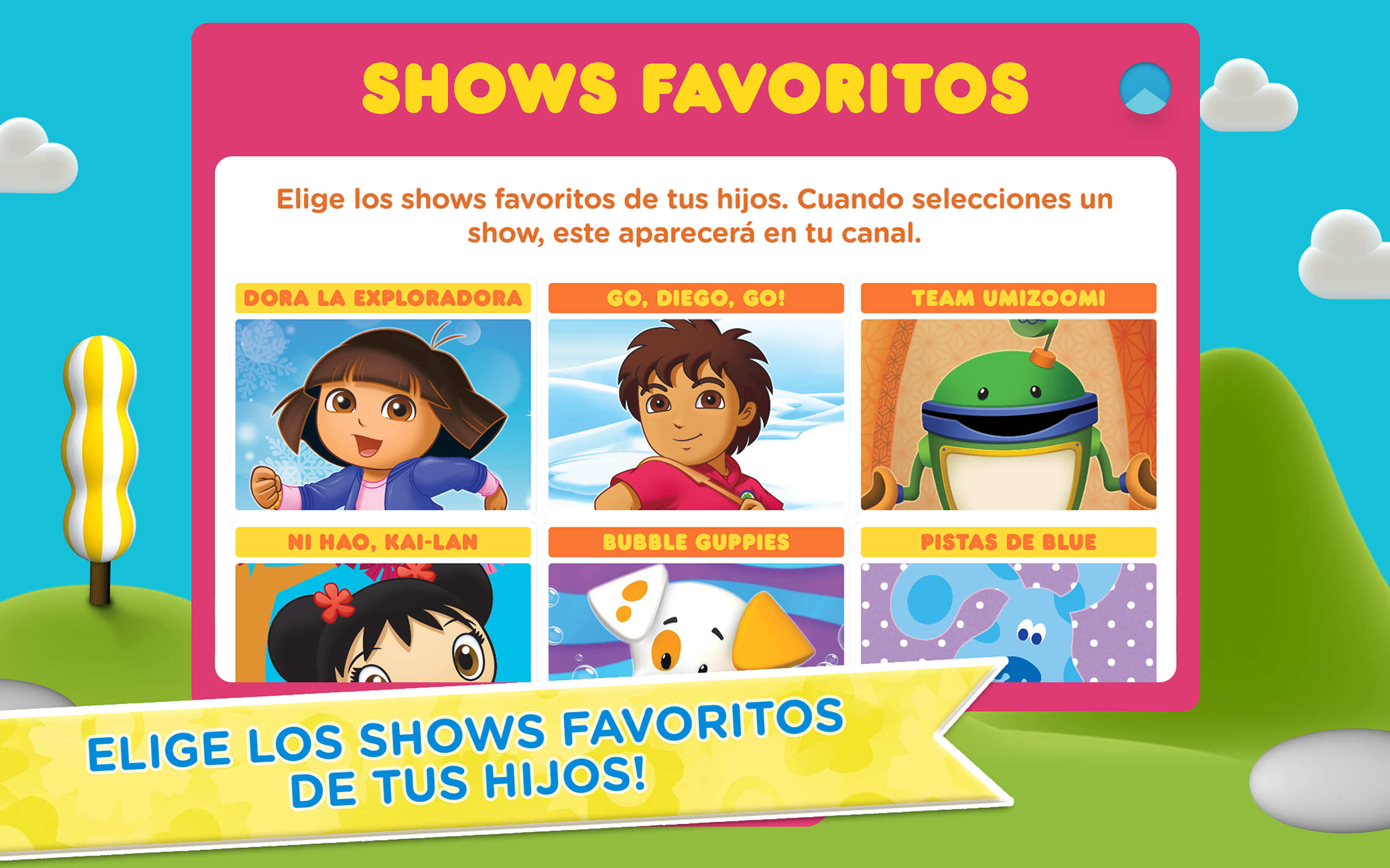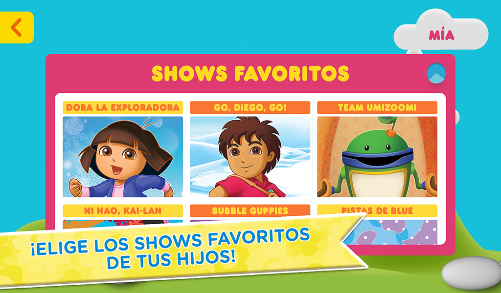 Dora la Exploradora, Bubble Guppies, Team Umizoomi, y mucho más! Mi Nick Jr. es el primer canal de televisión personalizable por padres y niños de Nick Jr. Mi Nick Jr. permite a los padres crear un canal de televisión personalizado para sus hijos, basándose en la selección de opciones de temáticas educativas, edad, género, y preferencias de visualización. Es la mejor forma de ver episodios completos de los programas favoritos de Nick Jr. en un dispositivo móvil o tableta. Mi Nick Jr. presenta: • Dora la Exploradora • ¡Go Diego Go! • Bubble Guppies • Team Umizoomi • Ni Hao Kai-Lan • Ticket y Toc • Y más! SIN ANUNCIOS Ingresa con tus credenciales de SKY / BLUE TO GO para ver todos los episodios y sin anuncios. EPISODIOS COMPLETOS Temporadas completas de series como Bubble Guppies, Go, Diego, Go!, Dora la Exploradora, Ni Hao Kai-Lan, Tickety Toc, Team Umizoomi, y más! PERSONALIZADO Mi Nick Jr. se adapta a las preferencias de los padres y niños, para seleccionar y presentar automáticamente el contenido más atractivo de acuerdo a las temáticas educativas, edad, género, y preferencias de visualización. MULTIPLES PANTALLAS Pausa en un dispositivo y continúa viendo en otro, en cualquier momento. El acceso es gratuito con su suscripción de tv cable de SKY. Solo ingrese con sus credenciales de SKY / BLUE TO GO para acceder a todos los episodios completos. La aplicación Mi Nick Jr. recopila información del usuario que no es privada. En caso de que sea necesario, Nickelodeon y/o una tercera parte puede generar un identificador que es único para la aplicación, descargado a un aparato específico, conocido como el Identificador Único Universal de Núcleo Fundacional cuyas siglas en inglés son CFUUID. La información del usuario puede ser usada, por ejemplo, para responder a las peticiones del usuario; permitir que los usuarios se aprovechen de ciertos rasgos y servicios, personalizar contenido y publicidades, manejar y mejorar los servicios de Nickelodeon. Cuando los suscriptores a un servicio de televisión por cable autentican su servicio de televisión por cable para ver episodios completos, un código de identificación es almacenada en el dispositivo. Para más información sobre la utilización de la información de los usuarios por parte de Nickelodeon, por favor visite las Políticas de Privacidad del Grupo Nickelodeon La Política de Privacidad de Nickelodeon se suma a cualquier término, condición o política acordada entre usted y Google Play, y Nickelodeon y las entidades afiliadas a Nickelodeon no son responsables por las recopilaciones de Google Play o uso de sus datos e información. El uso de esta app está sujeto al Acuerdo de Licencia de Usuario Final (ALUF) de Nickelodeon. Políticas de Privacidad http://www.mundonick.com/gsp/international/mundonick.com/politica_de_privacidad_de_mundonick.pdf