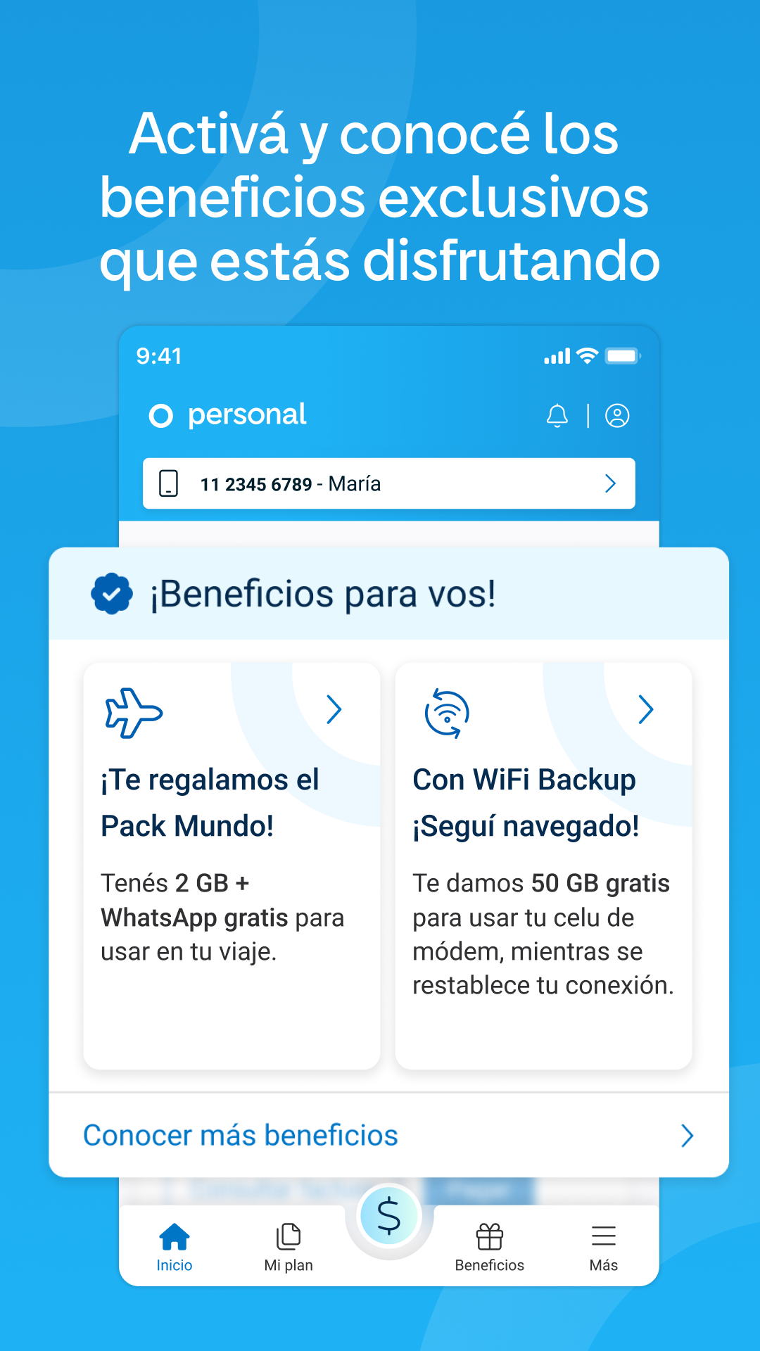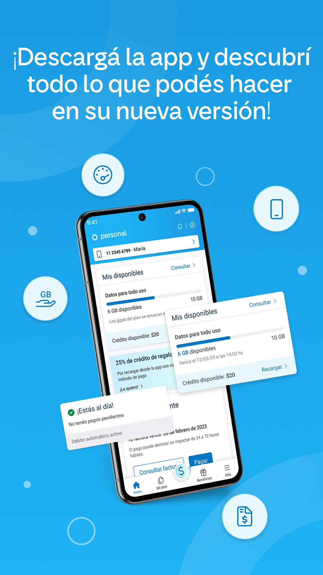 Descubrí las novedades: Nuevas opciones de pago para tus packs Si tenés una línea pospaga, podés pagar con tarjeta de crédito, débito o Visa Personal Pay tus packs de internet, noche, Video Pass y WiFi Pass. Accedé a la app antes de la instalación Si esperás la instalación de tu servicio hogar, podés gestionar tu visita y empezar a disfrutar tus beneficios. Nuevo método de pago Podés pagar tu factura con dinero en cuenta de Personal Pay. Con esta opción obtenés hasta un 25% de reintegro.