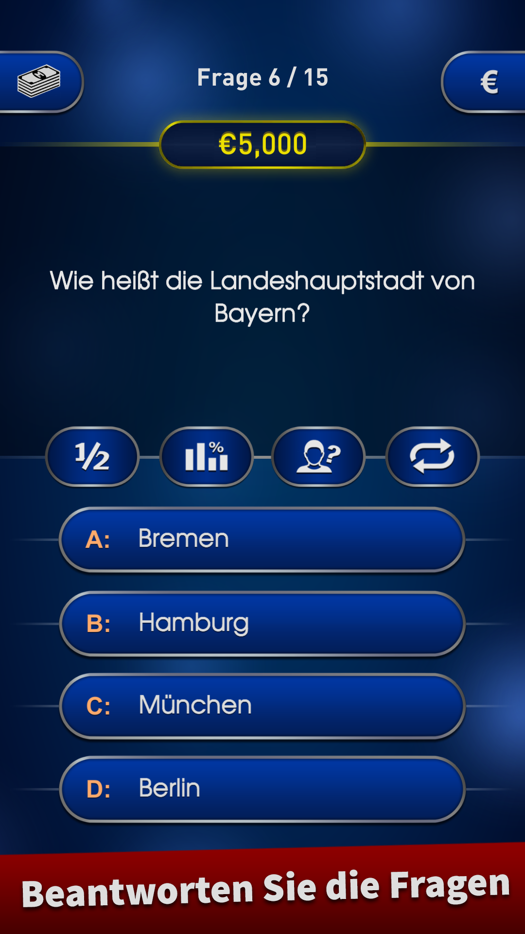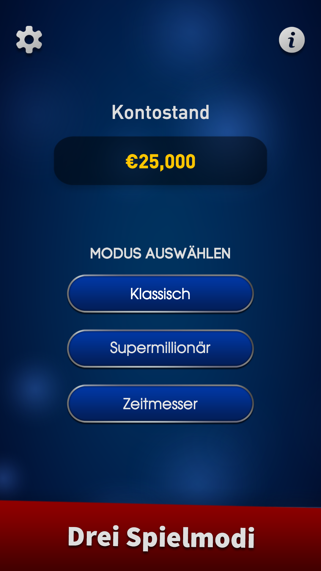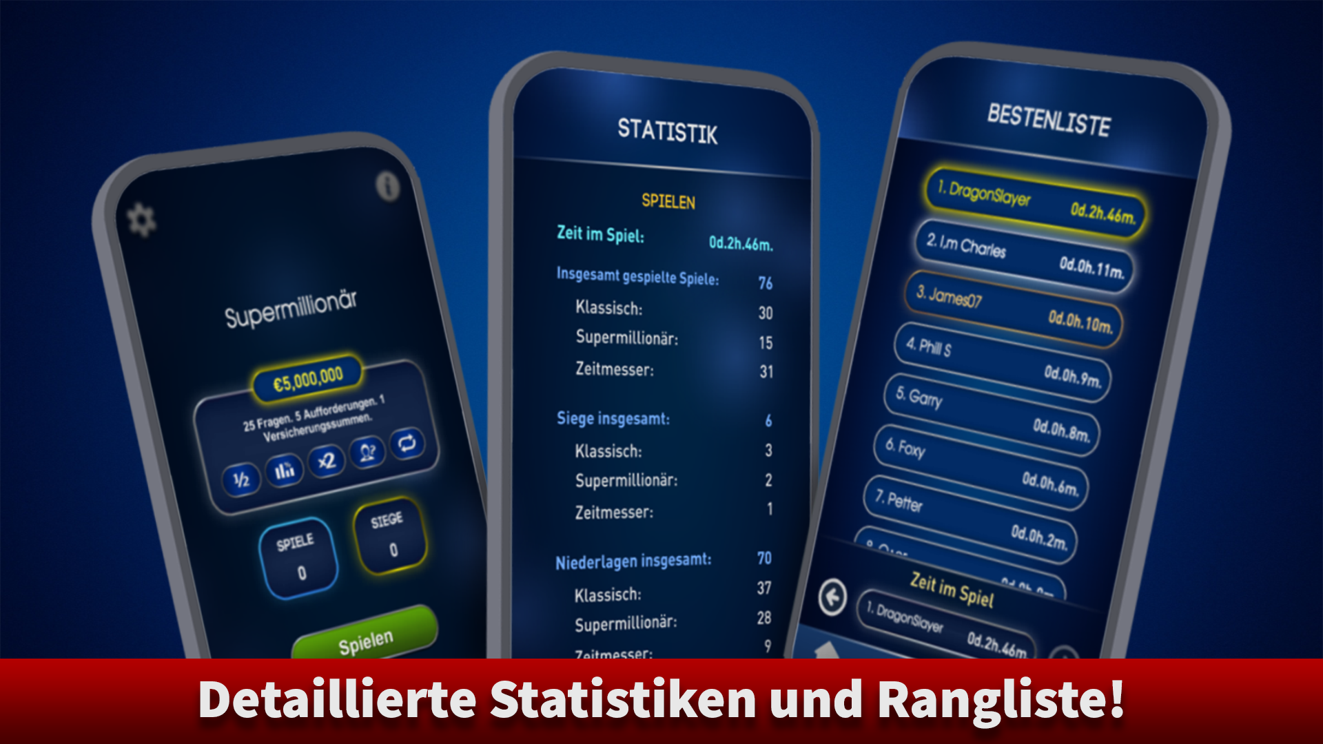 Ein brandneuer SUPERMILLIONER-Modus mit 25 Fragen, 5 Hinweisen und einem Hauptgewinn von 5 Millionen! So etwas haben Sie noch nie zuvor gesehen! Für Fans der klassischen Version des Spiels bieten wir einen Modus mit 15 Fragen und einem Gewinn von 1.000.000. Mit den gesammelten Punkten können Sie alle möglichen Dinge, Fahrzeuge und sogar Immobilien kaufen! Millionär 2025: Deutsche Trivia Quiz - die kostenlose Quiz App für jedes Alter! Jetzt mit täglich neuen Fragen und neuem Design! Überprüfe und verbessere dein Allgemeinwissen mit über 15.000 Quiz Fragen aus 10 verschiedenen Themengebieten. Millionär Trivia 2026 Quiz ist das unterhaltsame Trivia-Spiel, bei dem Sie eine unbegrenzte Anzahl von Fragen erhalten, die nirgendwo anders zu finden sind. Diese Version des Quiz hat viele Vorteile. Eine praktische und schöne Oberfläche, Tausende von neuesten, interessanten Fragen, coole Animationen und Soundeffekte ermöglichen es Ihnen, in die Atmosphäre des Strebens nach dem begehrten Titel „Millionär“ einzutauchen. Das Quiz ist auch für Kinder geeignet, die ersten Stufen sind überhaupt nicht schwierig und selbst die Kleinsten finden die richtigen Antworten. Es macht besonders Spaß, mit der ganzen Familie zu spielen und dabei neue Dinge zu lernen! Das Spiel beginnt mit einfachen Fragen und mit jedem neuen Level wechseln Sie zu schwierigeren. Je gelehrter du bist und richtig antwortest, desto mehr Geld bekommst du im Spiel. Nur 15 Levels, der letzte Preis ist eine Million! Die letzten Runden können sehr schwierig sein, es ist schwierig, die richtige Antwort zu finden, und um zu gewinnen, müssen Sie Ihren Intellekt wirklich einschalten und Glück haben. Außerdem benötigt das Spiel kein Internet und ist völlig kostenlos. Millionär Trivia доступен на большинстве языков. -ein Trivia-Spiel, um Ihren IQ und Ihr Allgemeinwissen zu testen -wertvolle Informationsquelle -unterhaltsame Fragen für alle Interessenskategorien -eine großartige Möglichkeit, Ihre Freunde und andere Spieler zu einem Wettbewerb um die höchsten Plätze herauszufordern -eine schöne Möglichkeit, Ihr Gedächtnis zu trainieren -mehr als 15.000 Fragen aus verschiedenen Bereichen, Kategorien und Schwierigkeitsgraden, wöchentlich aktualisiert. Installieren Sie Millionär Trivia und antworten Sie auf Trivia-Fragen, lesen Sie interessante Erläuterungen, bilden Sie sich! Knackst du die Million? Werden Sie Millionär 2026!! Wir wünschen dir viel Glück!