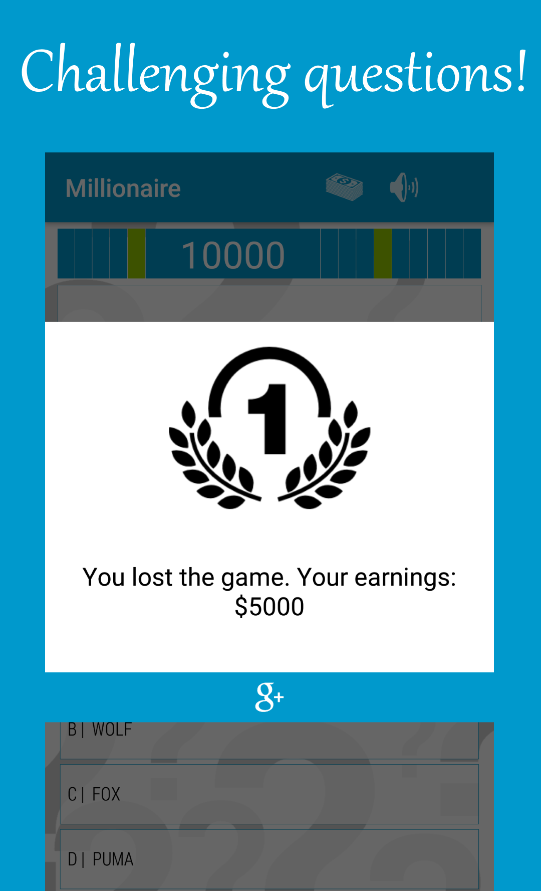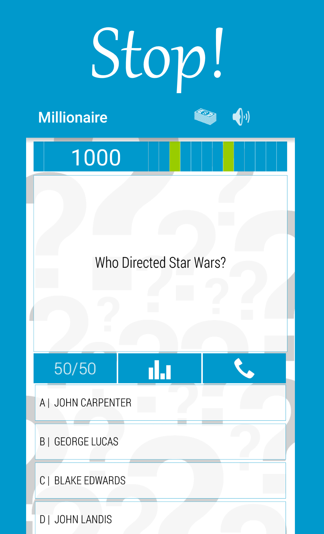 Wer die klügste in Ihrem Land zu sein? Gewinnen Sie in der interessanten Spiel - Quiz Millionär! Beantworten Sie die 15 intelligente und komplexe Fragen und Millionär werden! Millionär ist nicht nur ein Spiel - es ist eine intellektuelle Quiz-Show, die Sie intelligenter macht, intelligenter und reicher! Millionär Quiz wird in der Gestalt des berühmten und beliebten TV-Show gemacht, "Wer wird Millionär sein will." Das Spiel hat viele einzigartige und intelligente Fragen. Die Fähigkeit, Hinweise zu verwenden: 50-50, mit der Halle helfen, einen Freund anrufen. Je mehr Fragen Sie beantworten, pumpen je mehr Sie über Ihr Gehirn und Intelligenz. In diesem Spiel verbringen Sie nützliche Zeit und erhöht den Grad der Intelligenz. Beantworten Sie unsere geistigen intelligente Fragen und werden Sie der Gewinner des Quiz Millionär! Das Spiel hat eine feuerfeste Menge von 5.000 US-Dollar und 100.000 Dollar! Aber nicht zu stoppen und die Milliarden gewinnen! Dann werden Sie der Gewinner Milliardär geworden! Für Sie haben wir versucht, die interessantesten Fragen im Quiz Millionär zu finden. Fragen zu Ihrem Land, über die Welt der ungewöhnlichen Fakten. Auch gibt es Fragen zu verschiedenen Themen: Musik, Filme, Kino, Kunst, Geschichte, Geographie, das Land und die Hauptstadt und andere. Setzt Millionär Quiz und entwickeln!