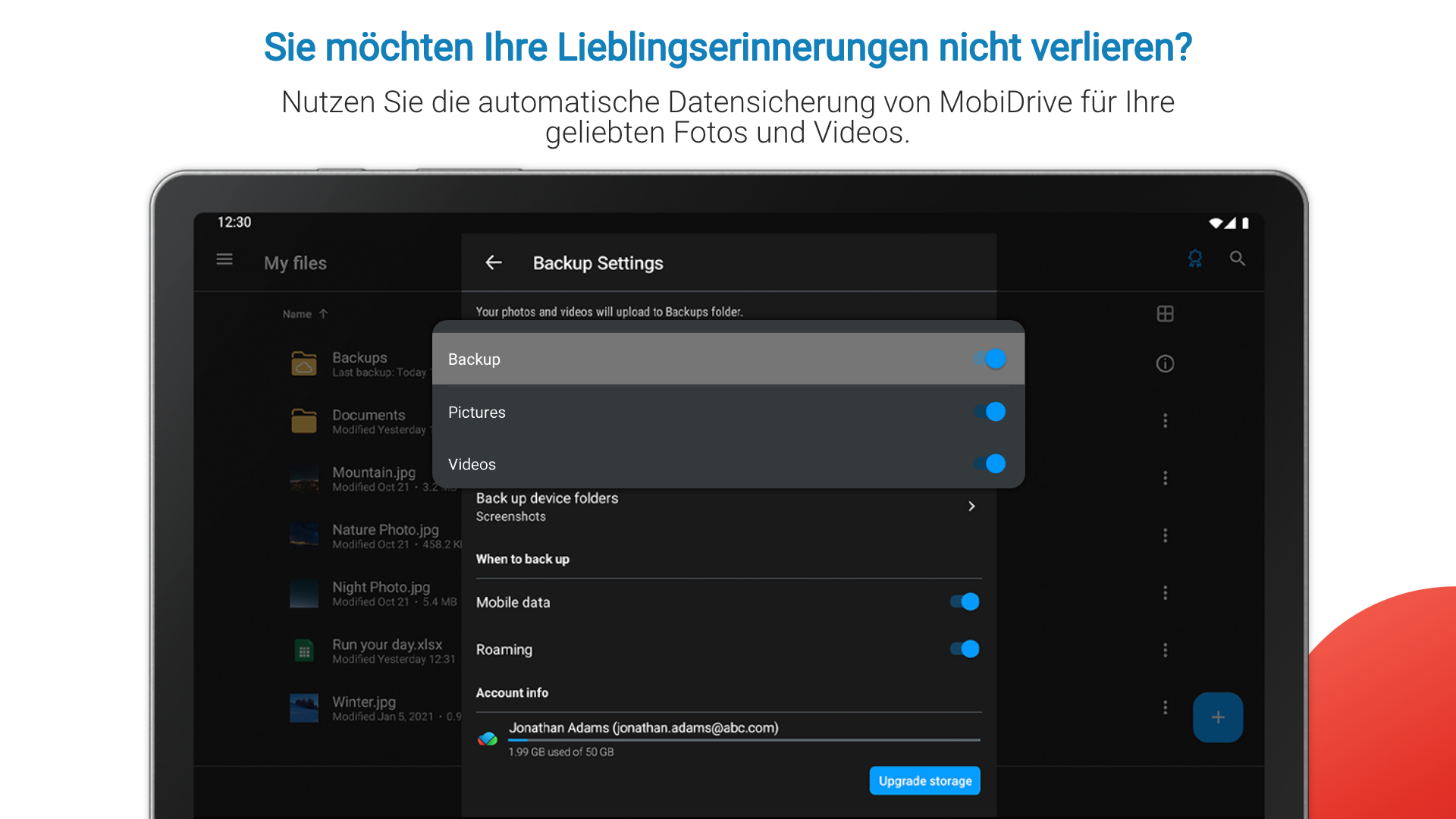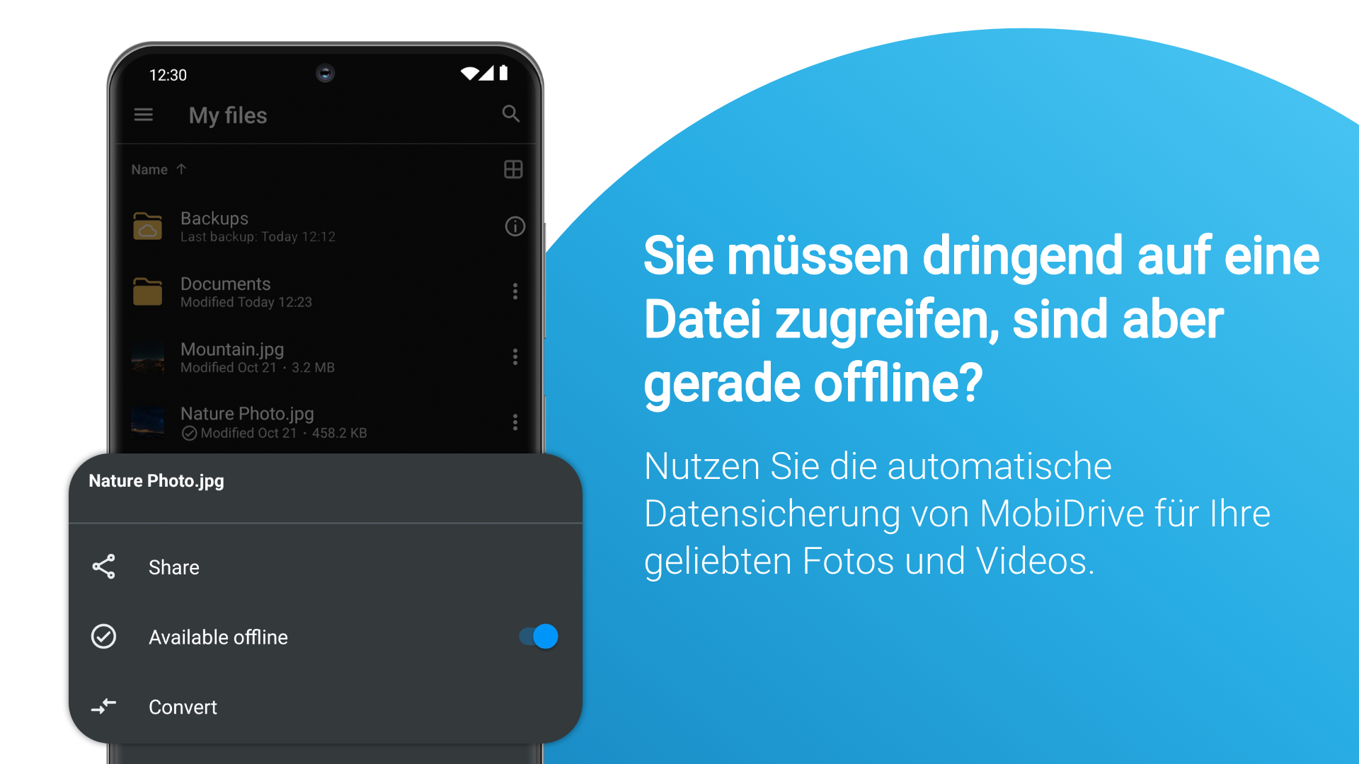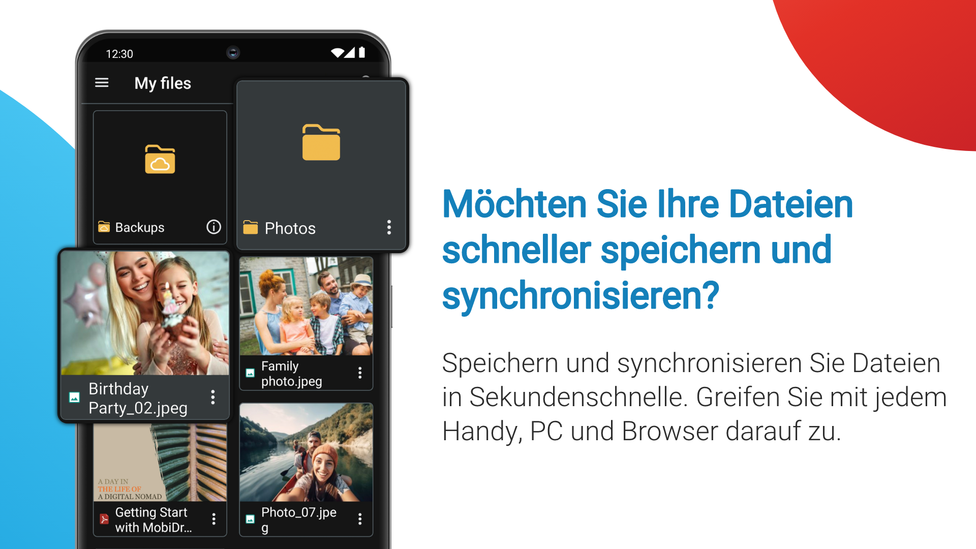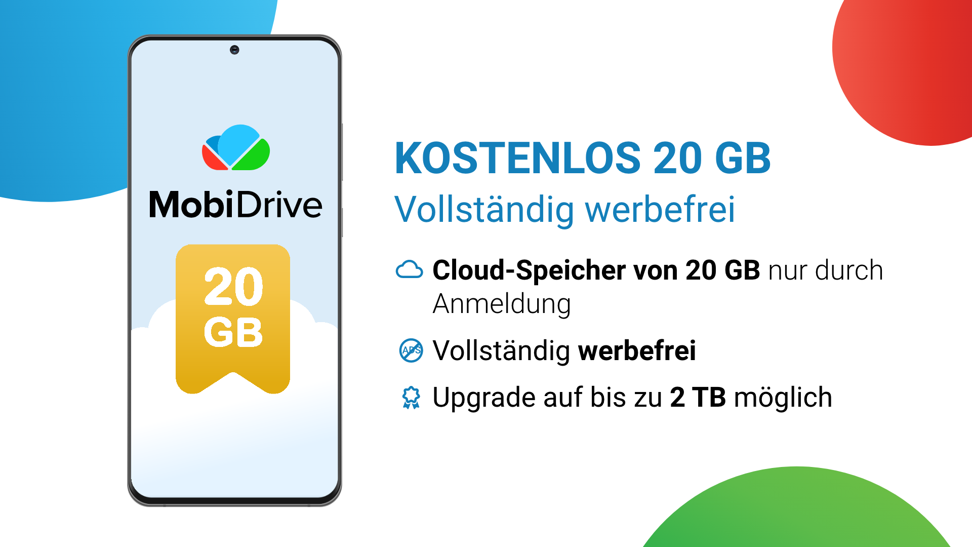 MobiDrive ist ein optimierter, sicherer und werbefreier Cloud-Speicher mit praktischen Funktionen zum Sichern, Synchronisieren und Öffnen all Ihrer Dateien. Vom kostenlosen 20-GB-Speicher, der bei Anmeldung verfügbar ist, bis hin zu umfangreichen plattformübergreifenden Funktionen gewährleistet MobiDrive eine sichere Inhaltsübertragung für alle Dateiformate, Geräte, Plattformen und Standorte. SICHERER SPEICHER MIT VIEL PLATZ - Möchten Sie 20 GB kostenlosen Cloud-Speicher, keine Werbung und keine Bedingungen? Erstellen Sie einfach ein Konto, fordern Sie Ihren kostenlosen Speicherplatz an und synchronisieren oder sichern Sie Ihre Dateien. - Benötigen Sie einen praktischen Video- oder Fotospeicher, aber die kostenlosen 20 GB reichen nicht aus? Rüsten Sie Ihren Speicherplatz auf bis zu 2 TB auf und erhalten Sie ausreichend Platz zum Synchronisieren und Sichern. SCHNELLER ZUGRIFF AUF DATEIEN - Inhalte lassen sich unkompliziert und schnell übertragen. Sichern und synchronisieren Sie Dateien und Ordner in Sekundenschnelle in Ihrem Cloud-Speicher. - Stellen Sie mit der automatischen Sicherung von Fotos und Videos sicher, dass Ihr Foto- und Videospeicher immer auf dem neuesten Stand ist. - Mit den nahtlosen plattformübergreifenden Funktionen von MobiDrive können Sie Ihren Speicher synchronisieren und ein Backup auf jedem mobilen Gerät, Windows-PC oder Browser erstellen. LEISTUNGSSTARKE DATEIVERWALTUNG - MobiDrive unterstützt alle gängigen Foto-, Video- und Office-Formate. Damit ist MobiDrive eine ideale Lösung, um Fotos und Videos aufzubewahren, und ein sicherer Ort für Ihre beruflichen Dateien. - Wandeln Sie Dateien in über 1200 Dateiformate um, damit sie immer kompatibel sind. - Wenn Sie Ihren Speicher nach jeder Sicherung oder Inhaltsübertragung neu organisieren müssen, ist dies ziemlich mühsam. Verwenden Sie Sammlungen, in denen Ihre Dateien nach Dateityp sortiert werden. - Greifen Sie über „Zuletzt geöffnete Dateien“ schnell auf Ihre letzten Dateien zu. SORGLOSE WIEDERHERSTELLUNG VON DATEIEN - Haben Sie versehentlich eine Datei gelöscht? Stellen Sie sie über den Papierkorb wieder her. - Greifen Sie auf frühere Versionen von Dateien zu, die in Ihrem Cloud-Speicher abgelegt sind. - Jede Datei in Ihrem Speicher ist 30 Tage lang gesichert. Das bedeutet, dass Sie sie jederzeit wiederherstellen können, selbst wenn sie gelöscht oder geändert wurde. INHALTE BEQUEM TEILEN & ÜBERTRAGEN - Müssen Sie dringend eine Datei teilen, aber Ihr Gerät ist nicht in der Nähe? Synchronisieren Sie einfach Ihre Speicher-Dateien auf Ihrem Handy, Windows-PC oder Browser, um Inhalte schnell und sicher zu übertragen. - Die Übertragung von Inhalten war noch nie einfacher. Teilen Sie wertvolle Erinnerungen aus Ihrem Foto- oder Videospeicher in Sekundenschnelle mit Freunden und Familie. - Nutzen Sie die Rubriken „Mit mir geteilt“ und „Von mir geteilt“, um alle Inhaltsübertragungen von Dateien auf Ihrem Speicher im Auge zu behalten. - Markieren Sie eine gespeicherte Datei als „Offline“ verfügbar, damit sie ohne Synchronisierung oder Internetzugang verwendet werden kann. - Teilen Sie Dateien von Ihrem Speicher als Anhang. MEHR FUNKTIONEN MIT PREMIUM - Bis zu 2 TB Cloud-Speicher: Stellen Sie sicher, dass Sie auch für umfangreichere Inhaltsübertragungen über genug Cloud-Speicher verfügen, indem Sie Ihren Speicher auf bis zu 2 TB aufrüsten. - 180 Tage Dateischutz: Gelöschte Dateien und Versionsverläufe von Dateien können Sie für eine längere Zeit und zwar für bis zu 180 Tage wiederherstellen. - Wandeln Sie Dateien in über 1200 Formate um. Wenn eine Datei in Ihrem Speicher nicht kompatibel ist, wandeln Sie sie einfach in ein gängiges Foto-, Video- und Office-Dateiformat um. - Premium-Paket von MobiOffice: Genießen Sie mehr Vorteile für Ihre Office-Dateien. MobiOffice verfügt über eine plattformübergreifende Integration mit MobiDrive, sodass Sie Ihre Office-Dateien überall synchronisieren und sichern können.