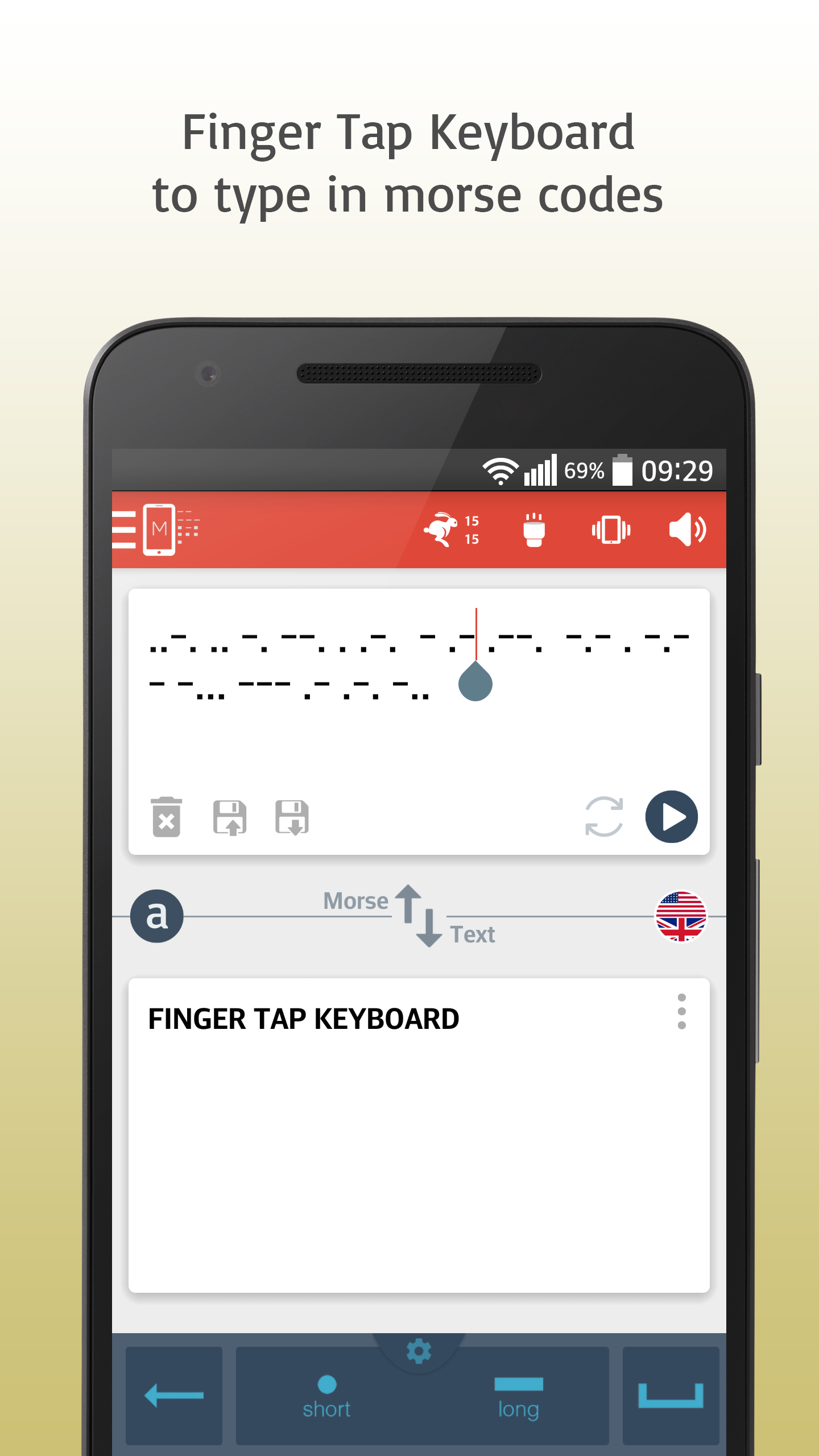 Morse-Code Übersetzer Sie benötigen Text zu übersetzen Codes und umgekehrt zu morsen? Was ist morse Codes leicht mit konfigurierbaren Geschwindigkeit zu lernen? Oder Ausgang in Ton bekommen - Taschenlampe - Vibration? Morse-Code Übersetzer ist, was Sie suchen.