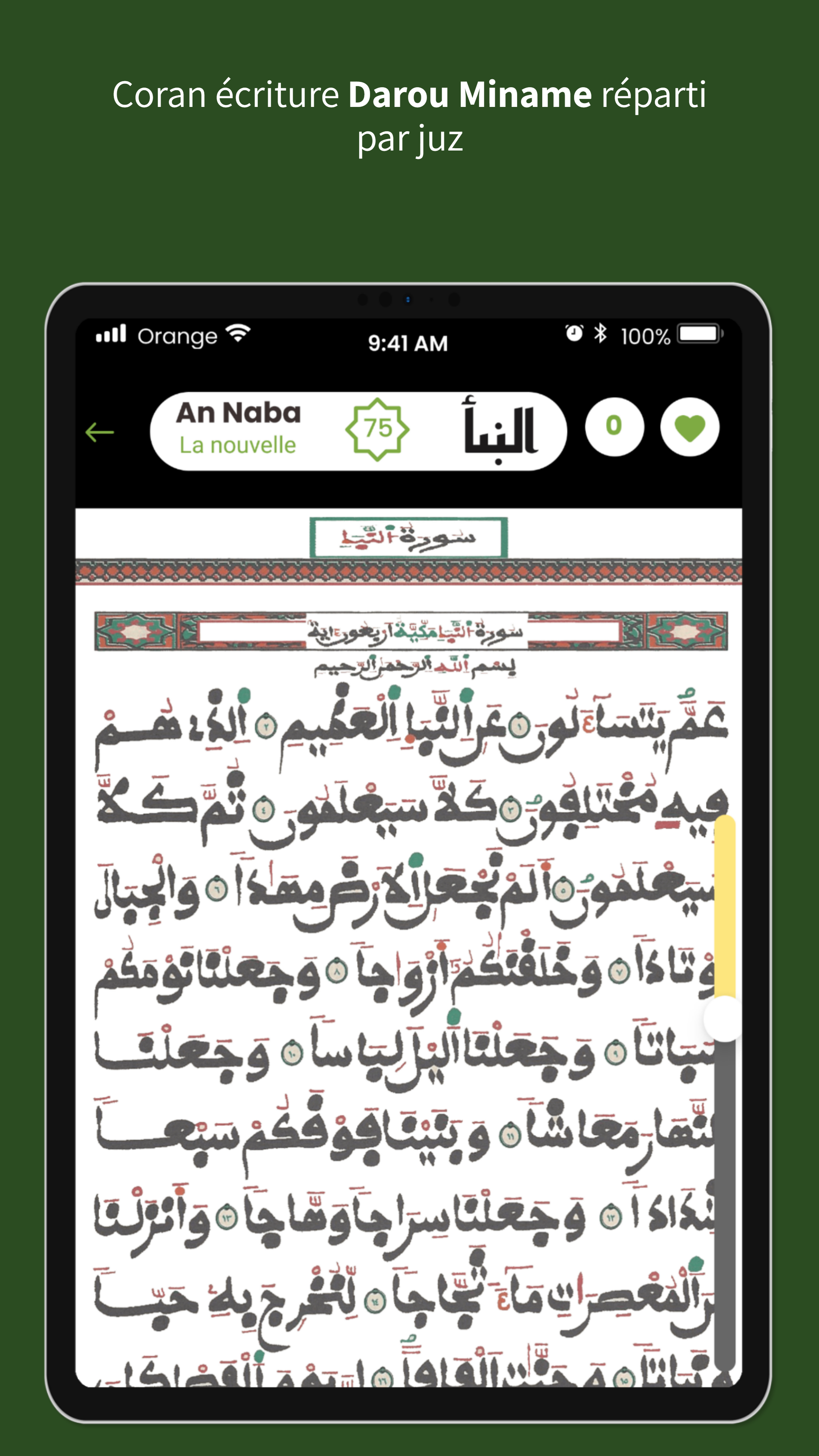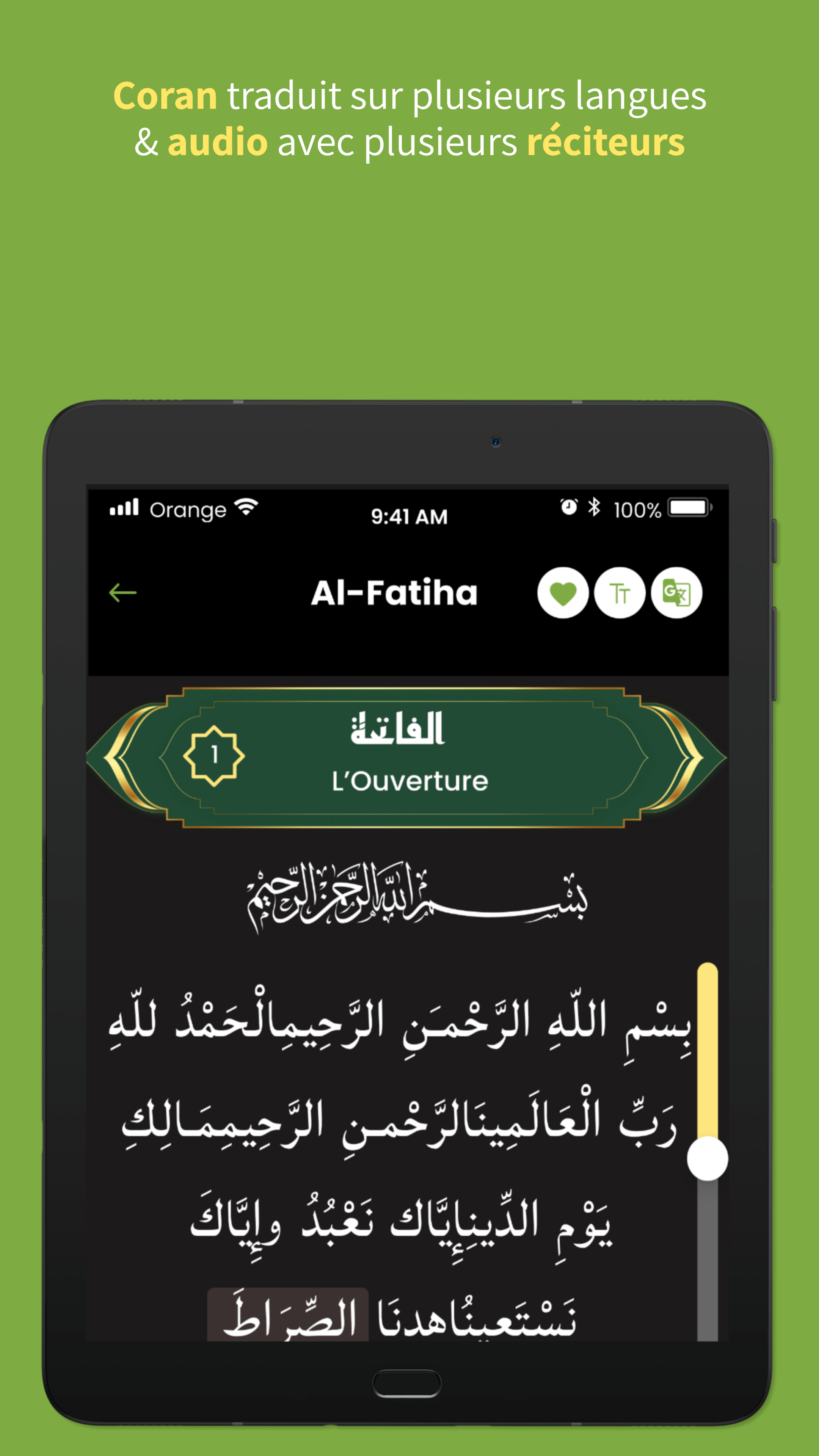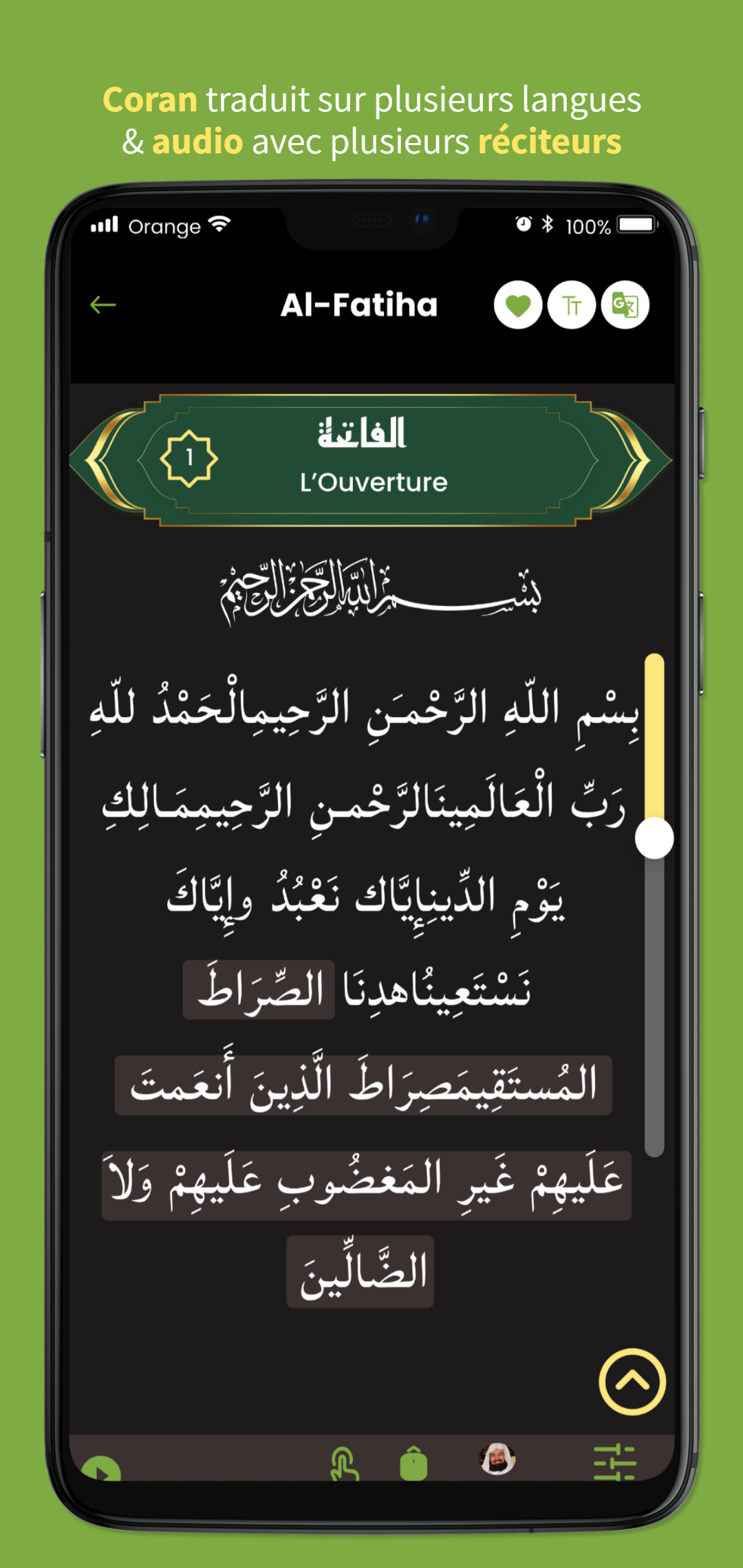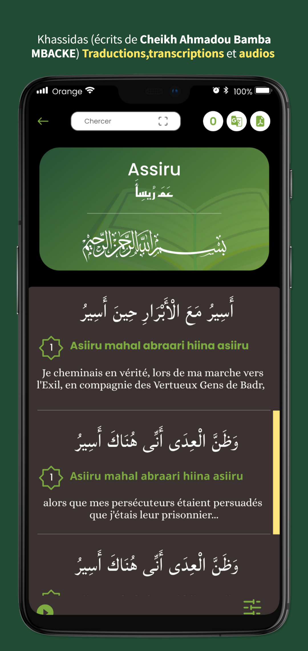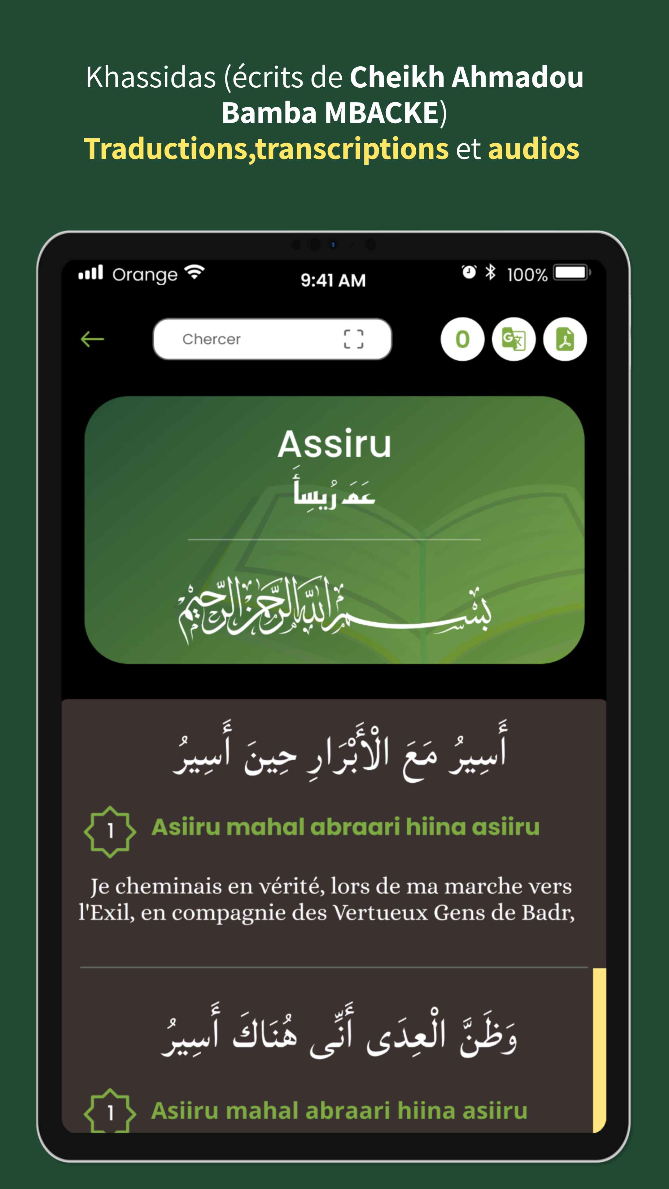 Die Anwendung verfügt über mehr als drei Übersetzungssprachen des Korans und der Khassidas sowie eine Transkription.