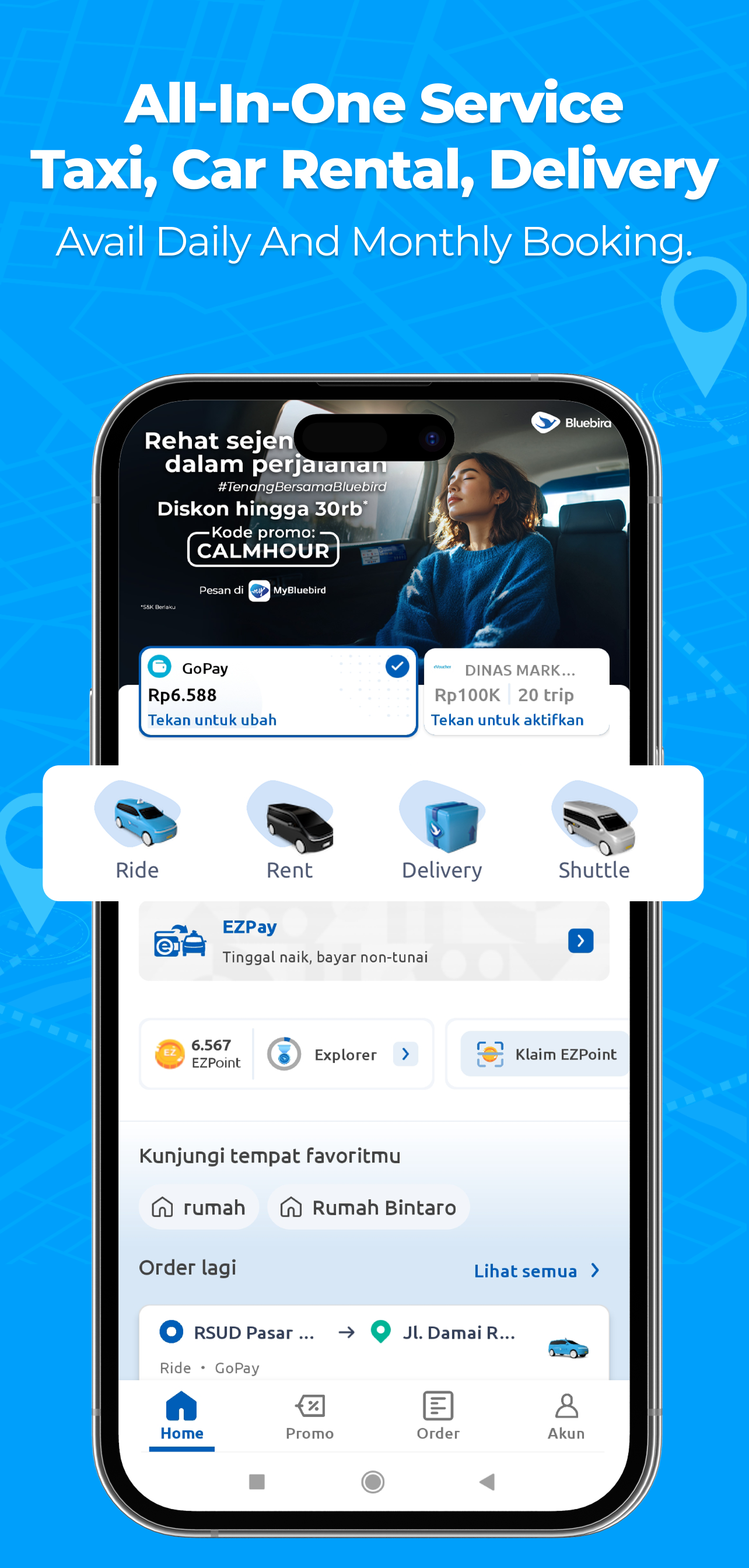 3. Multi-Payment – ​​Bar- und bargeldlose Optionen: MyBluebird gibt Ihnen die Freiheit, Ihre bevorzugte Zahlungsmethode zu wählen. Bargeld ist weiterhin verfügbar, Sie können aber auch mit verschiedenen bargeldlosen Optionen bezahlen, darunter Kreditkarten, eVoucher, Reisegutscheine, GoPay, ShopeePay, LinkAja, DANA, i.saku und OVO. Mit diesen Optionen wird das Buchen und Bezahlen einer Fahrt jederzeit reibungslos.