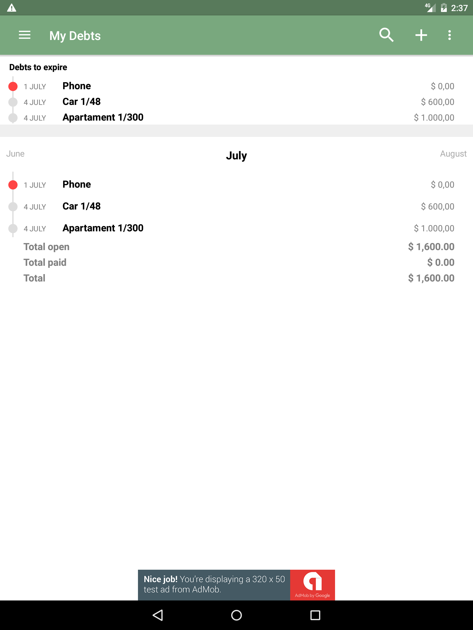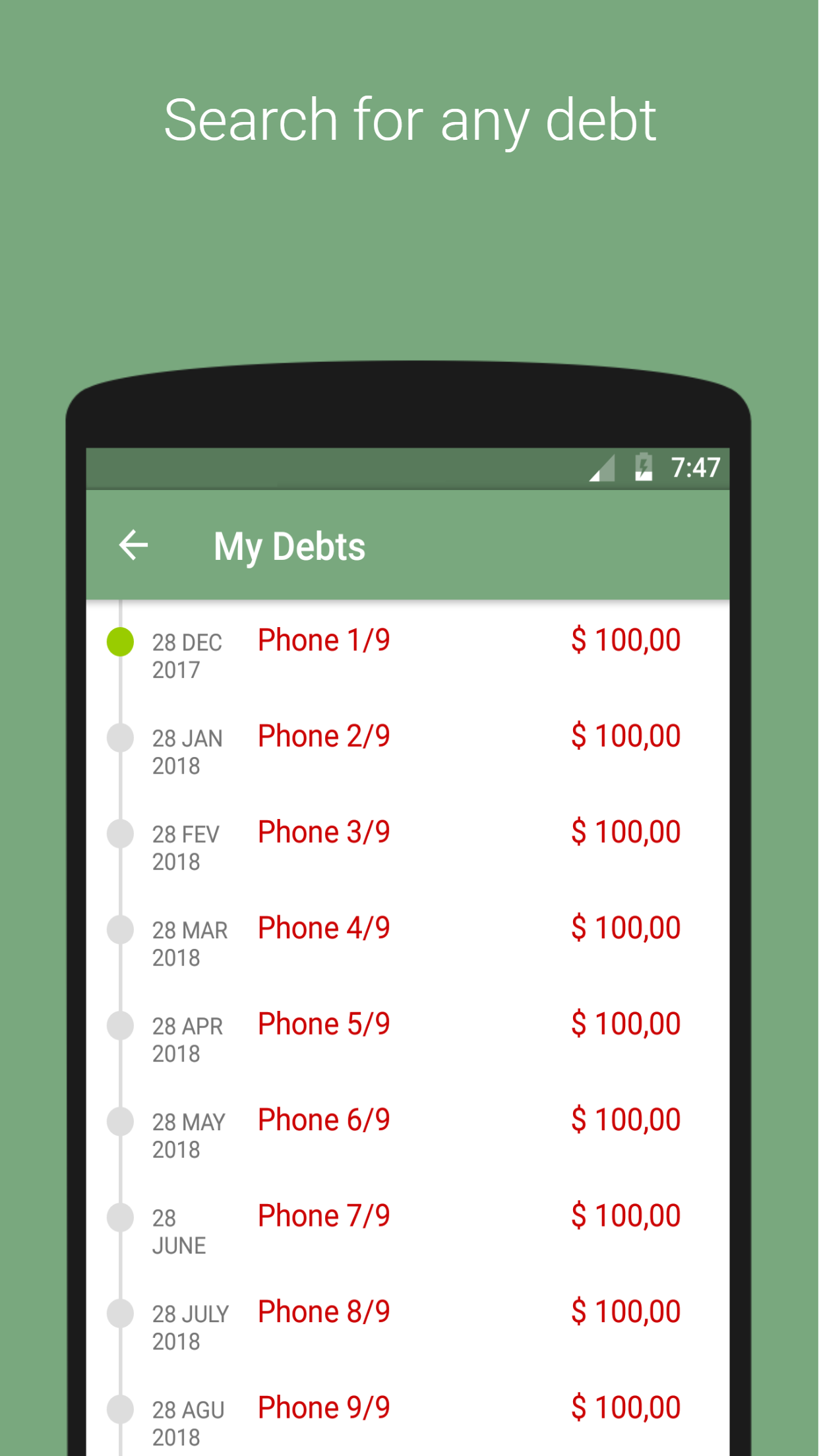 My Debts is an application made for you to have in hand all the control of your finances. Totally free, my debts is geared towards personal finance, focusing on simplicity. We help you organize your finances so you can have more free time. My Debts helps you get out of your old notebook, from your confusing worksheets. Without needing internet connection, you can make all your queries and notes as soon as you connect, all your information will be saved automatically. Even if you switch devices, just log in so that all the information will be loaded Features: * Revenue and expenses register * Quickly view all your debts month to month * Always see the next 3 debts so you will not be late * Alert notifications whenever a debt is close to maturity * Configure alert notifications * Revenue and expense graphs * Research your debts or revenue * Back up all your debts Facebook: https://www.facebook.com/minhasdividasapp/