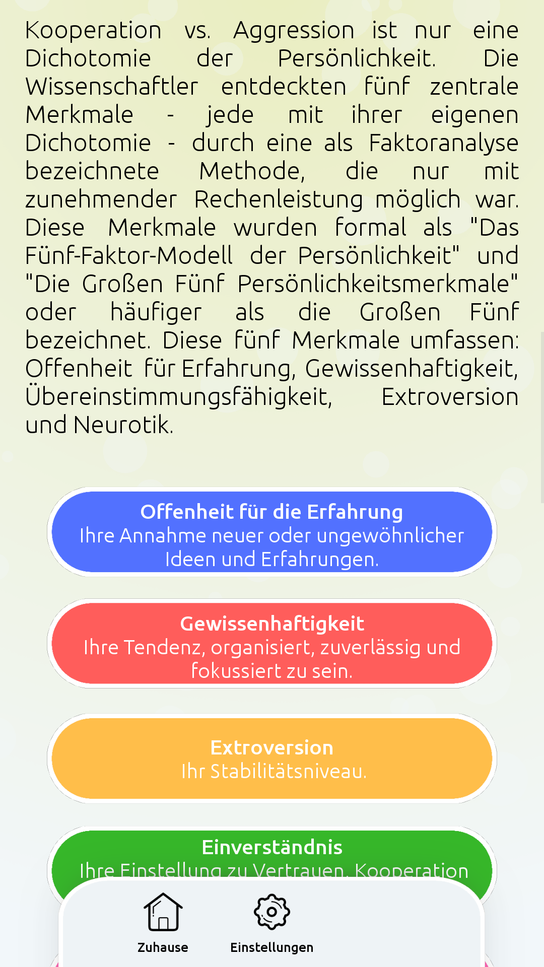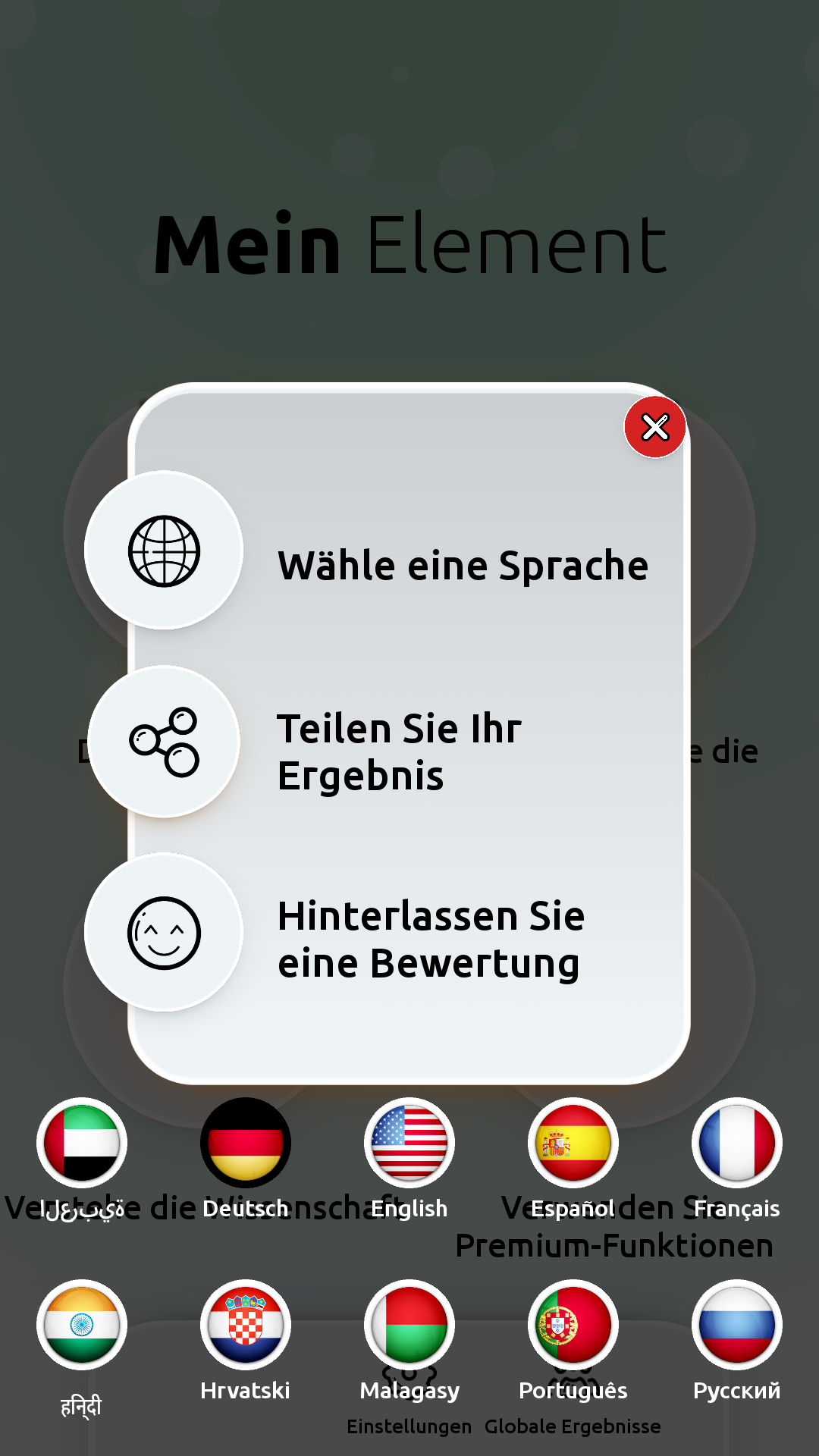 ☆ Enthülle dein Element und verstehe deine eigene Persönlichkeit besser. ☆ Lernen Sie, andere als Wasser, Wind, Erde oder Feuer genau einzustufen. ☆ Sehen Sie, wie Ihr Element mit anderen Elementen interagiert und teilen Sie Ihr Ergebnis. ☆ Entdecken Sie die neueste Persönlichkeitstheorie durch einfache Infografiken. ★ Herausforderung: Sehen Sie, ob Sie die Elemente Ihrer Freunde erraten können, bevor sie das Quiz auch machen! Schnelle Einführung: Mein Element ist eine Vereinigung zwischen zeitgenössischer Persönlichkeitstheorie und archaischem Wissen über die vier Kernelemente: Wasser, Wind, Feuer und Erde. Es ist eine Ehe zwischen Wissenschaft und Mystik. Wenn Sie sich jemals gefragt haben, welches Element ich bin? oder "Was ist mein Persönlichkeitstyp?", nehmen Sie das 16-Fragen-Quiz, um eine endgültige Antwort zu erhalten. Im Abschnitt "Verstehen Sie die Wissenschaft" können Sie nachlesen, warum Mein Element sich von anderen Persönlichkeitstests oder Persönlichkeitsfragen unterscheidet. Sie können auch die globalen Ergebnisse aller anderen Teilnehmer sehen. Die App ist auch in 10 verschiedenen Sprachen übersetzt.