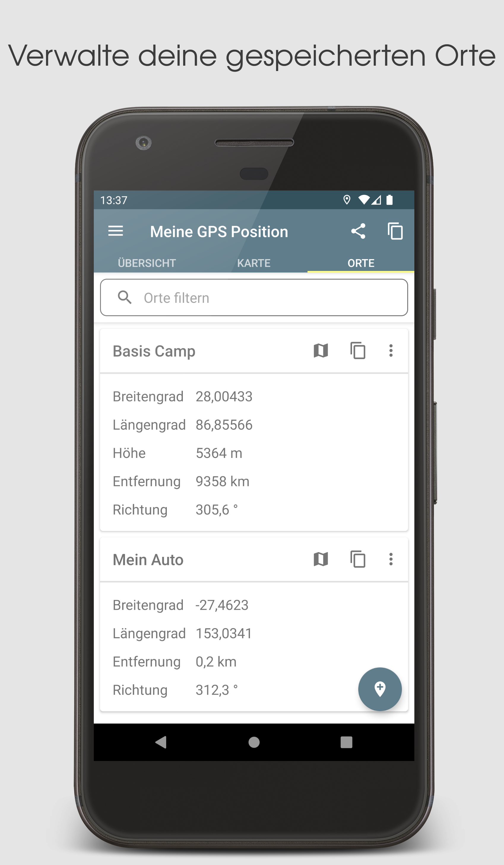 Meine GPS Position zeigt dir die beste verfügbare Position basierend auf Geolokationsdaten von allen aktuell verfügbaren Standortanbietern wie GPS oder WLAN. Die App ist ideal für alle Aktivitäten, die GPS-Koordinaten in Echtzeit benötigen, wie z.B. Geocaching oder Segeln. Auch in der Astronomie und Astrofotografie ist es unerlässlich, genaue Koordinaten und Höhenangaben zu haben, um die Ausrichtung von Teleskopen und Kameras zu optimieren. Meine GPS Position ist in drei Tabs gegliedert: Der ÜBERSICHT Tab zeigt detaillierte Informationen von den Standortsensoren in Echtzeit: Breitengrad und Längengrad, Höhe, Genauigkeit, Geschwindigkeit und Bewegungsrichtung. Für die Darstellung der Koordinaten stehen verschiedene Formate, z.B. Dezimalgrad oder UTM (Universal Transverse Mercator), zur Verfügung. Längenangaben können in Metern oder Fuß angezeigt werden. Für Geschwindigkeiten werden die Einheiten m/s, ft/s, km/h, mph und kn (Knoten) unterstützt. In der Ansicht KARTE kannst du einfach entdecken, was sich in deiner Umgebung befindet und Orte sehen, die du gespeichert hast, z.B. den tollen Strand vom deinem letzten Urlaub, den Ankerplatz vom letzten Segeln oder einfach nur die Stelle, wo dein Auto parkt. Durch langes Drücken auf der Karte kannst du neue Orte hinzufügen. Um einen bereits gespeicherten Ort zu verschieben, halte ihn lange gedrückt und ziehe ihn an die neue Position. Alle gängigen Kartentypen wie Straßenkarte oder Satellit werden unterstützt. Im Tab ORTE kannst du deine Lieblingsorte speichern, bearbeiten und löschen und sehen, wie weit sie von deinem aktuellen Standort entfernt sind. Das ist sehr nützlich, wenn du auf Reisen bist und die aktuelle Entfernung nach Hause wissen möchtest. Zur Berechnung der Entfernung wird das WGS84 Ellipsoid verwendet. Von überall in der App kannst du deine aktuelle Position über deinen Lieblingsmessenger teilen. Deine Freunde erhalten deine GPS Koordinaten und einen Link zu Google Maps mit deiner Position. Im Notfall kannst du mit dieser App eine SMS mit deinem GPS-Standort schicken, selbst wenn keine Internetverbindung verfügbar ist. Zusätzlich kannst du deine GPS-Koordinaten in die Zwischenablage kopieren und sie in Karten-Apps, Chats oder E-Mails einfügen. Ob im Notfall, auf Reisen, beim Geocaching, Segeln, Astronomie oder Astrofotografie, mit dieser Standort App siehst du immer zuverlässig deine aktuellen Standort-Koordinaten vom GPS und kannst deinen Standort speichern, so dass du ihn jederzeit wiederfindest.
