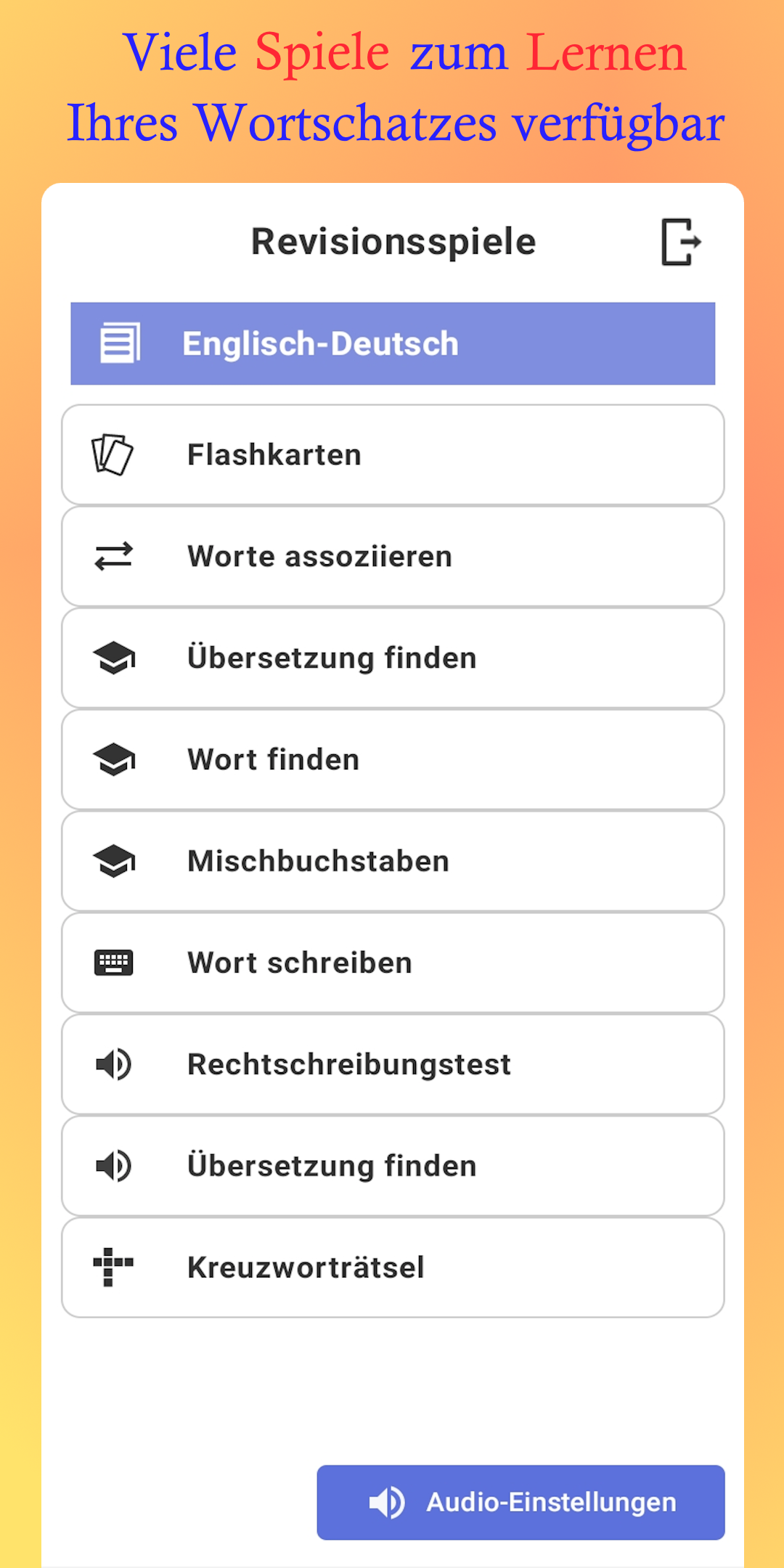 Um Ihnen zu helfen, die Wörter Ihres Wörterbuchs zu lernen und zu merken, enthält "Mein persönliches Wörterbuch" mehrere Spiele: