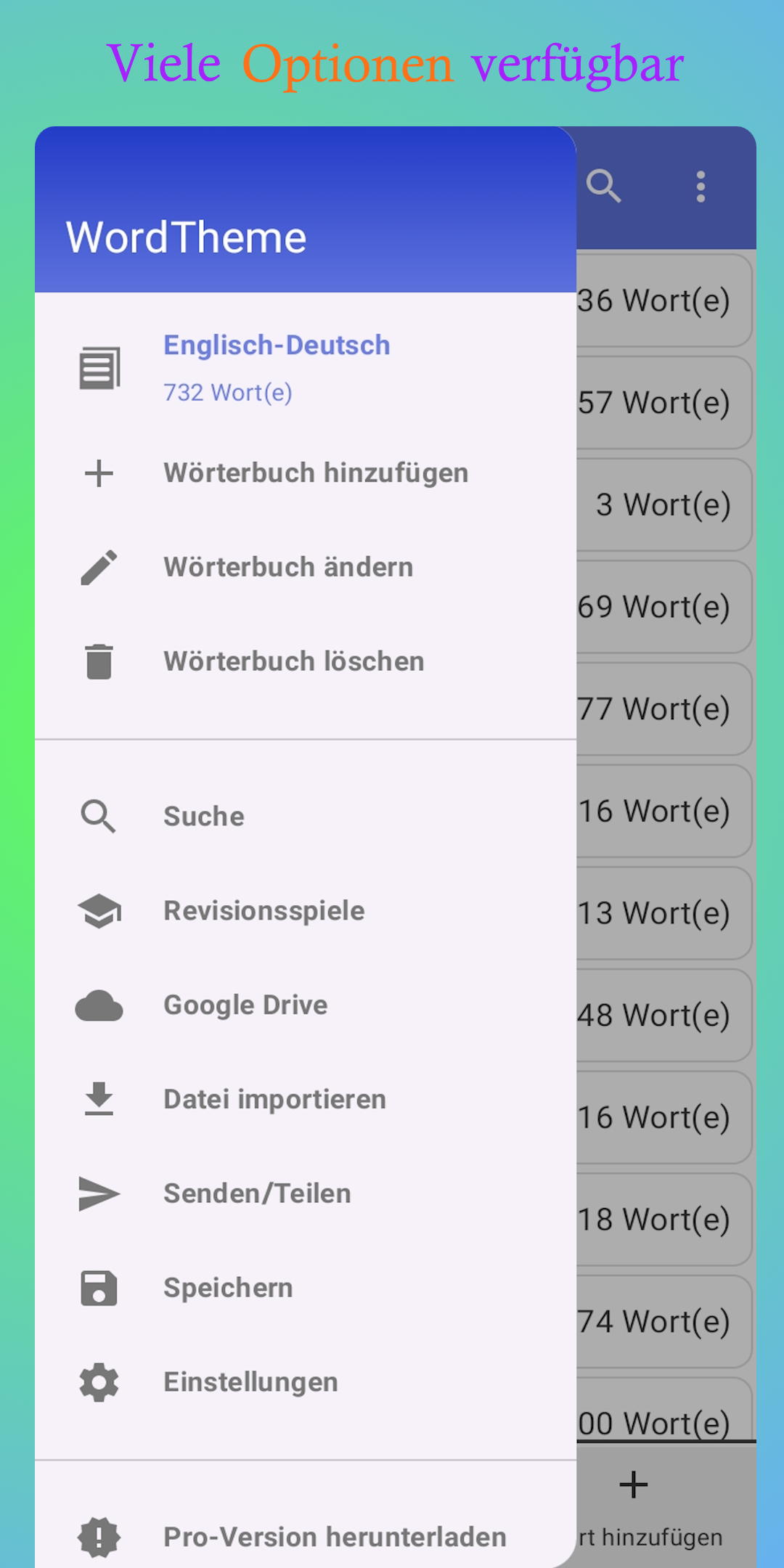 Um die gemeinsame Nutzung zwischen Geräten zu erleichtern, ermöglicht WordTheme das Speichern, Importieren und Synchronisieren der Dictionaries über Google Drive.