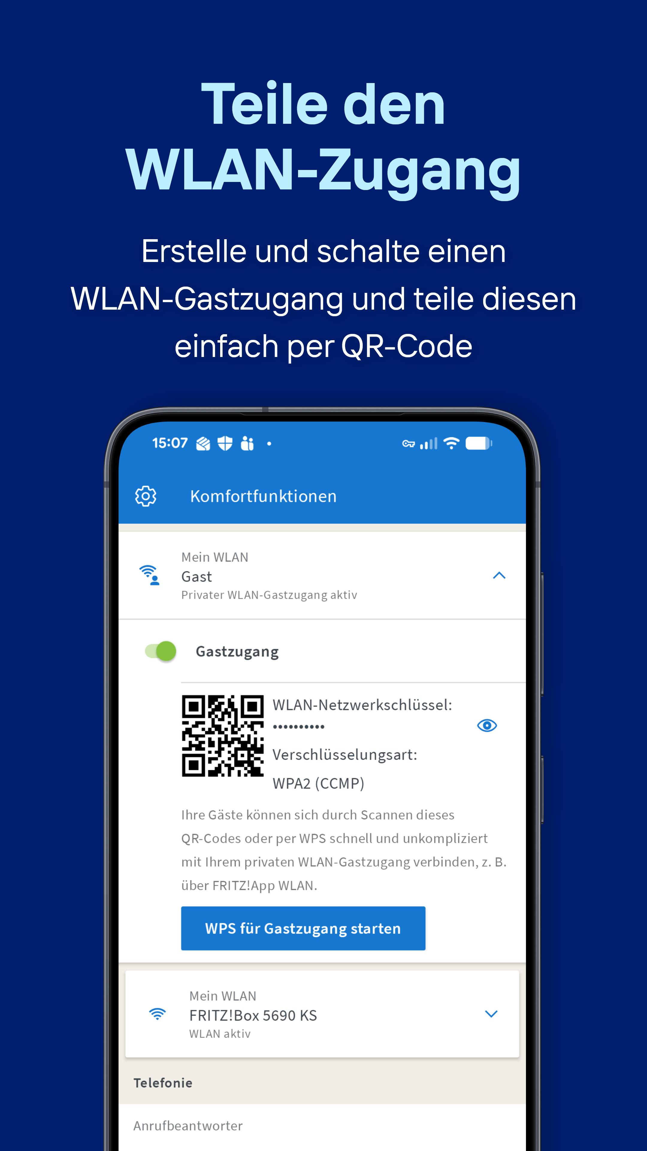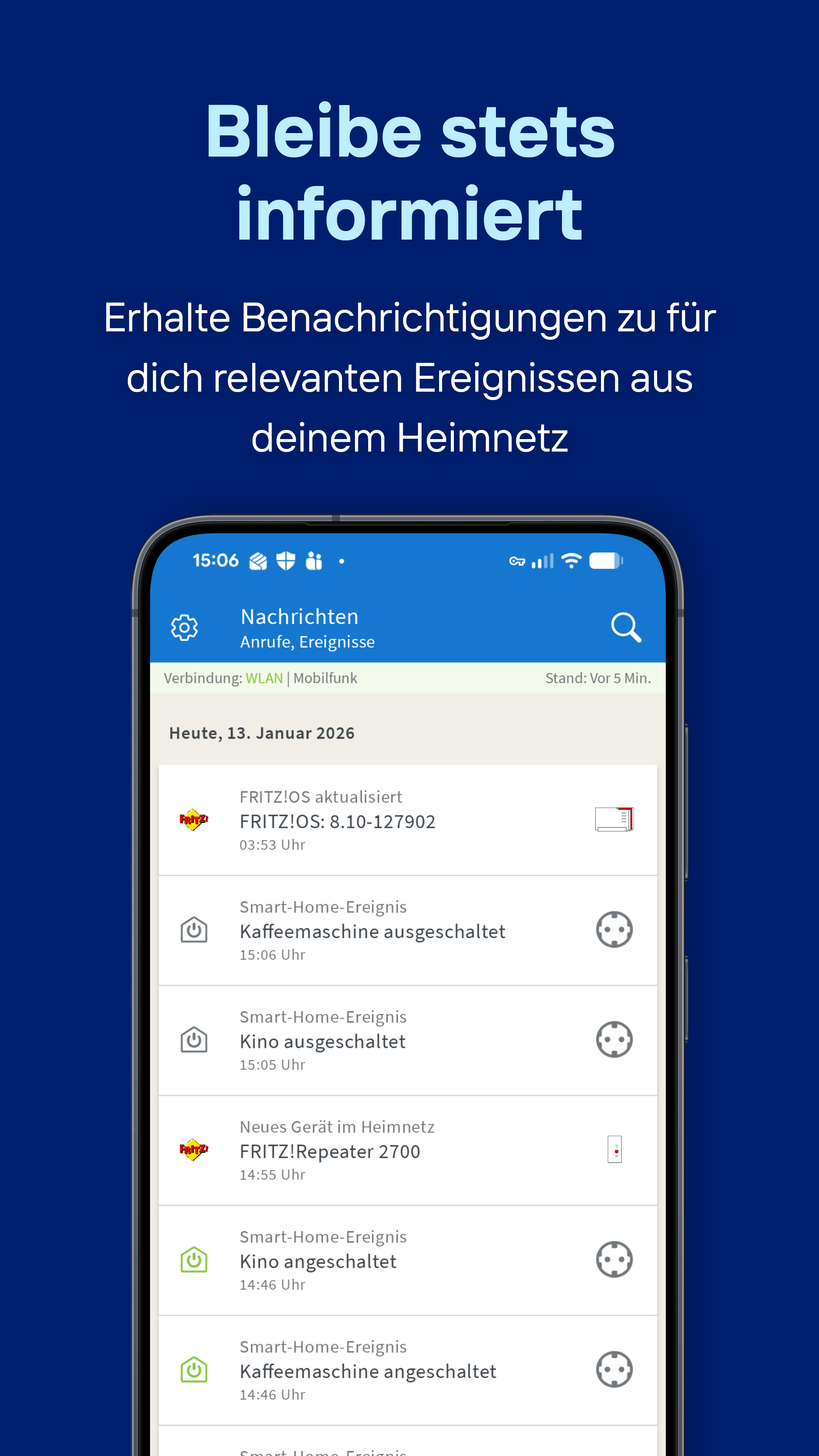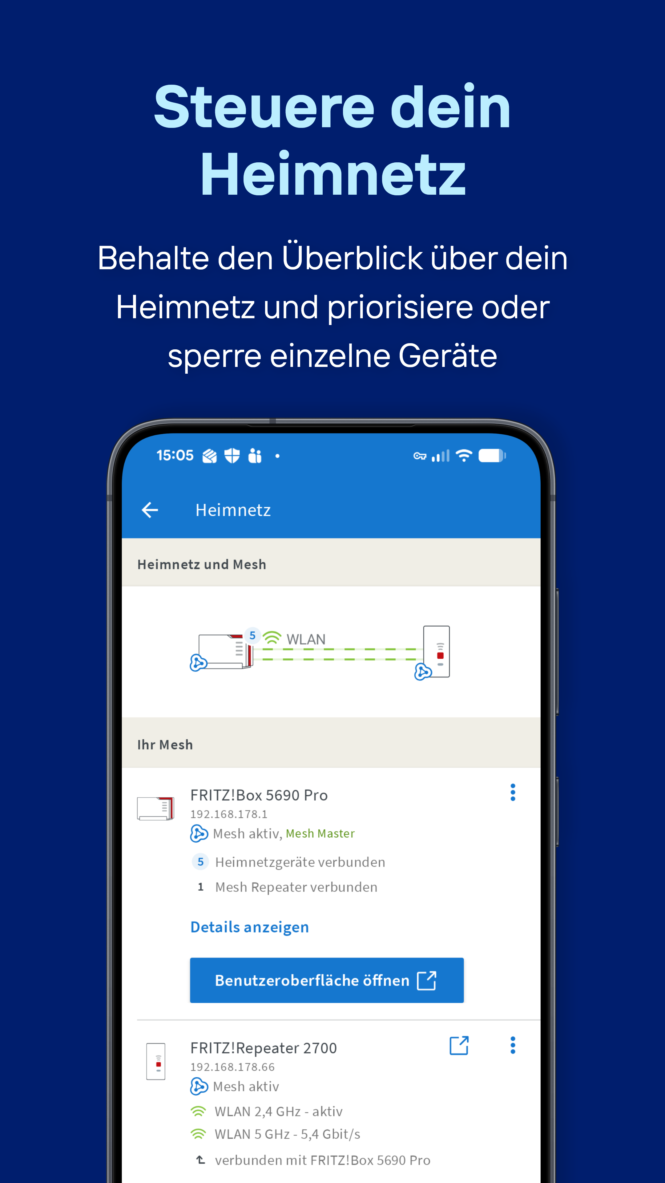 Die MyFRITZ!App ist Dein Schlüssel zu einem intelligenten und sicheren Heimnetzwerk. Mit dieser App hast Du jederzeit und von überall die volle Kontrolle über Deine FRITZ!Box und alle verbundenen Geräte. Einfache Einrichtung neuer FRITZ!-Produkte Dank des smarten Einrichtungsassistenten integrierst Du neue FRITZ!Boxen und FRITZ!Mesh Sets mühelos in Dein Heimnetz. Der Assistent führt Dich Schritt für Schritt durch die Einrichtung und stellt sicher, dass alles auf Anhieb läuft. Steuerung Deines Heimnetzes Behalte den Überblick über alle Geräte und Ereignisse in Deinem Heimnetz. Mit der MyFRITZ!App kannst Du Geräte priorisieren, den Internetzugang für ausgewählte Geräte sperren, Geräte umbenennen, und vieles mehr. Mit wenigen Klicks kannst Du außerdem eine geschützte und private VPN-Verbindung zu Deiner FRITZ!Box herstellen, um auch unterwegs auf Geräte in Deinem Heimnetz zuzugreifen. Dank der MyFRITZ!App hast Du stets die volle Kontrolle über Dein Heimnetz. WLAN-Zugang teilen Richte einen WLAN-Gastzugang ein und teile diesen bequem per QR-Code. So ermöglichst Du Deinen Gästen einen schnellen und sicheren Internetzugang, ohne das Passwort Deines Heimnetzes preiszugeben. Natürlich kannst Du auch den Zugang zu Deinem Heimnetz unkompliziert teilen. Zugriff auf Deine private Cloud Mit dem in Deiner FRITZ!Box integrierten NAS-Speicher greifst Du von überall auf Deine darauf gespeicherten Daten zu. Ob Fotos, Videos oder Dokumente – Deine Daten liegen sicher bei Dir zu Hause. Benachrichtigungen in Echtzeit Bleibe stets informiert über wichtige Ereignisse in Deinem Heimnetz. Die MyFRITZ!App benachrichtigt Dich sofort über entgangene Anrufe, neue Sprachnachrichten oder verfügbare Updates für Deine FRITZ!Box. Erlebe mit der MyFRITZ!App ein neues Level an Komfort und Sicherheit für Dein Heimnetz. https://fritzhelp.avm.de/help/privacy/de