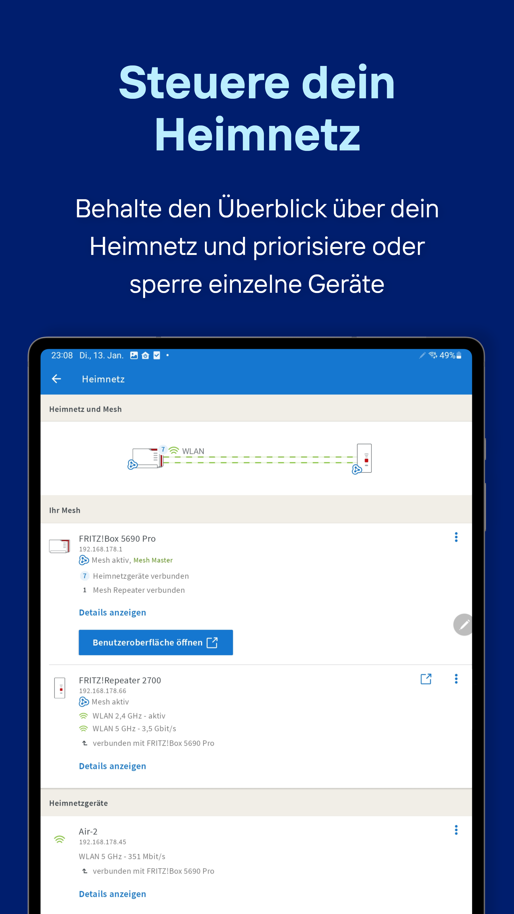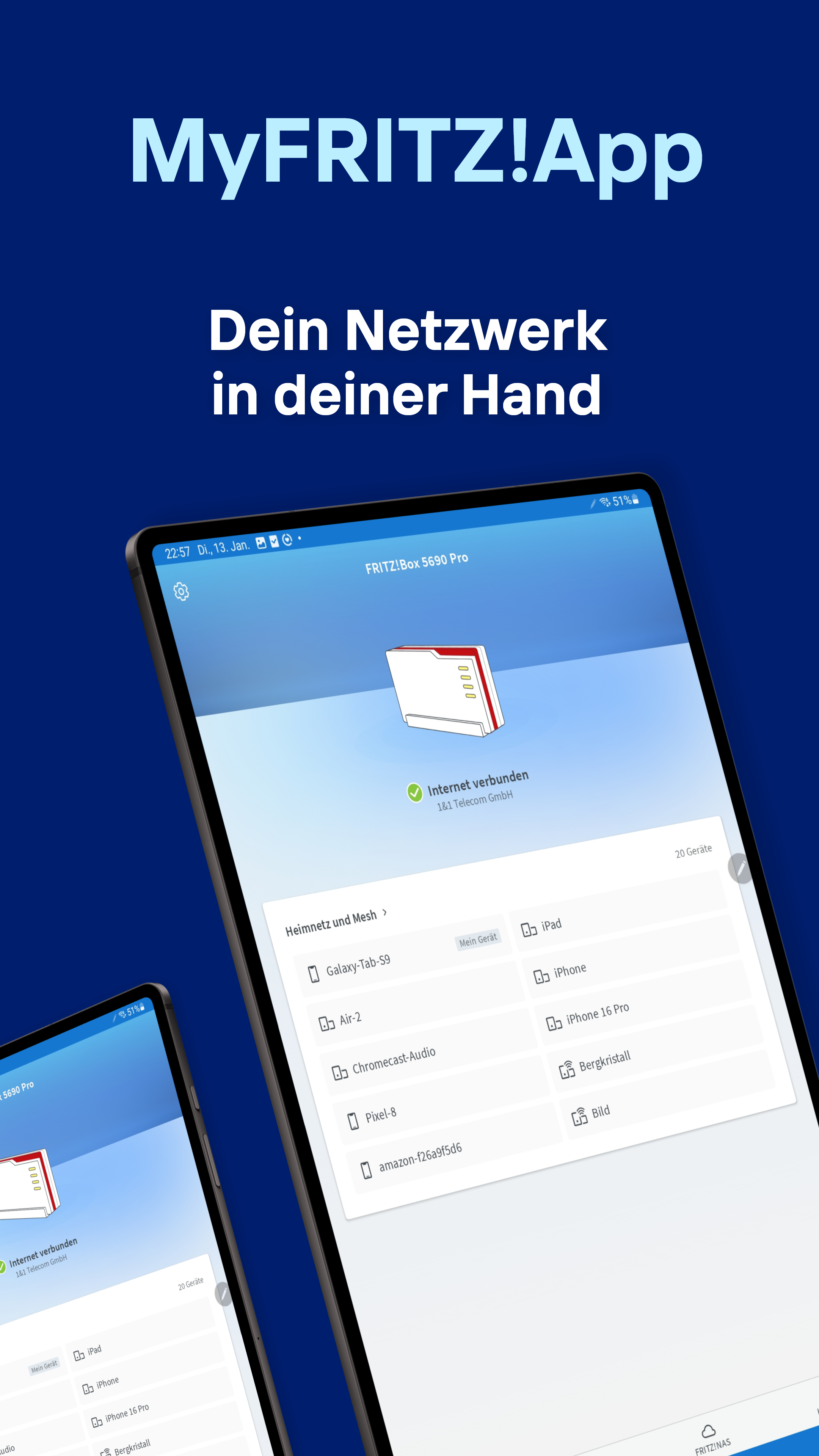 Die MyFRITZ!App bietet Ihnen sicheren Zugriff auf Ihre FRITZ!Box und Ihr Heimnetz, um smarte Geräte zu steuern und auf persönliche Daten zuzugreifen, wo immer Sie auch sind.