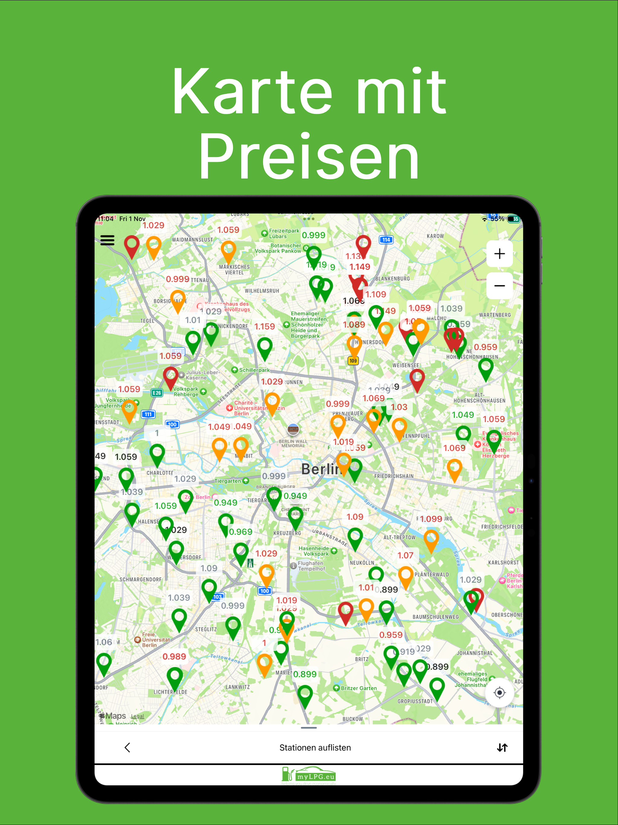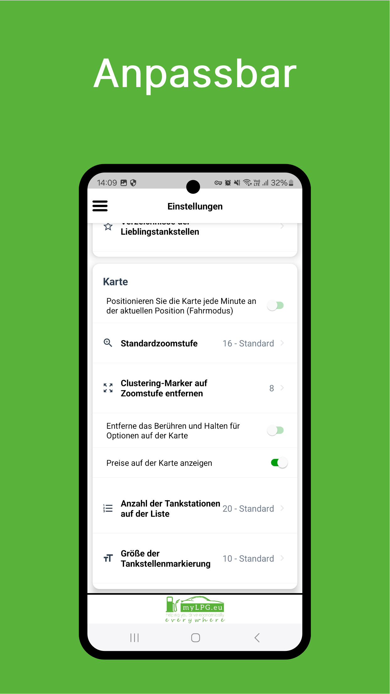 - mehrere Favoritenordner (z. B. „In der Nähe von Zuhause“, „Günstigeres LPG“, …)