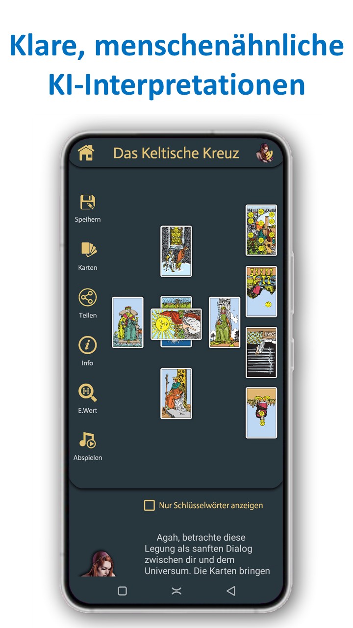 • KI-gestützte Tarot-Interpretationen mit natürlicher, menschlicher Stimme