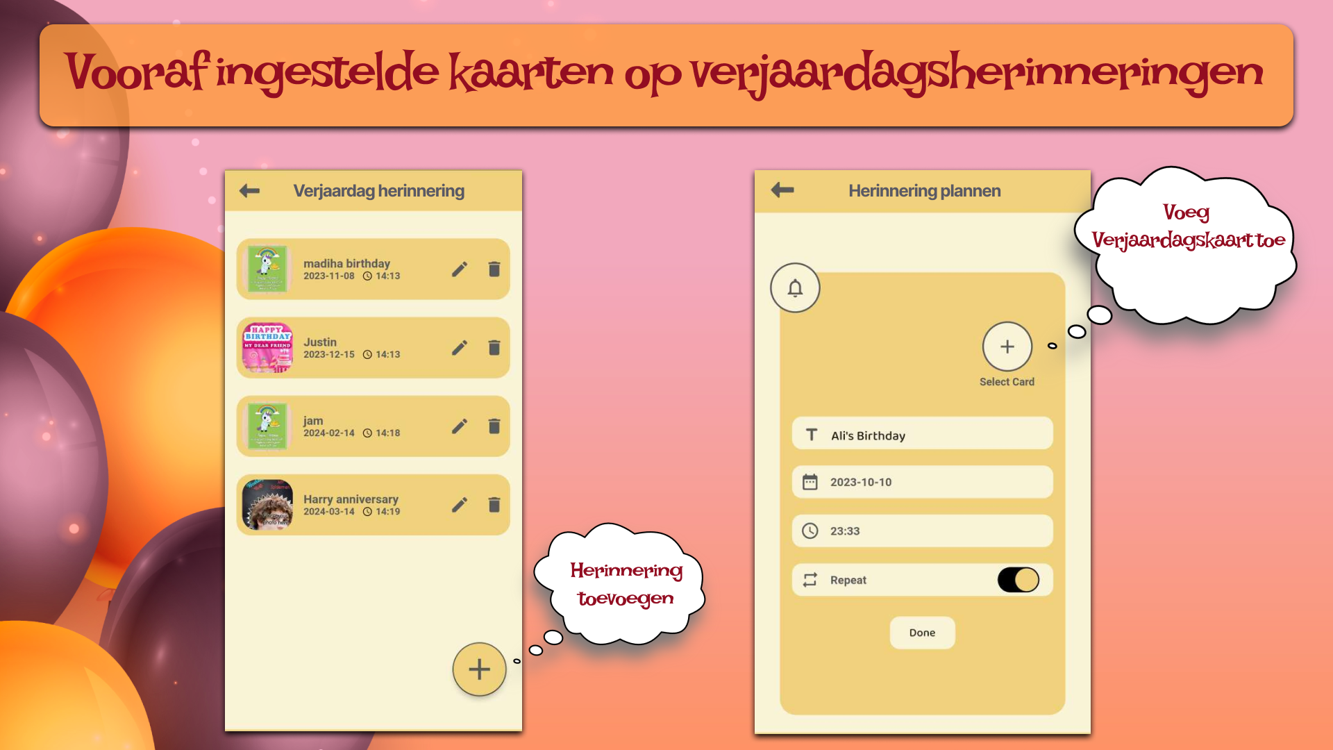 Suchen Sie nach Ideen, um Ihren Liebsten an ihrem Geburtstag eine besondere Freude zu bereiten? Dann sind Sie hier genau richtig! Nutzen Sie die Geburtstagstorte mit Namensfoto und Audiosongs. Wir bieten Ihnen Geburtstagstorten, Geburtstagskarten und Rahmen, mit denen Sie den besonderen Anlass Ihrer Liebsten noch schöner gestalten können. Wählen Sie Ihr eigenes Design für Geburtstagstorte, Karte und Rahmen. Fügen Sie ein Bild hinzu, schreiben Sie Ihren Namen auf die Torte und drücken Sie Ihre Gefühle mit persönlichen Geburtstagswünschen in verschiedenen stilvollen Schriftarten und Farben aus. Die Geburtstagstorte mit Namensfoto und Audiosongs bietet Ihnen verschiedene Kategorien bearbeitbarer E-Cards, Rahmen, Sticker und Torten für jeden Geschmack, darunter Geburtstagskarten für die Familie, Geburtstagskarten für beste Freunde, Geburtstagskarten für den Ehemann und den Freund, Geburtstagskarten für den Lehrer und vieles mehr. Versenden Sie jetzt Geburtstagswünsche, personalisierte Geburtstagsgrüße, Karten und Fotos wie ein Profi mit fantastischen Bearbeitungsoptionen: Ändern Sie die Größe von Fotos, vergrößern und verkleinern Sie sie, fügen Sie Text in verschiedenen stilvollen Schriftarten und Farben hinzu und verleihen Sie Ihrer Kreation mit animierten Stickern aus unserer Sticker-Sammlung eine lustige Note. Eine Geburtstagseinladungskarte zu erstellen war noch nie so einfach! Früher war die Gestaltung eigener Geburtstagseinladungen ein zeitaufwändiger und teurer Prozess – das ist jetzt vorbei! Wählen Sie Ihre Lieblingskarte aus unseren Einladungsvorlagen – ob für eine Geburtstagseinladung, Hochzeitseinladung, Geburtskarte oder einfach als Dankeskarte – bearbeiten Sie sie ganz einfach und senden Sie sie an Ihre Lieben. Wenn wir das Wort „Geburtstag“ hören, denken wir als Erstes an ein Geburtstagslied. Es heißt „Happy Birthday to You“. Deshalb bieten wir Ihnen eine riesige Sammlung an Geburtstagsliedern für Ihre Freunde und Lieben. Vergessen Sie nie wieder einen wichtigen Tag! Wir erinnern Sie an alle wichtigen Geburtstage, Jubiläen und andere besondere Anlässe mit der Erinnerungsfunktion „Geburtstagstorte mit Namensfoto und Audiosongs“! Funktionen: • Eine große Auswahl an Tortenkarten und Rahmen mit Foto und Namen Ihrer Freunde, Familie und Lieben an ihrem besonderen Tag. • Alle verfügbaren E-Cards, Rahmen und Torten lassen sich mit Textinhalten wie verschiedenen stilvollen Schriftarten und Farboptionen sowie farbenfrohen Stickern für persönliche Grüße und Nachrichten personalisieren. • Wählen Sie Ihre Lieblingseinladungskarte aus unserer riesigen Sammlung an Einladungsvorlagen, um Ihre Freunde und Familie einzuladen. • Mit der neuesten Sammlung an Geburtstagsliedern machen Sie den Geburtstag Ihrer Freunde und Familienmitglieder zu etwas ganz Besonderem. • Richten Sie Erinnerungen ein und behalten Sie den Überblick über Ihre bevorstehenden Ereignisse, damit Sie keinen großen Tag verpassen. Anwendung: • Tippen Sie auf „HIER STARTEN“. • Klicken Sie auf „Neue Sammlung“ und wählen Sie eine Torte, Karte oder einen Rahmen aus der Kategorie aus. Der Inhalt wird im Editor-Fenster geöffnet. • Bearbeiten Sie die ausgewählte Karte, Torte oder den Rahmen mit Ihren Geburtstagswünschen und Ihrem Namen (mit verschiedenen Farben, Schriftarten, Stilen und Hintergründen) sowie farbenfrohen Stickern. • Wählen Sie die Option „Geburtstagslieder“, um zur Songliste zu gelangen und dort ein beliebiges Lied abzuspielen. • Klicken Sie auf die Erinnerungsoption. Die Kartenkategorien werden angezeigt. Wählen Sie eine aus, um nach Abschluss der Bearbeitung zum Editor-Bildschirm zu gelangen. Klicken Sie auf „Speichern“, um eine Erinnerung einzurichten.