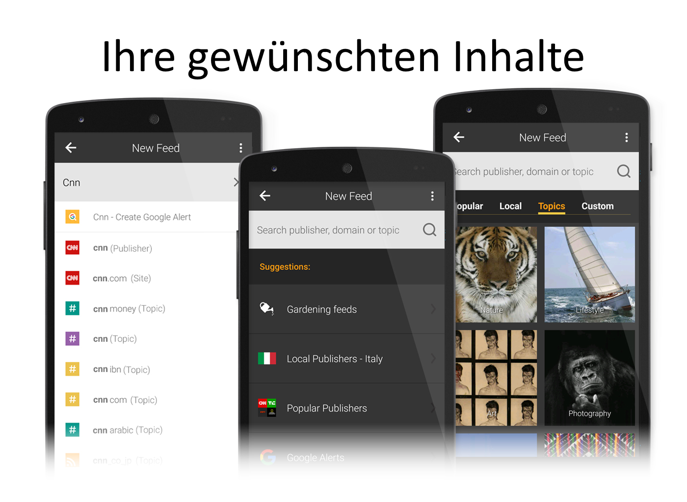 NewsTab funktioniert mit jeder RSS-Quelle, Google News und Twitter, wodurch es super-einfach ist, allen beliebigen Nachrichtenthemen, Hashtags, Blogs, Zeitungen, Zeitschriften und Webseiten zu folgen.