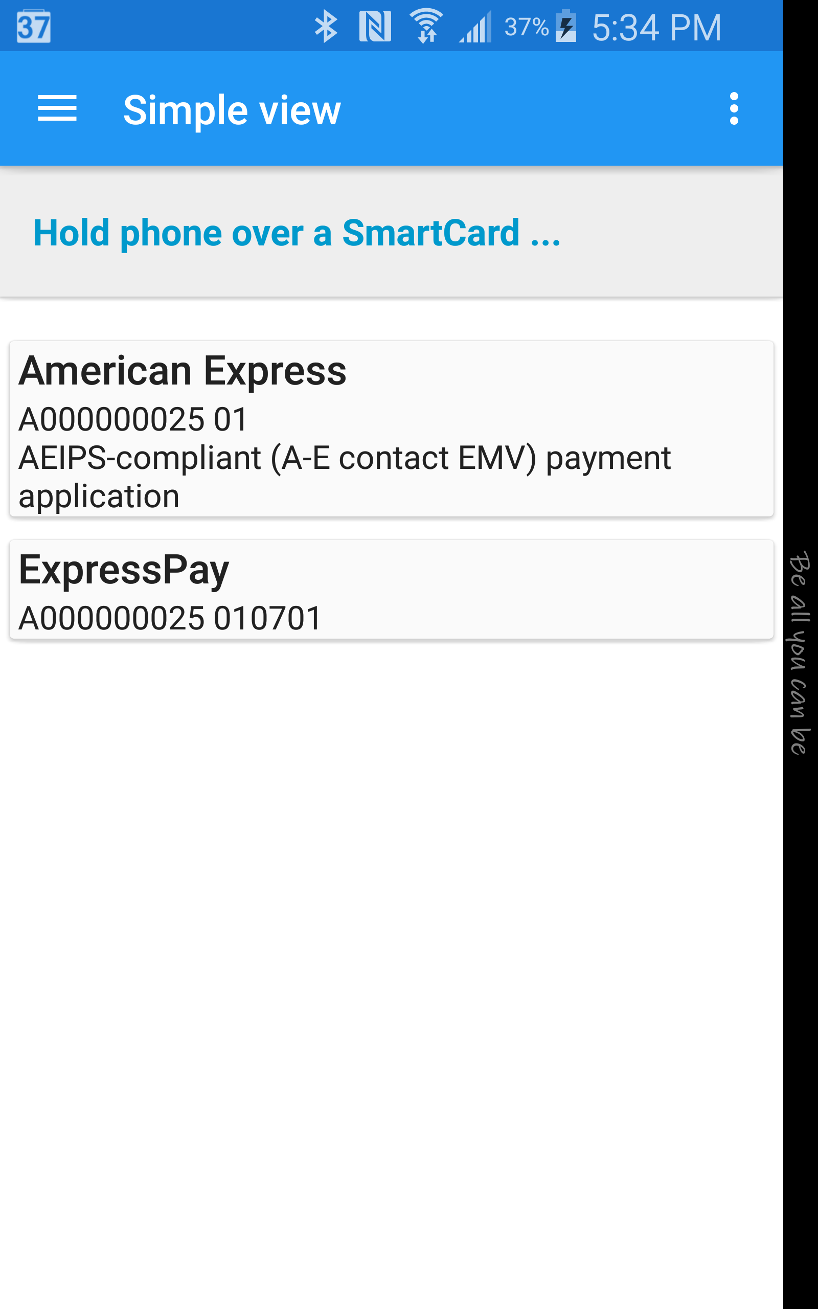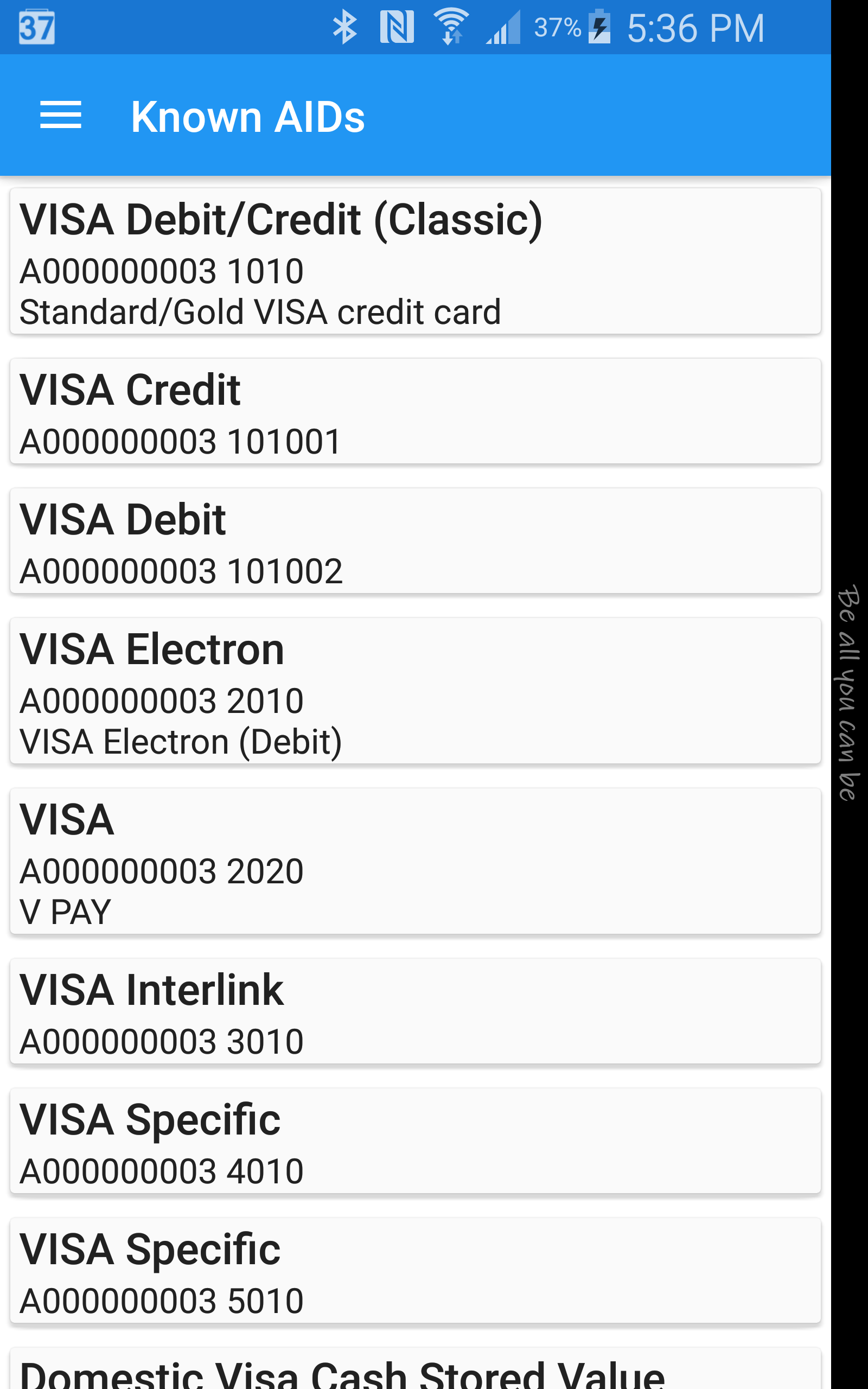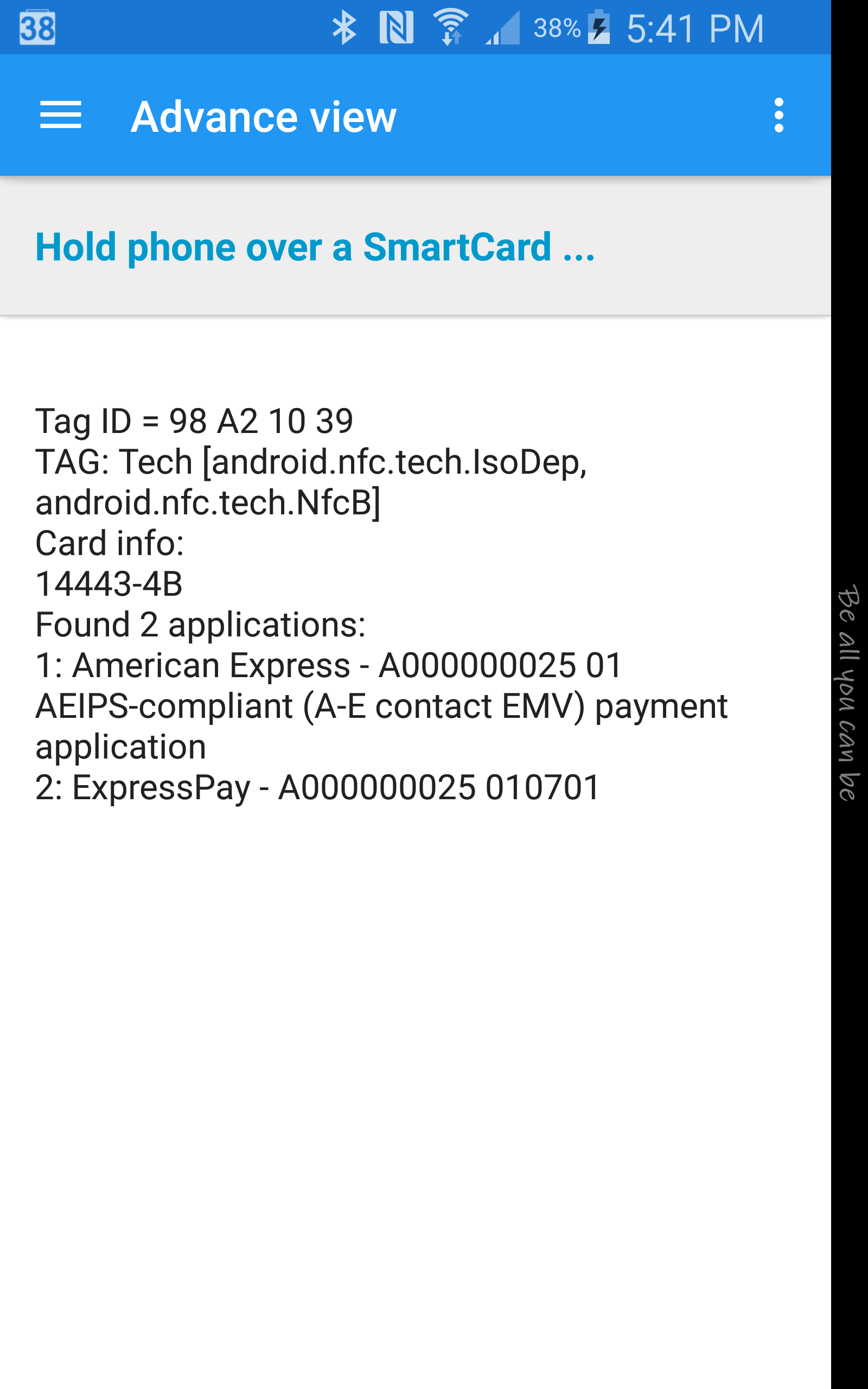 This app shows Secure Element applications (a.k.a Java Card applet or Smart Card application) are installed on a contact-less Smart Card (ISO/IEC 14443-4) or EMV credit card using Android NFC phones. - Show tag ID, tag tech, 14443 card type (A/B), historical bytes - Show name, AID and brief description of detected applets - Log level preference: show various level of log detail including R-APDU via - Show HCE support status + P2P protocol type in About - Material Design UI Notes: - Only work with NFC phones. - This app won't detect custom applet. It only works with known applications (with known AID). - This app is intended for information & development purpose only as I am a NFC developer. - This app does not save or transmit any of the read data. We don't collect data of any kind. Supports 170+ card types such as: - Payment: VISA, Mastercard, Amex, Discover, Google wallet - ICAO Machine Readable Travel Documents (MRTD) - Card manager & Security Domain: VISA, Gemplus, JCOP, GP - CAC (Common Access Card), PIV (Personal Identity Verification) - UnionPay (China), PagoBANCOMAT (Italy), Girocard (Germany), Bankaxept (Norwegian), BAROC (Taiwan), Dankort (Danish), RuPay (India), BelPIC, Banrisul (Brazil), JCB (Japan) ...
