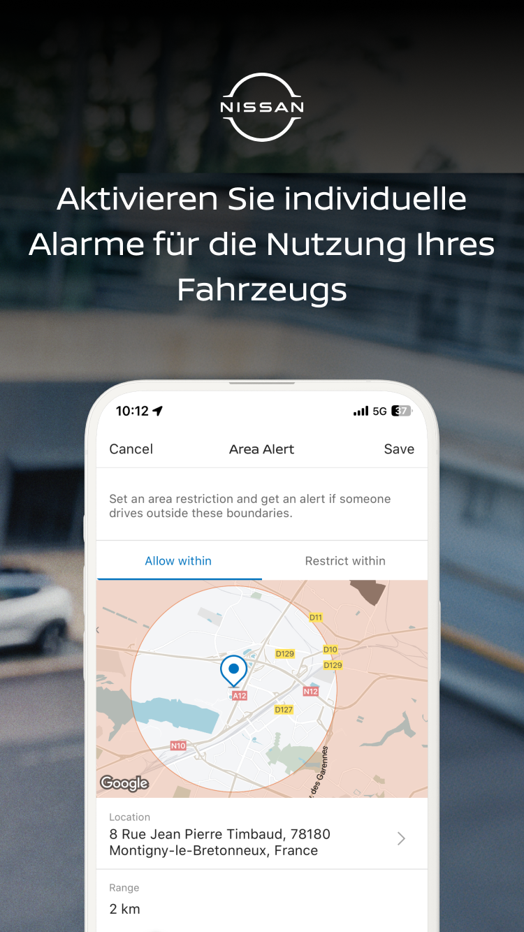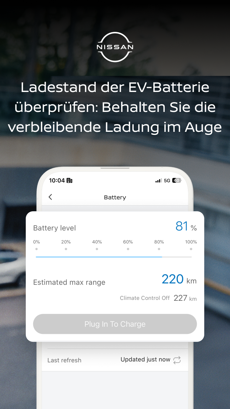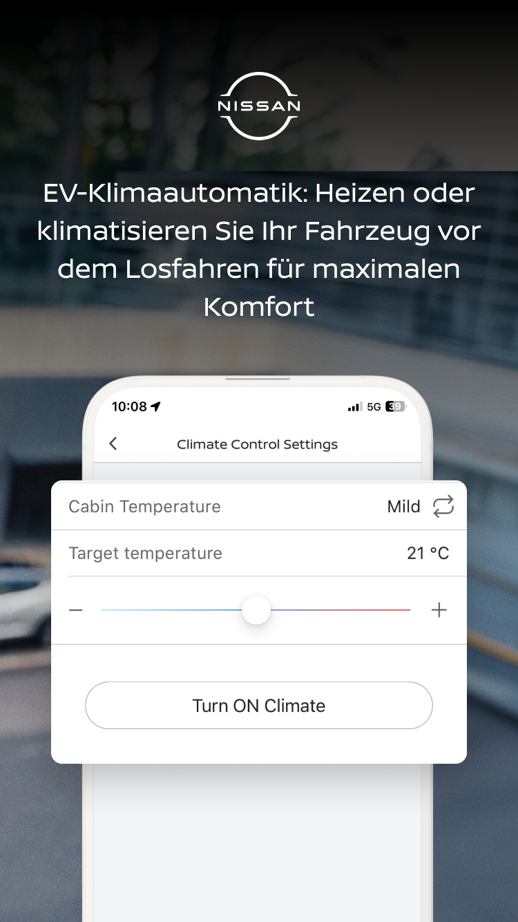 Die NissanConnect Services App definiert Ihr Verhältnis zu Ihrem Nissan ganz neu, indem sie es Ihnen ermöglicht, Ihr Fahrzeug mit Ihrem Smartphone zu verbinden und es darüber zu steuern. LISTE DER KOMPATIBLEN FAHRZEUGMODELLE: - Nissan X-Trail ab September 2022 - Nissan ARIYA ab Juli 2022 - Nissan Qashqai ab Juli 2021 - Nissan LEAF ab Mai 2019 - Nissan Navara ab Juli 2019 - Nissan Juke ab November 2019 - Nissan Townstar EV ab September 2022 - Nissan Townstar ab September 2022 - Nissan Primastar ab November 2023 - Nissan MICRA ab September 2025 Produktionsjahr und -monat sind in den Zulassungsdokumenten vermerkt. Erstellen Sie ein Konto und stellen Sie direkt über die App eine Verbindung her, um alle Funktionen zu entdecken. Die Aktivierung von Services wird mit der App, mit der Sie alle Services und Funktionen hinzufügen und aktivieren können, deutlich einfacher und direkter. Mit der NissanConnect Services App können Sie*: Ihre Welt mit Ihrem Fahrzeug verbinden: - Verbinden Sie Laptops, Tablets oder Smartphones mit dem In-Car WiFi -Hotspot im Fahrzeug. - Rufen Sie Informationen ab und kontrollieren Sie Ihr Fahrzeug per Sprachbefehl. Schnell und einfach an Ihr Ziel gelangen: - Erhalten Sie tägliche, monatliche oder jährliche Fahrberichte. - Planen Sie Ihre Fahrt auf Ihrem Smartphone, indem Sie vor Fahrtbeginn eine Adresse an Ihr Fahrzeug senden. - Nachdem Sie geparkt haben, kann die App Ihren Standort suchen und Sie auf dem letzten Stück des Weges zu Fuß begleiten. Mehr Komfort erleben: - Betätigen Sie Ihre Hupe und Ihre Scheinwerfer aus der Ferne, um stets Ihren Parkplatz finden zu können. - Greifen Sie ganz einfach auf den Kundendienst von Nissan zu. Sicherer an Ihr Ziel gelangen: - Fordern Sie bei einer Panne direkt über Ihr Fahrzeug Unterstützung an. - Überwachen Sie die Nutzung Ihres Fahrzeugs, indem Sie Alarme für seine Geschwindigkeit, den Bereich, in dem es sich befindet, oder Zeiten, zu denen es gefahren wird, konfigurieren. Die Aufladung und den Batteriestatus Ihres Nissan LEAF, ARIYA verwalten: - Stellen Sie die Temperatur in Ihrem Fahrzeug ein, bevor Sie losfahren. - Prüfen Sie den Batteriestatus. - Beginnen Sie den Ladevorgang des Fahrzeugs aus der Ferne. * Die Verfügbarkeit von Funktionen variiert je nach Modell und/ oder Modellklasse. Weitere Informationen erhalten Sie von Ihrem Nissan Händler oder auf unserer Website www.nissan.de