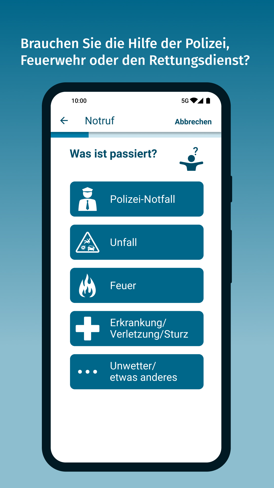 Art des NotfallsÜber nora können Sie sowohl die Polizei als auch Feuerwehr und Rettungsdienst erreichen. Welche Einsatzkräfte Sie benötigen, wird über maximal 5 aufeinanderfolgende Fragen abgefragt, die Sie durch Tippen auf die jeweils passende Option beantworten.