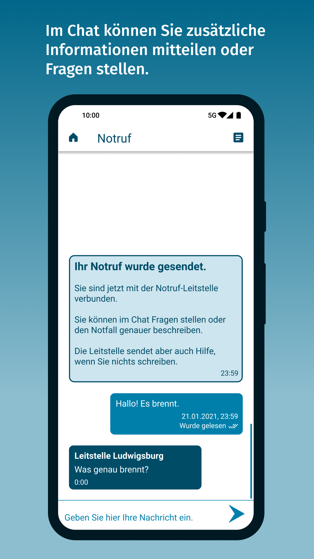 ChatNach dem Absenden des Notrufs sind Sie über eine Chat-Funktion direkt mit einem Mitarbeiter oder einer Mitarbeiterin der Einsatzleitstelle verbunden. So können Sie mehr Informationen zum Notfall weitergeben oder Fragen stellen.