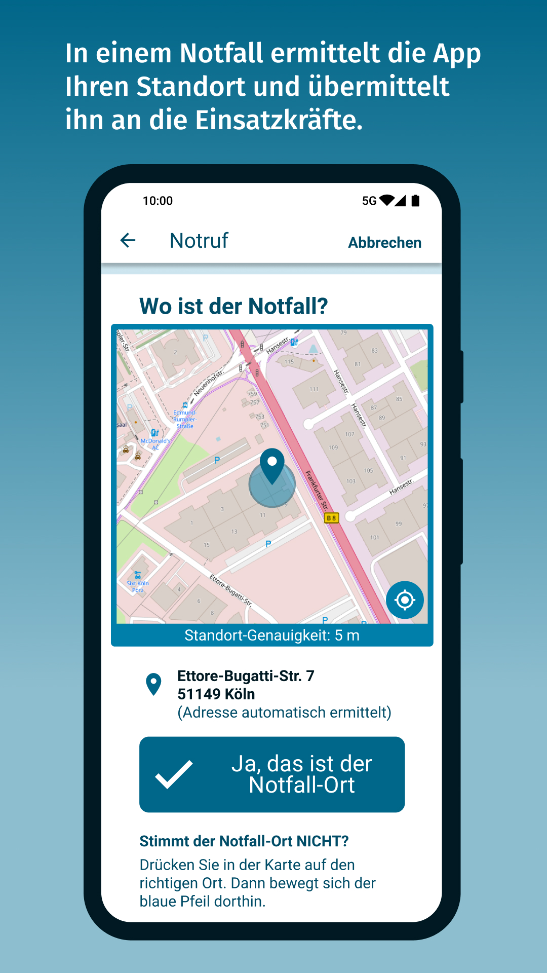 StandortbestimmungDie App nutzt die Standort-Funktion Ihres Mobil-Geräts, um den Notfall-Ort zu ermitteln und sendet ihn automatisch an die zuständige Einsatzleitstelle.
