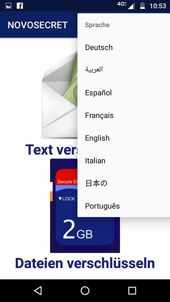 NOVOSECRET verschlüsselt die Dateien und kompakten Ordner auf der SD-Karte, nachdem Sie im SAF-Modus den Stammordner der SD-Karte ausgewählt haben. Wenn Sie Fragen zu dieser Situation haben, können Sie den Link am Ende dieser Seite eingeben, um weitere Informationen anzufordern. Obwohl die Sprache, in der die Anwendung angezeigt wird, über das Menü geändert werden kann, haben wir einen Sprachdetektor hinzugefügt, um den Benutzern den Vorgang zu erleichtern.