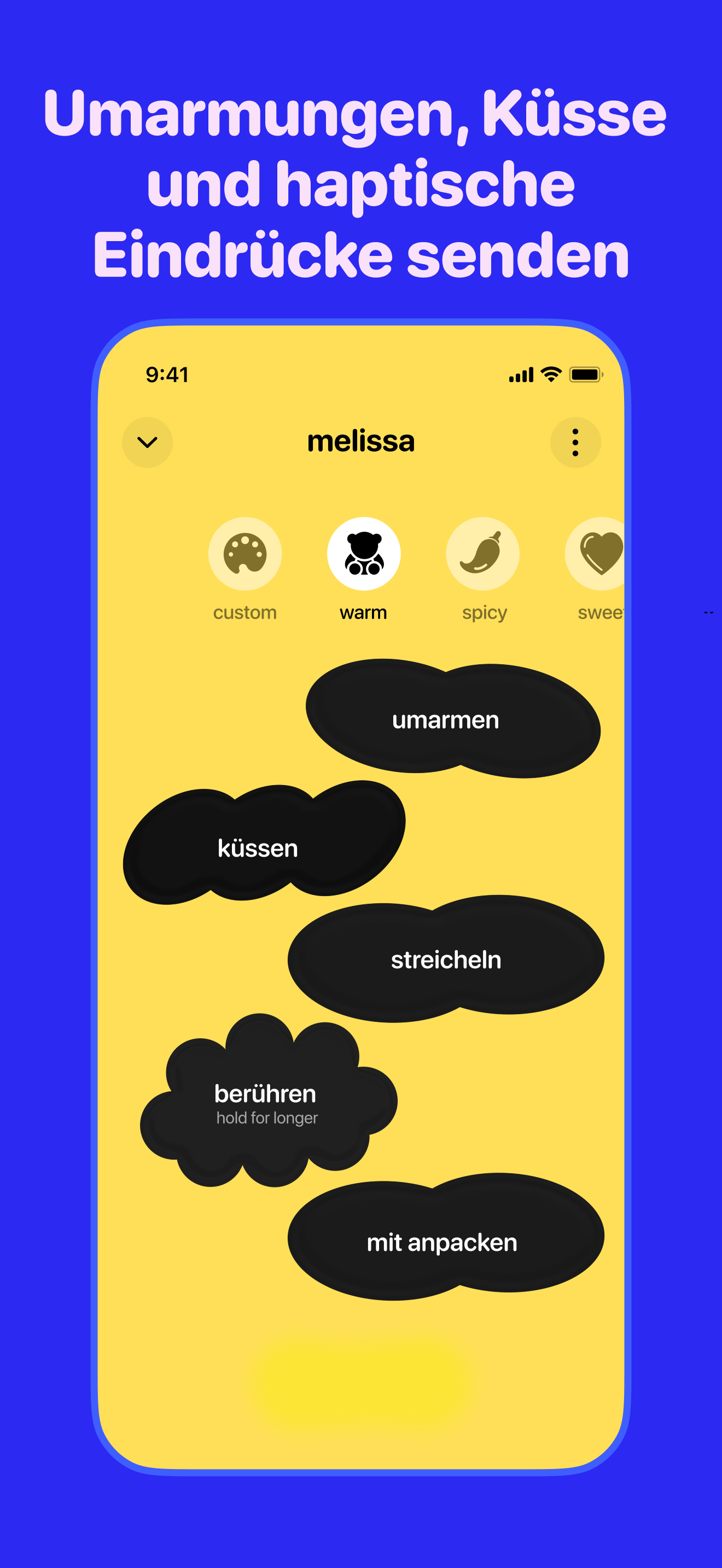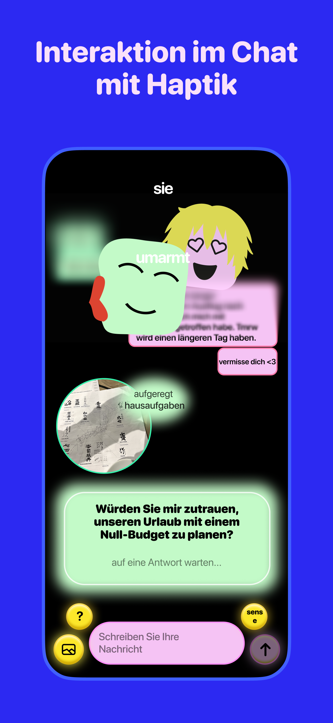 obimy ermöglicht es Ihnen, die Hand des anderen zu spüren und Umarmungen zu erleben, die Sie einander näher bringen als je zuvor. wenden Sie sich an obimy, wenn Sie die Berührung Ihrer Liebsten in einer Fernbeziehung vermissen. treten Sie ein in eine Welt, in der jede Stimmung ein Tor und jede Interaktion eine Brücke ist. verbinden Sie sich mit allen, die Ihnen wichtig sind - mit Partnern, Freunden oder der Familie - und kommen Sie sich so auf noch nie dagewesene Weise näher. Drücken Sie sich frei aus, verbinden Sie sich tief: teilen sie jedes gefühl mit - freude, trauer oder die durchschnittlichen tage dazwischen. ob sie vor liebe strahlen oder den blues fühlen, sie erhalten echte antworten. umarmungen, küsse, verspielte klatschen? obimy versteht sie alle! Reichhaltige Live-Chat-Erfahrung: mehr als nur ein chat - obimy ist ein hafen für tiefe verbindungen. drücke mehr aus als worte sagen können, tausche herzliche gesten aus und wachse mit jeder interaktion näher zusammen. Vertiefen Sie Ihre Beziehungen mit jedem Chat: verbessere deine interaktionen mit spannenden funktionen, die mit deinen beziehungen wachsen. eröffne neue möglichkeiten, dich auszudrücken und zu verbinden, während du dich engagierst. Belohnungen für dein wahres Ich: verdiene dir Belohnungen, indem du authentisch bist. obimy belohnt deine Authentizität mit Preisen, die wichtig sind. intuitive benachrichtigungen: Lass dich von obimy daran erinnern, in Kontakt zu bleiben. Keine Zeitpläne, nur spontane Anstöße, um eure Beziehungen zu stärken. Jeder ist willkommen: Ob Sie eine romantische Beziehung stärken, eine Freundschaft vertiefen oder familiäre Bindungen pflegen, obimy ist Ihre Anlaufstelle, um jede Verbindung zu vertiefen. fühlen sie jeden augenblick. schätzen sie jede verbindung. erleben sie obimy.